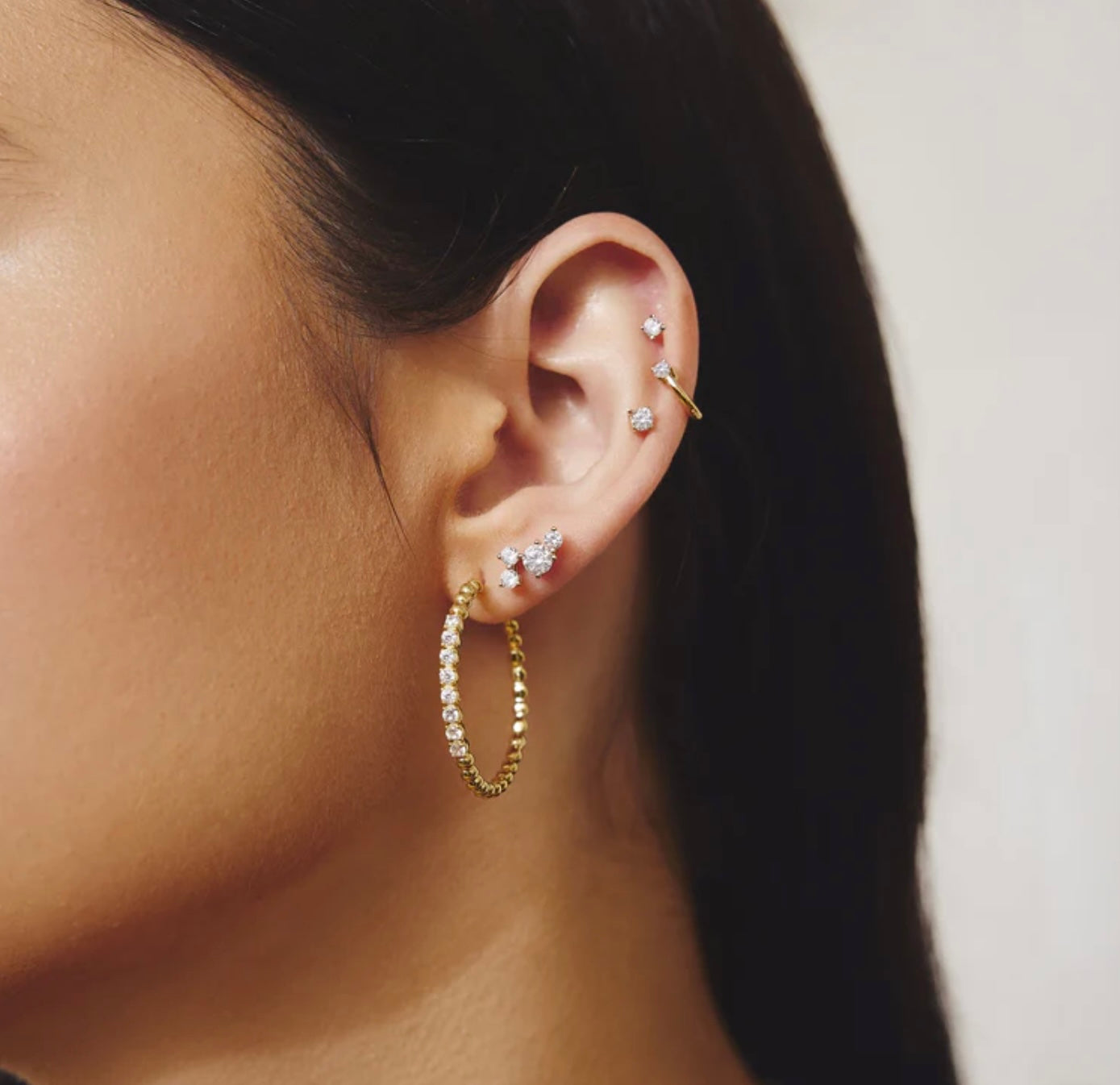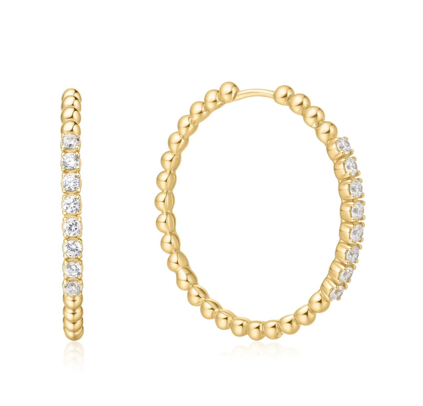Miss Dainty is designed for the woman who loves elegance with a touch of whimsy. This look embodies refined and understated luxury, reflecting inner grace. These shiny beaded hoops each feature a row of claw-set cubic zirconia, showcasing your exquisite taste and subtle sophistication. Perfect for mixing and matching with other earrings or wearing alone for a simple yet elegant statement.