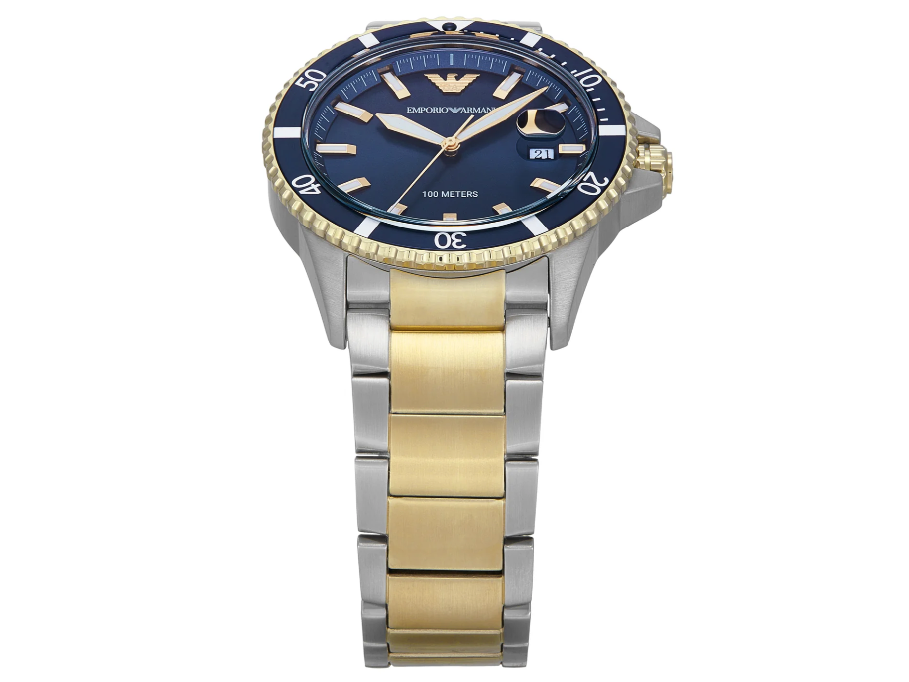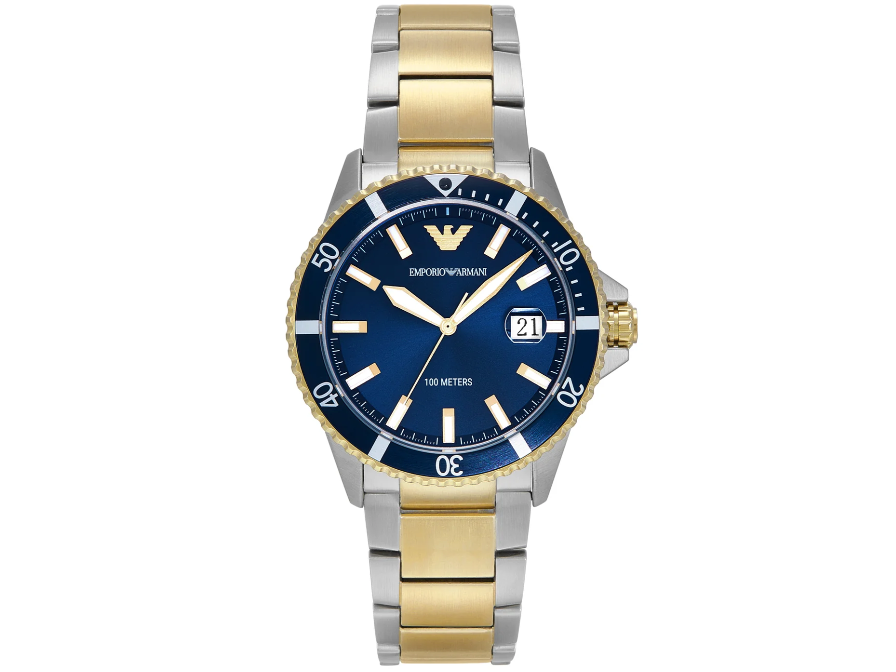 Discover the Emporio Armani World Explorer Three-Hand Blue Dial Stainless Steel Watch AR11682. With a stunning blue sunray dial and luminescent accents, this 42mm timepiece embodies sophistication and versatility. The durable mineral crystal and quartz movement make it perfect for the modern adventurer. The two-tone silver and gold bracelet adds elegance and comfort.