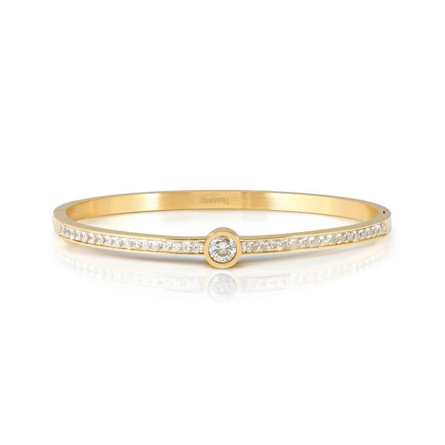 Stainless steel rigid bangle bracelet with yellow PVD colour coated finish and white Cubic Zirconia, available with central White or Pink Cubic Zirconia. Each bangle is hinged on one side and has a hidden fastening that snaps securely closed on the other. This bracelet makes a lovely gift for someone special in your life, your teenage daughter, your favourite niece, your younger sister. This gift is designed to show her how much she means to you and let her know she is always in your heart.