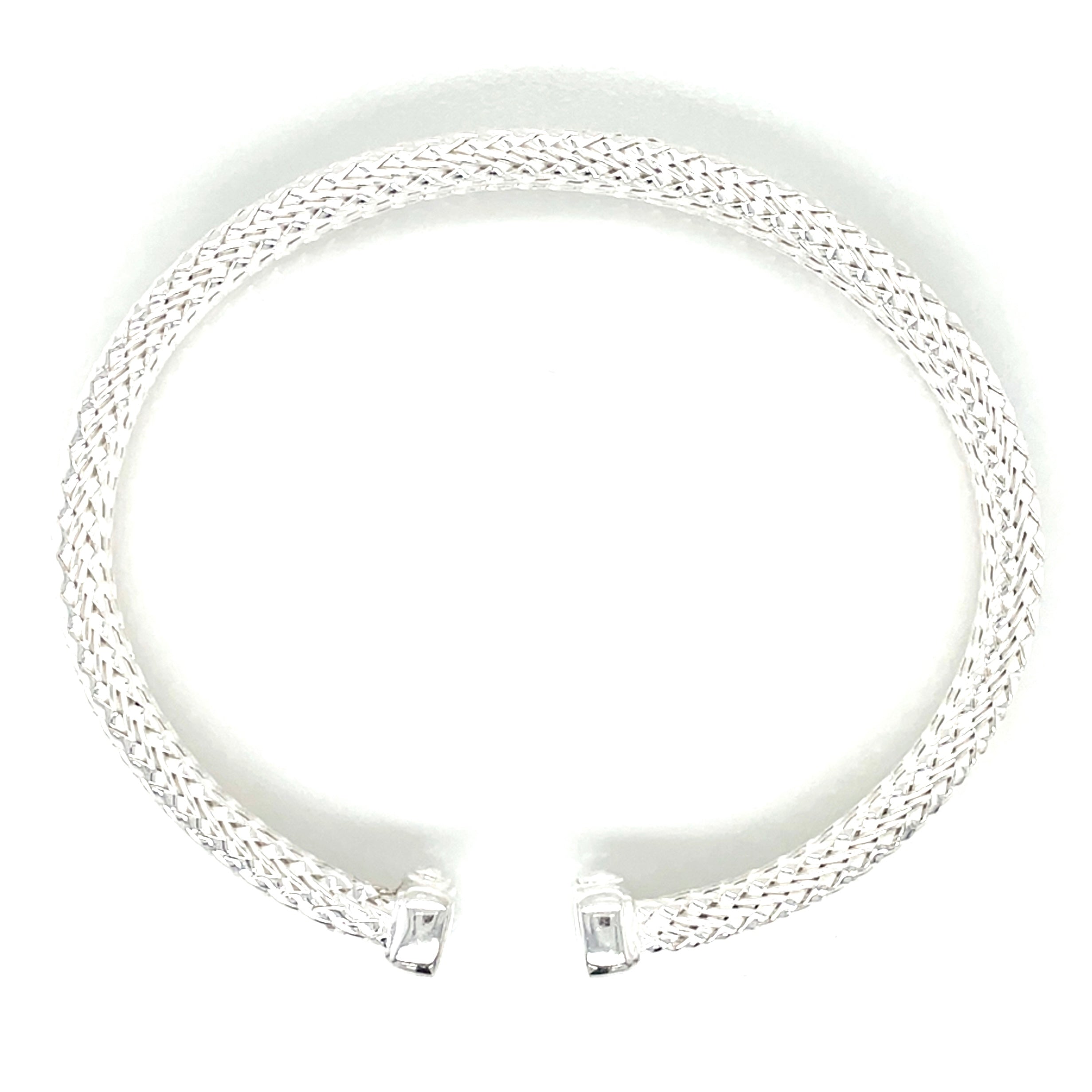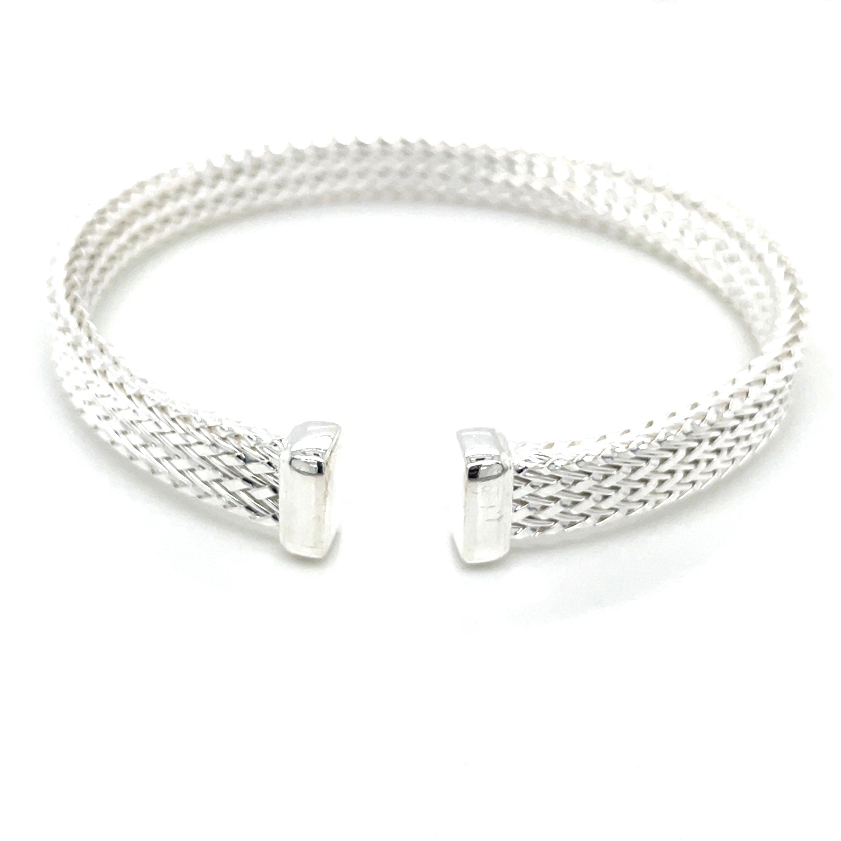 The Sterling Silver Woven Square Bangle features a unique woven design complemented by a robust stainless steel center. This combination results in a durable yet elegant accessory, providing both aesthetic appeal and structural integrity. The use of sterling silver ensures resistance to tarnishing, making it suitable for daily wear.
