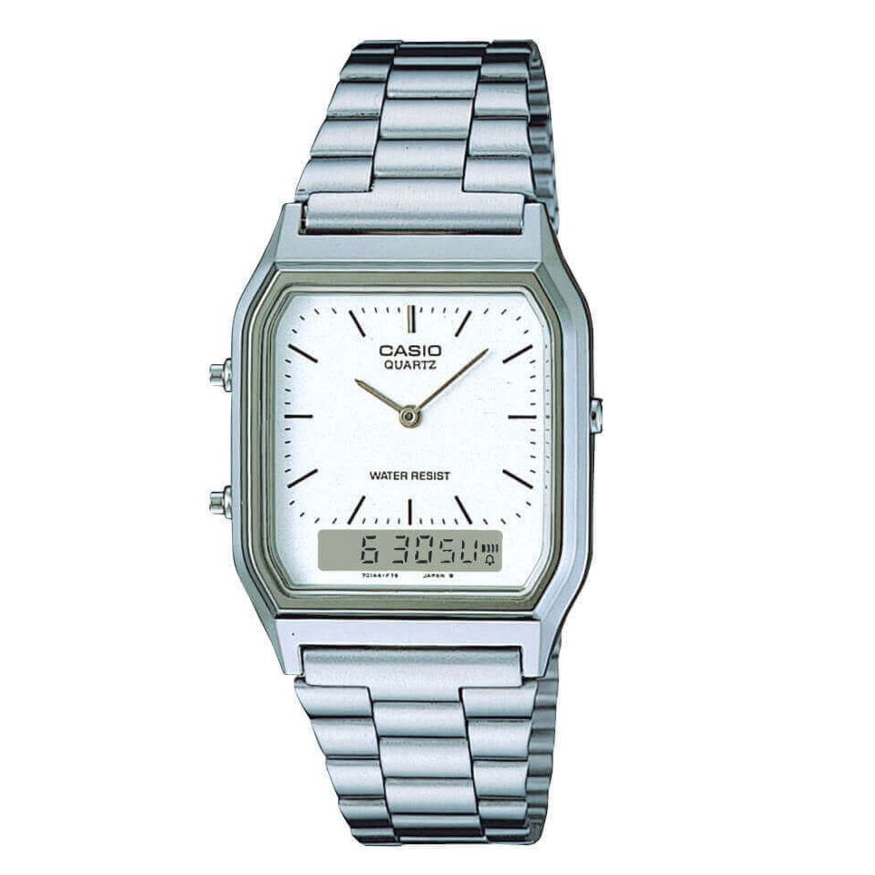 A stylish classic CASIO design, part of the Vintage collection, this timepiece features a digital and anologue display, dual time mode, a stopwatch and useful alarm. It is resistant to minor splashing and perfect for everyday wear. A silver coloured band completes the look.
