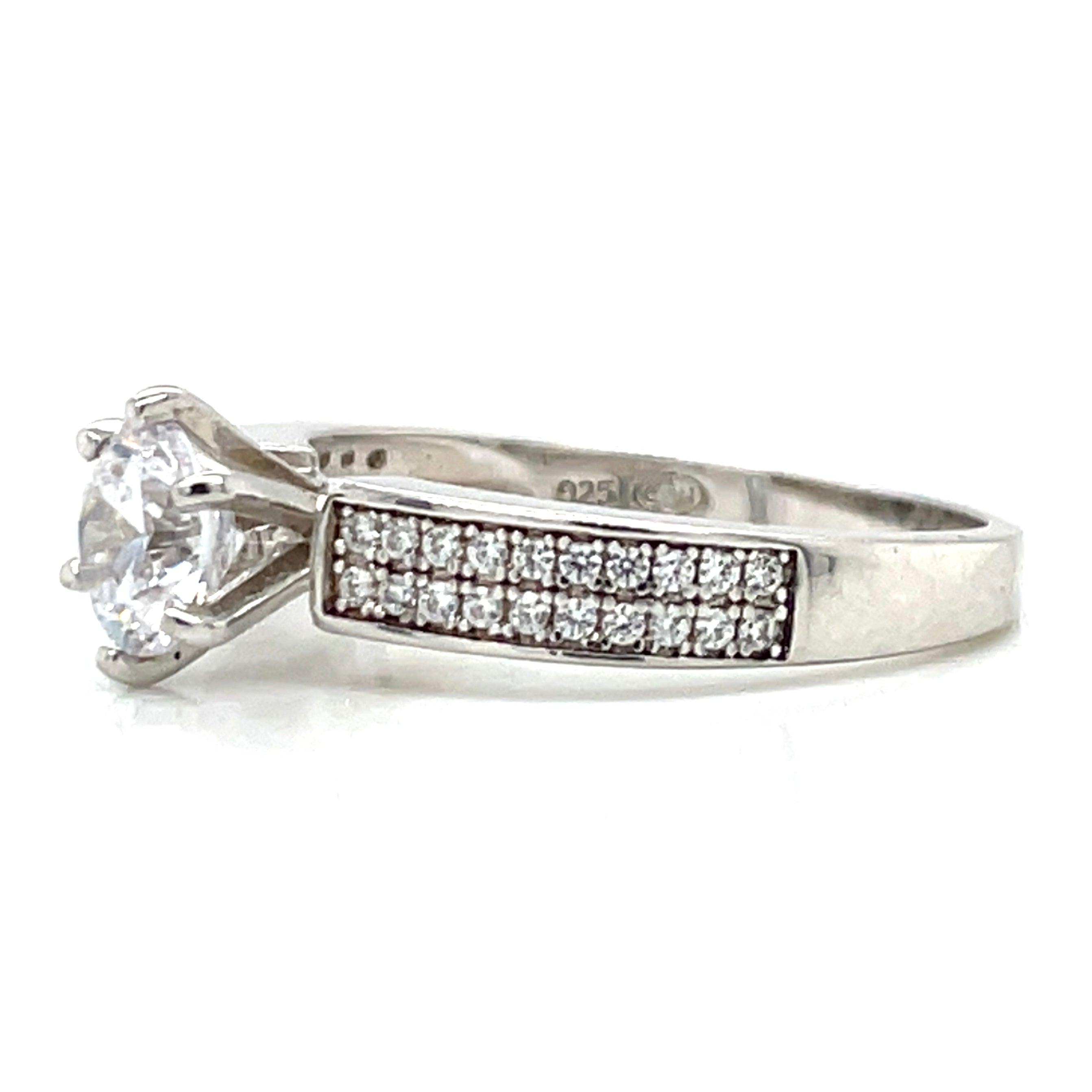 This sterling silver ring features a solitaire six claw cz