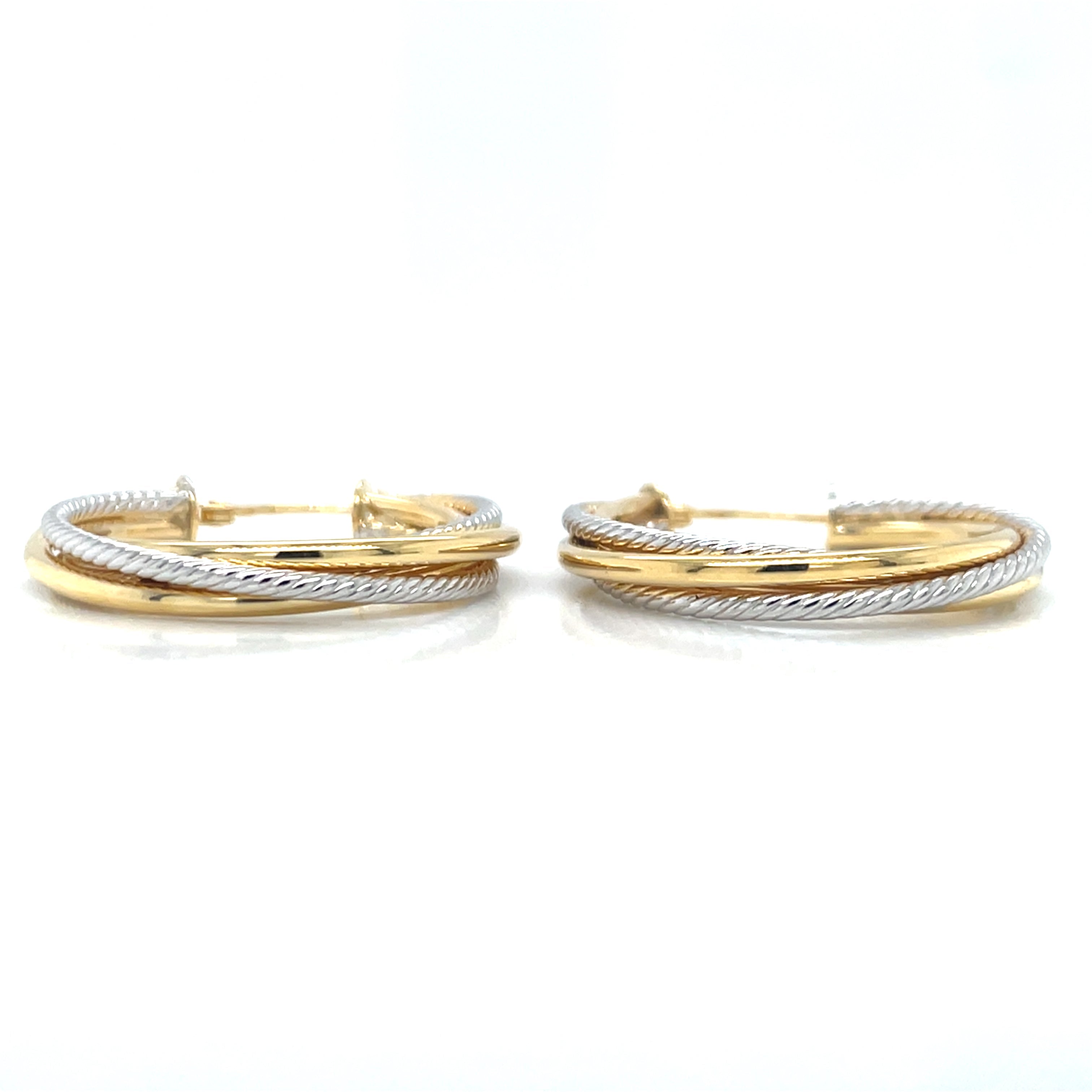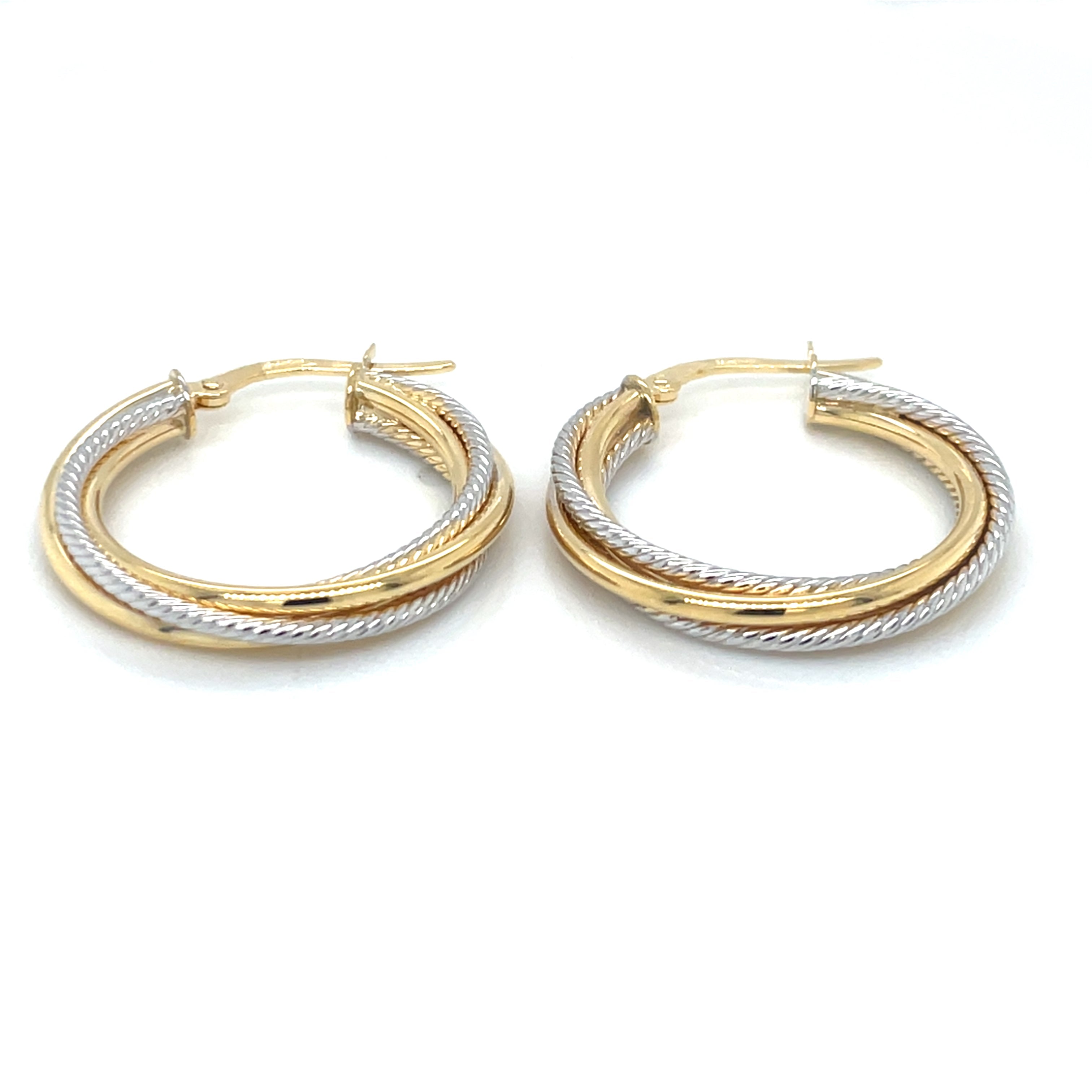 Upgrade your earring collection with these 9ct Gold Two Tone Textured Twist Hoop Earrings. Made from high quality materials, their unique textured design adds a touch of sophistication to any outfit. With an internal diameter of 2cm, they are perfect for everyday wear or special occasions. Elevate your style with these elegant earrings.