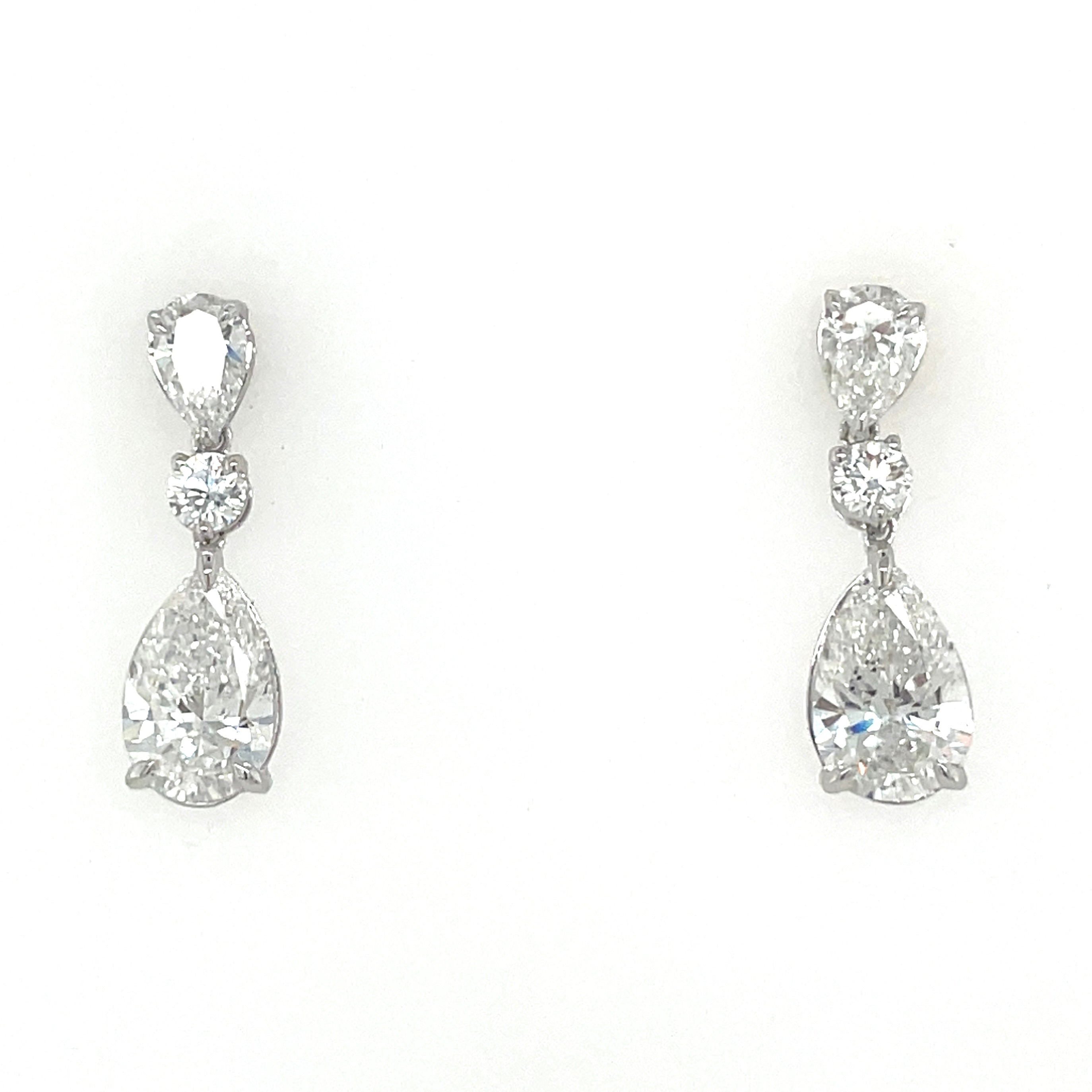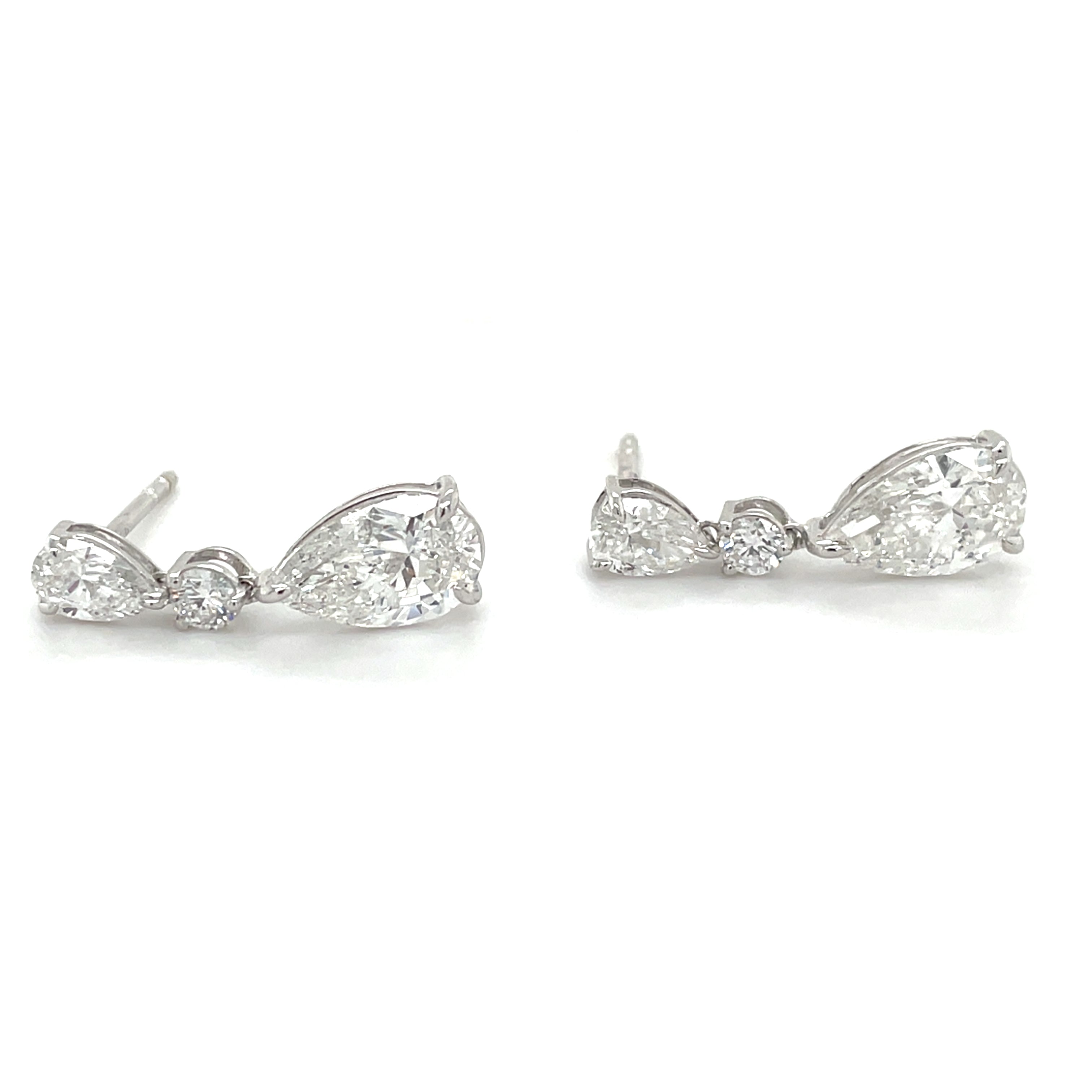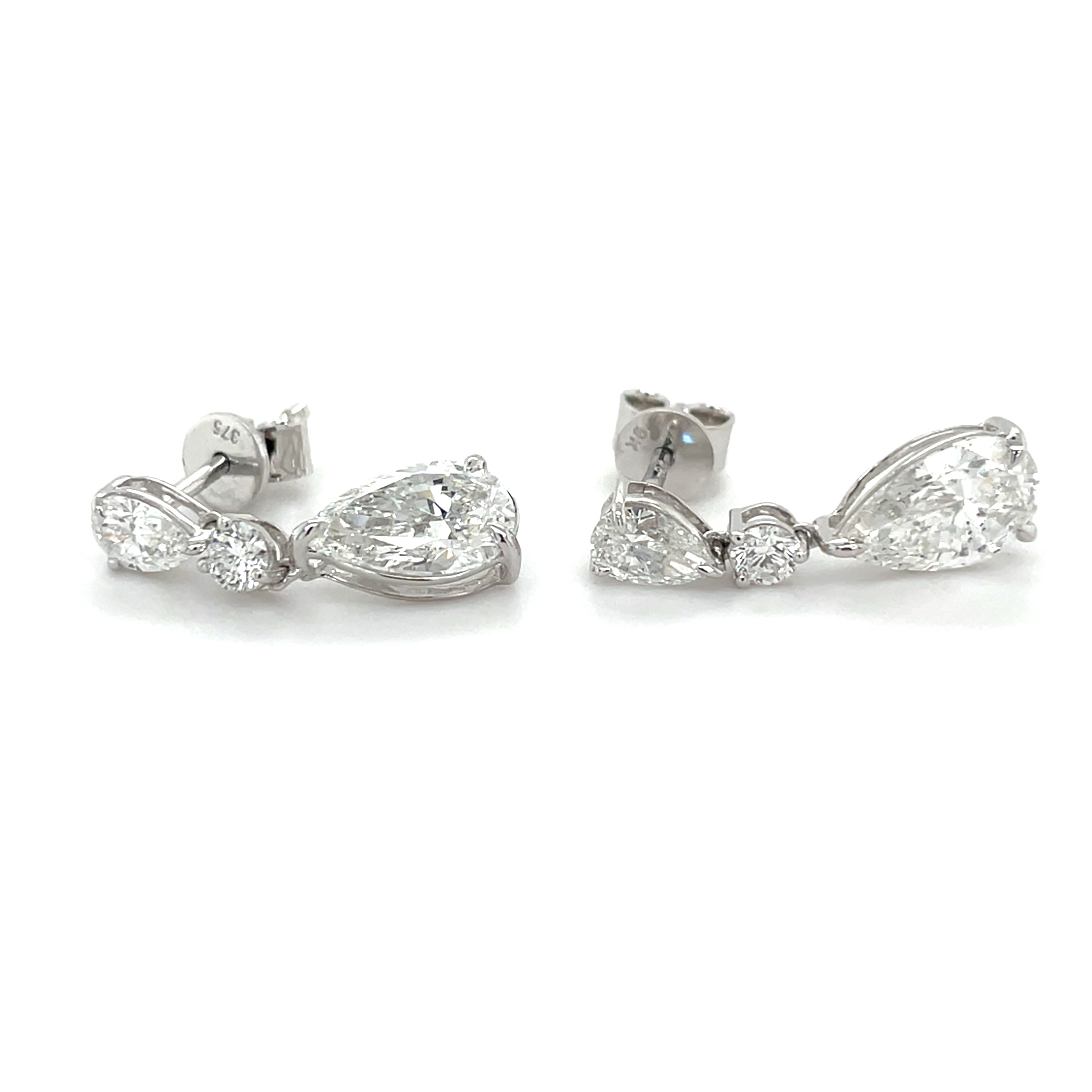9ct white gold pear and round diamond drop earrings featuring a total of 2.90ct laboratory grown diamond. The largest pear diamond is IGI certified with a carat weight of between 1.05ct - 1.18ct.