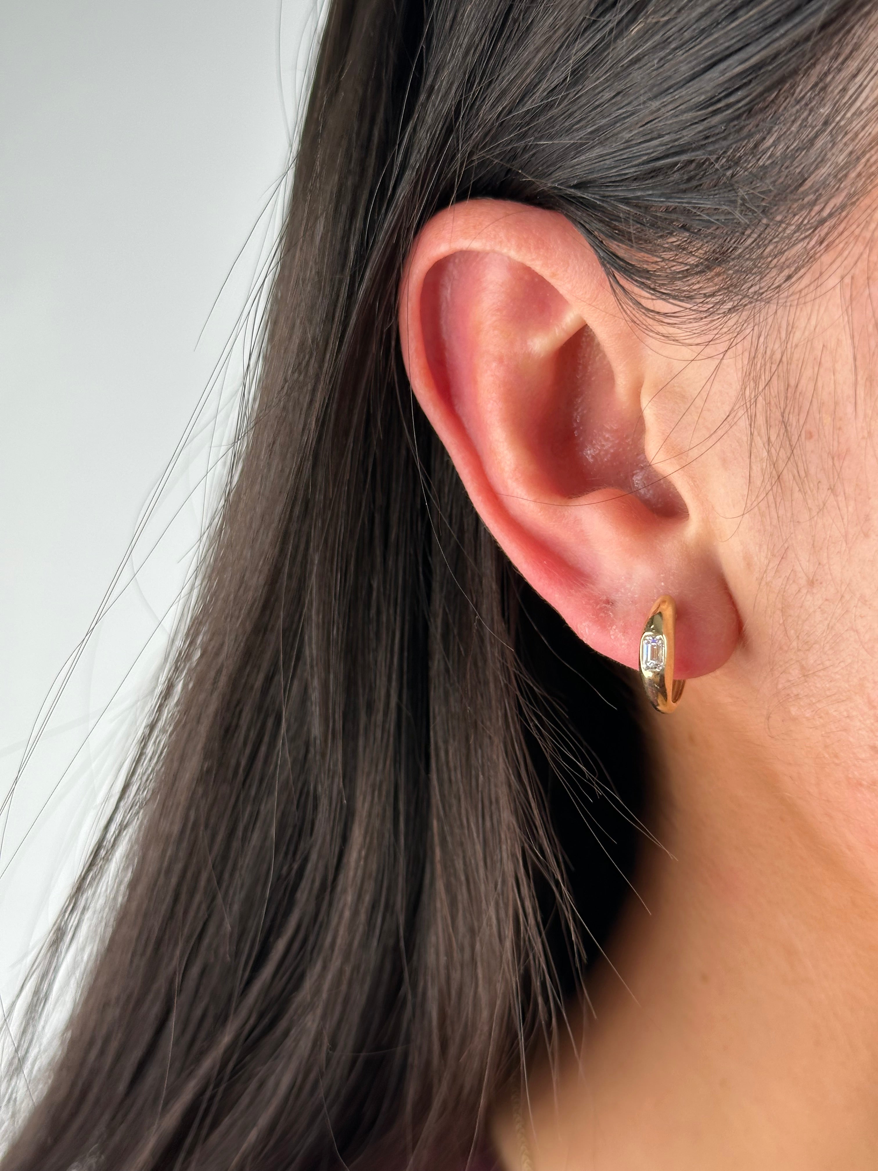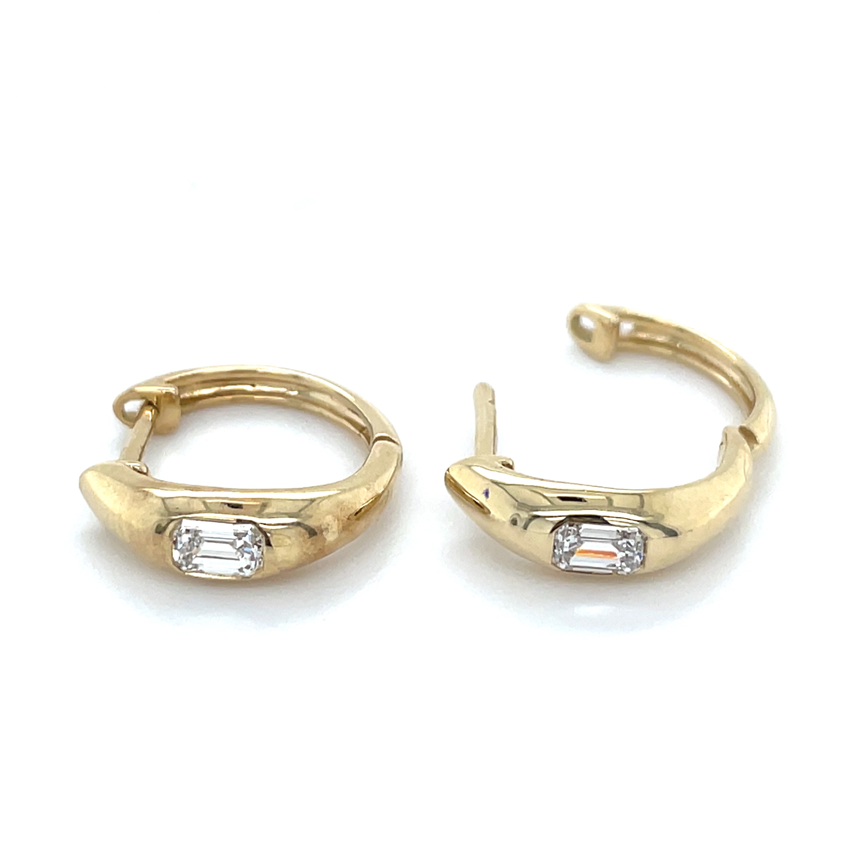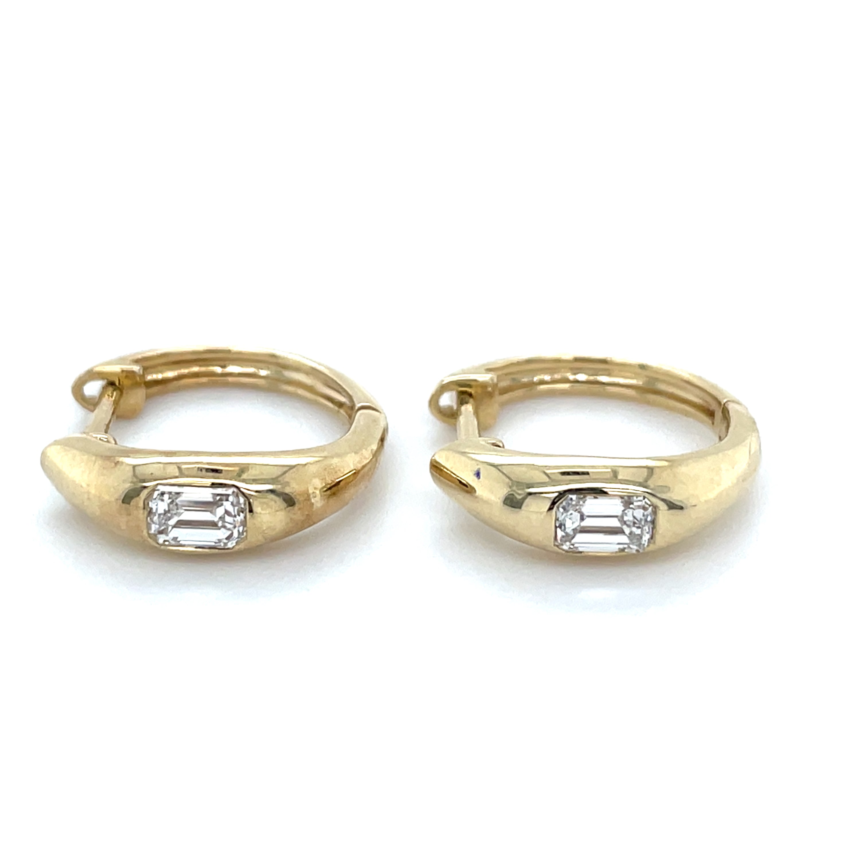 Consider these elegant 9ct yellow gold earrings, boasting crisp emerald cut laboratory grown diamonds totaling 0.46ct. With a modern touch, each stone is expertly bezel set, offering a secure and stylish accessory. Introduce a touch of sophistication to your attire with these dazzling hoop earrings.