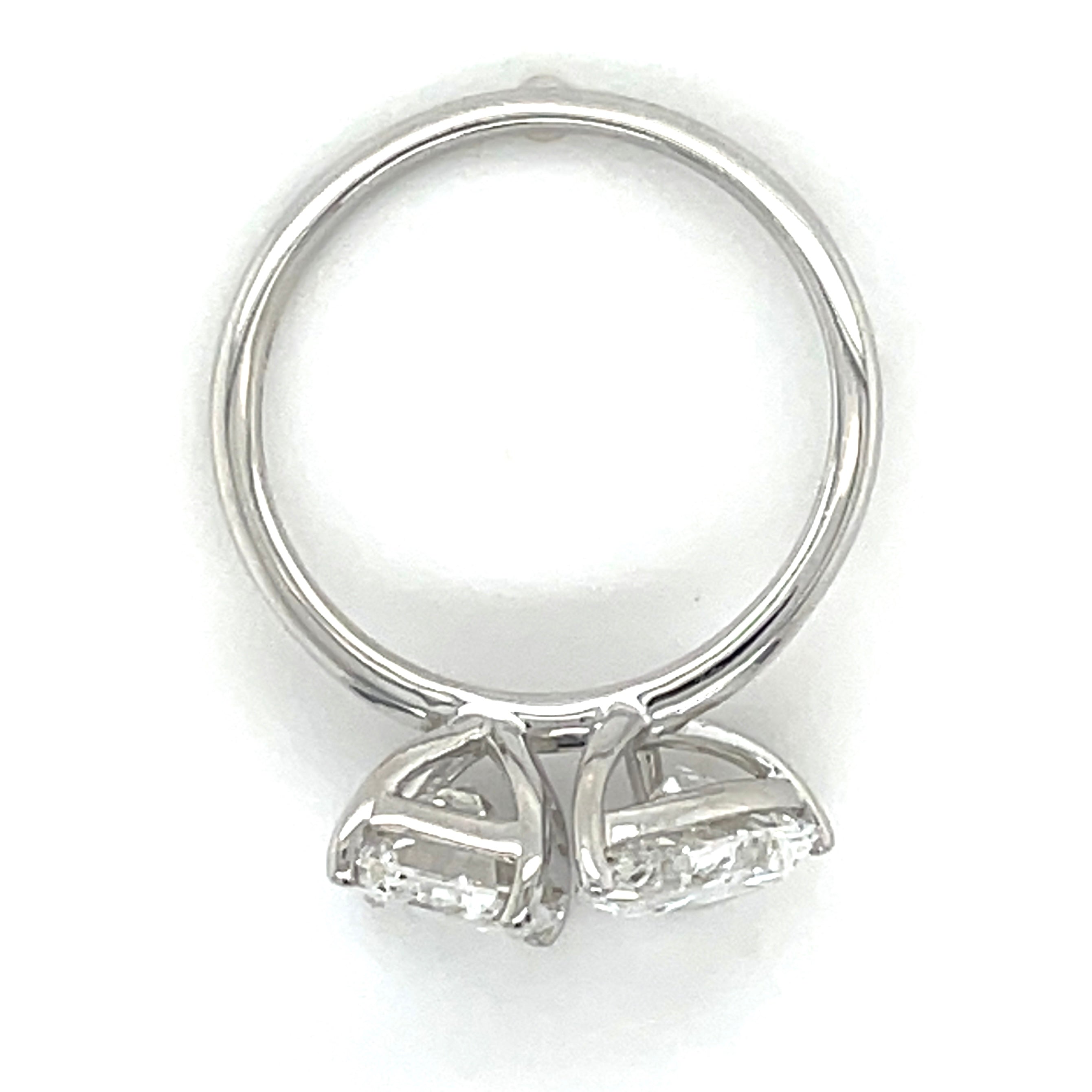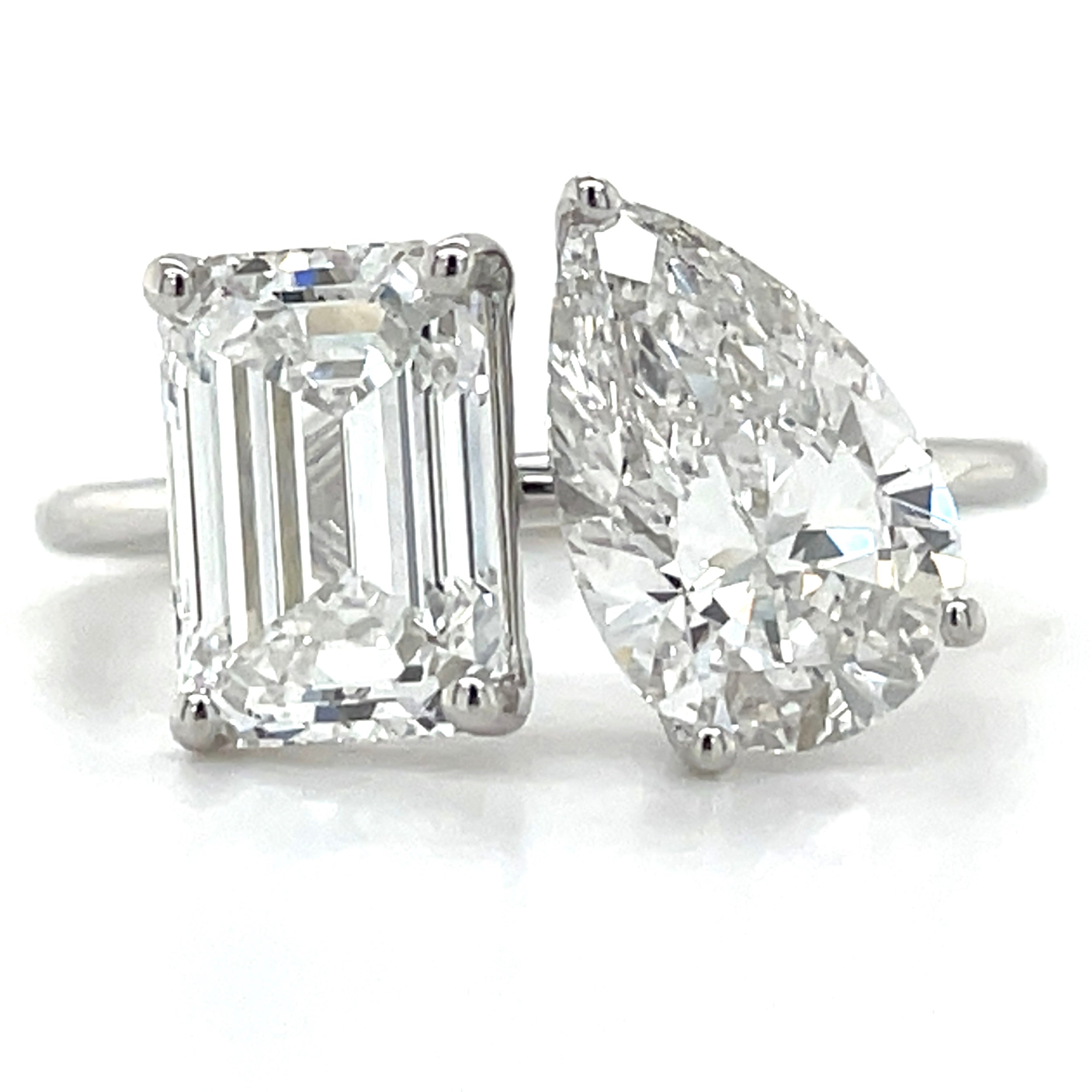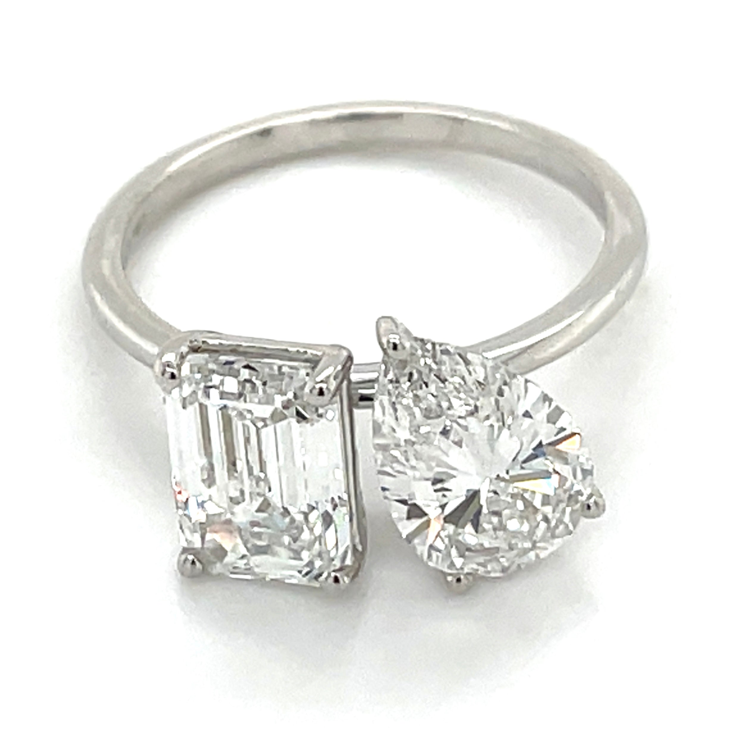 Crafted from 14ct white gold, this showstopping ring features a 1.55ct laboratory grown pear cut diamond and a 1.83ct laboratory grown emerald cut diamond, with a total weight of 3.38ct. The timeless toi et moi design represents a deep connection between two individuals, making it the perfect symbol of everlasting love and commitment. Both stones are IGI Certified with the following:
