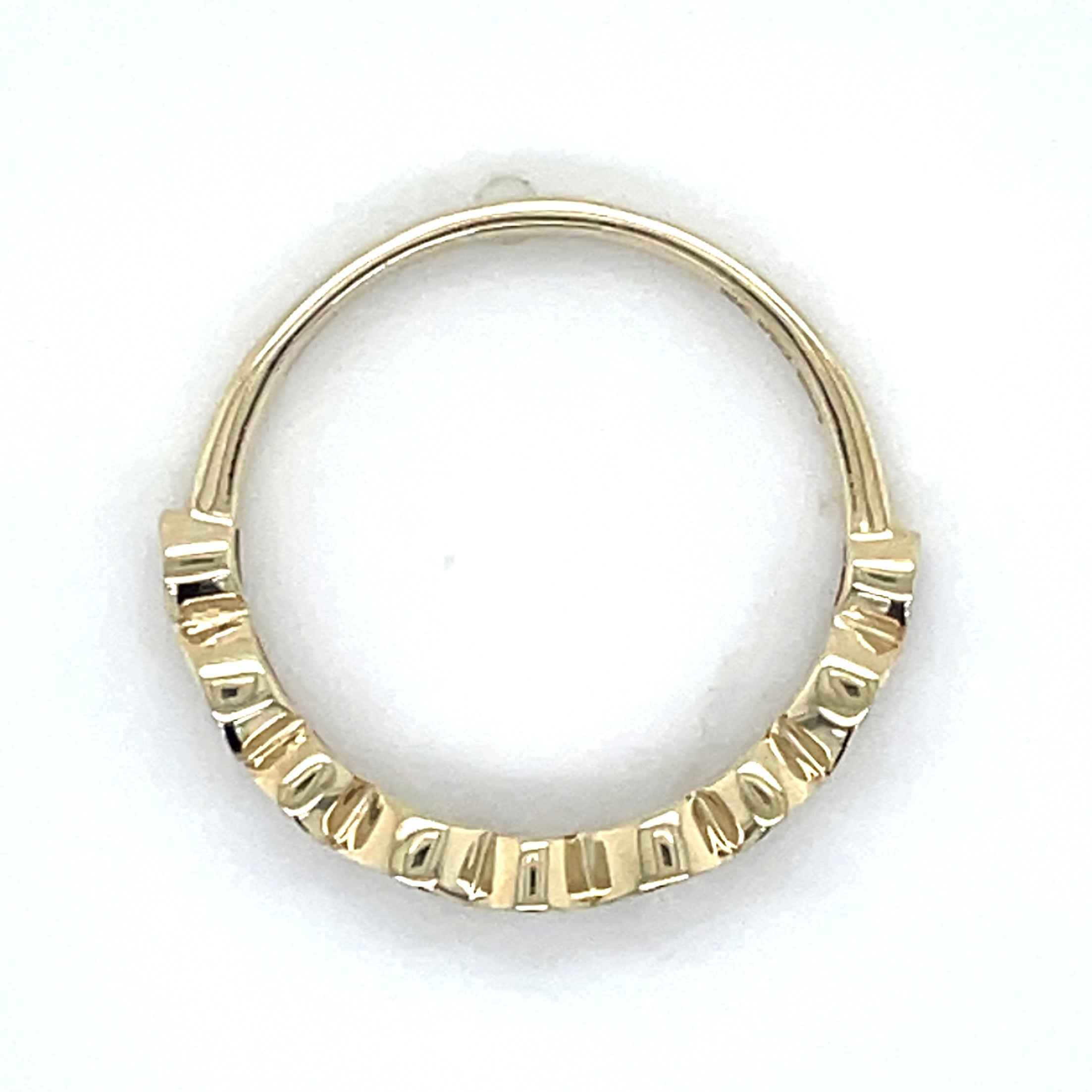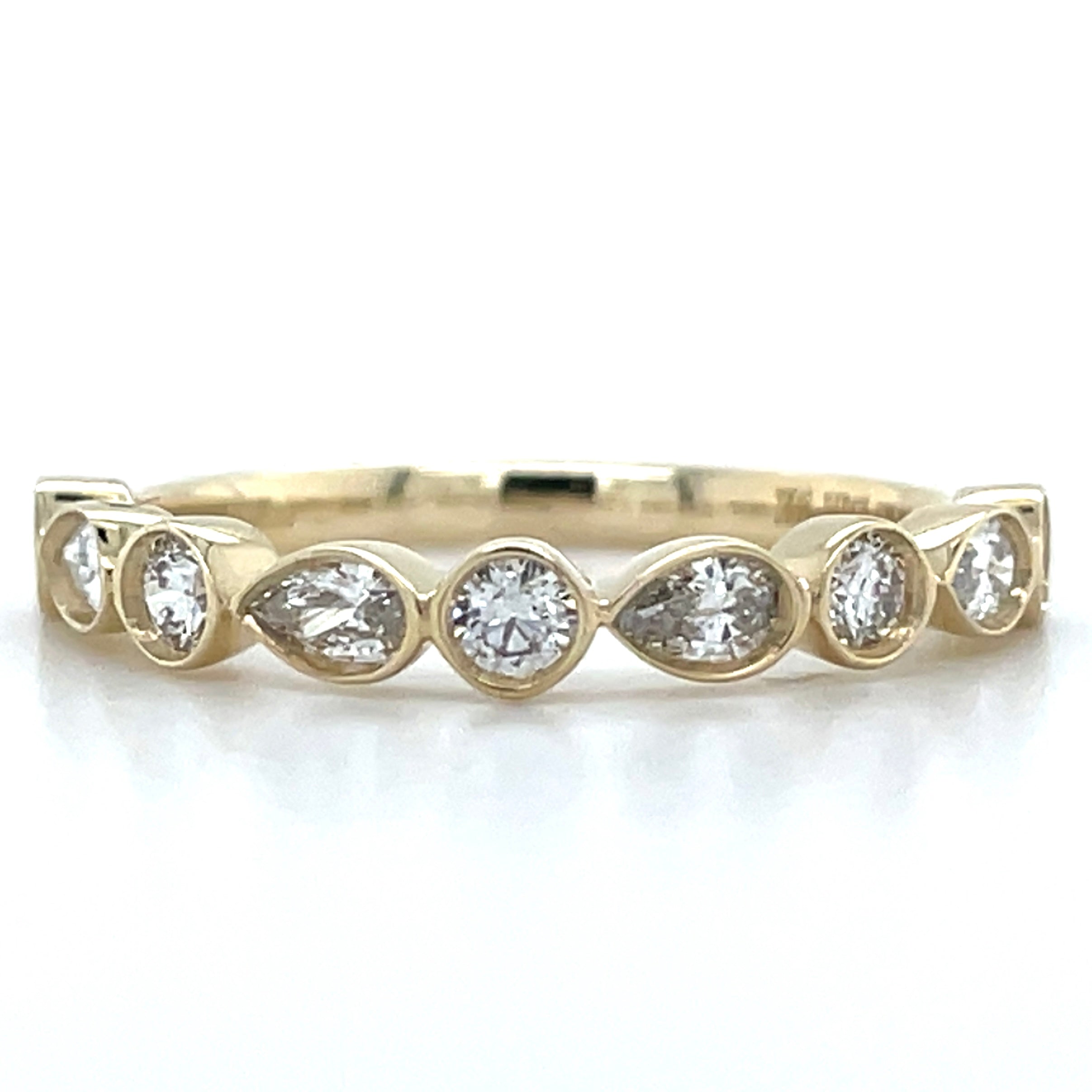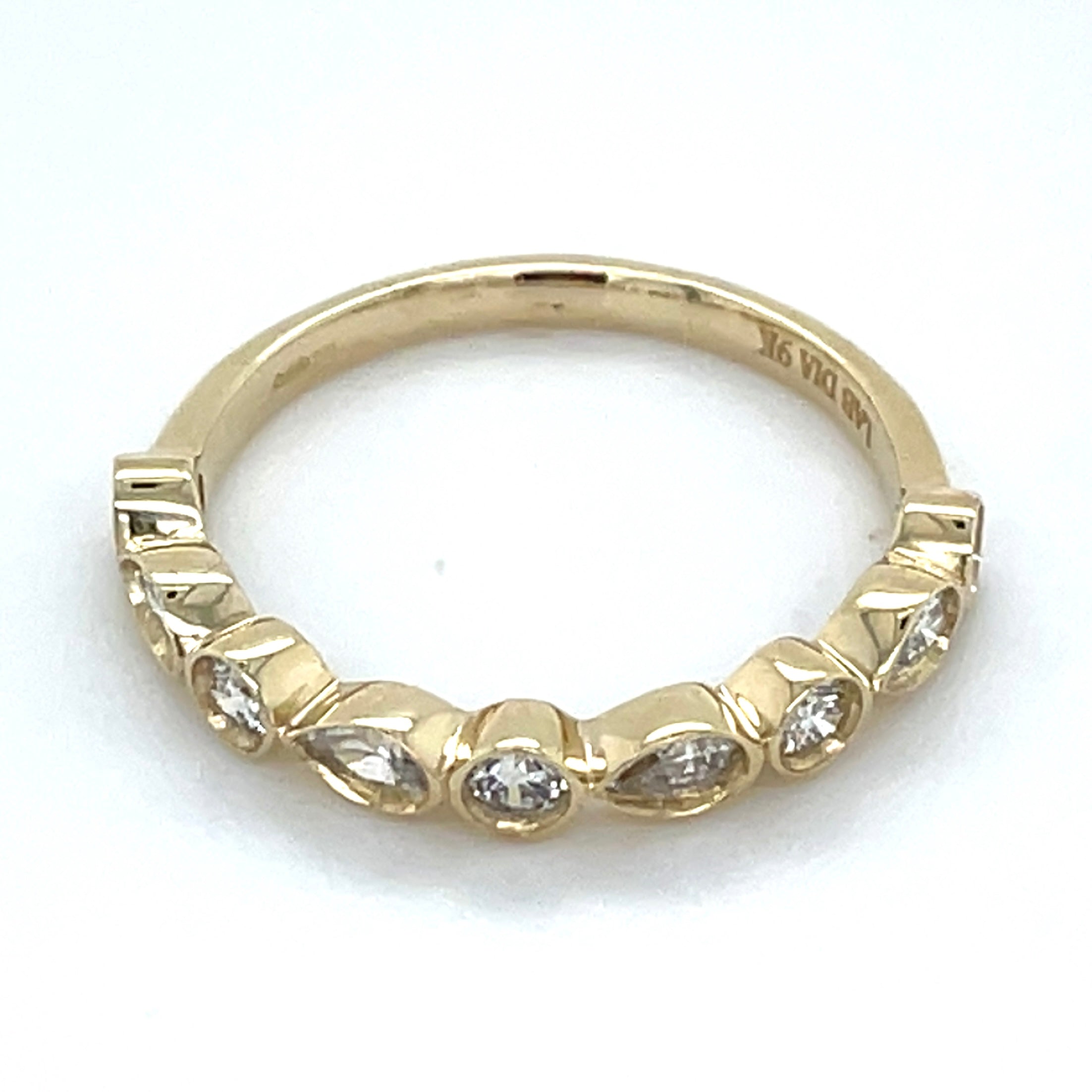This elegant 9ct yellow gold ring features a stunning arrangement of round and pear-shaped diamonds in secure bezel settings, creating a sophisticated mixed-cut design along the band. With VS clarity stones totalling 0.50ct, this piece combines timeless style with exceptional sparkle and durability.