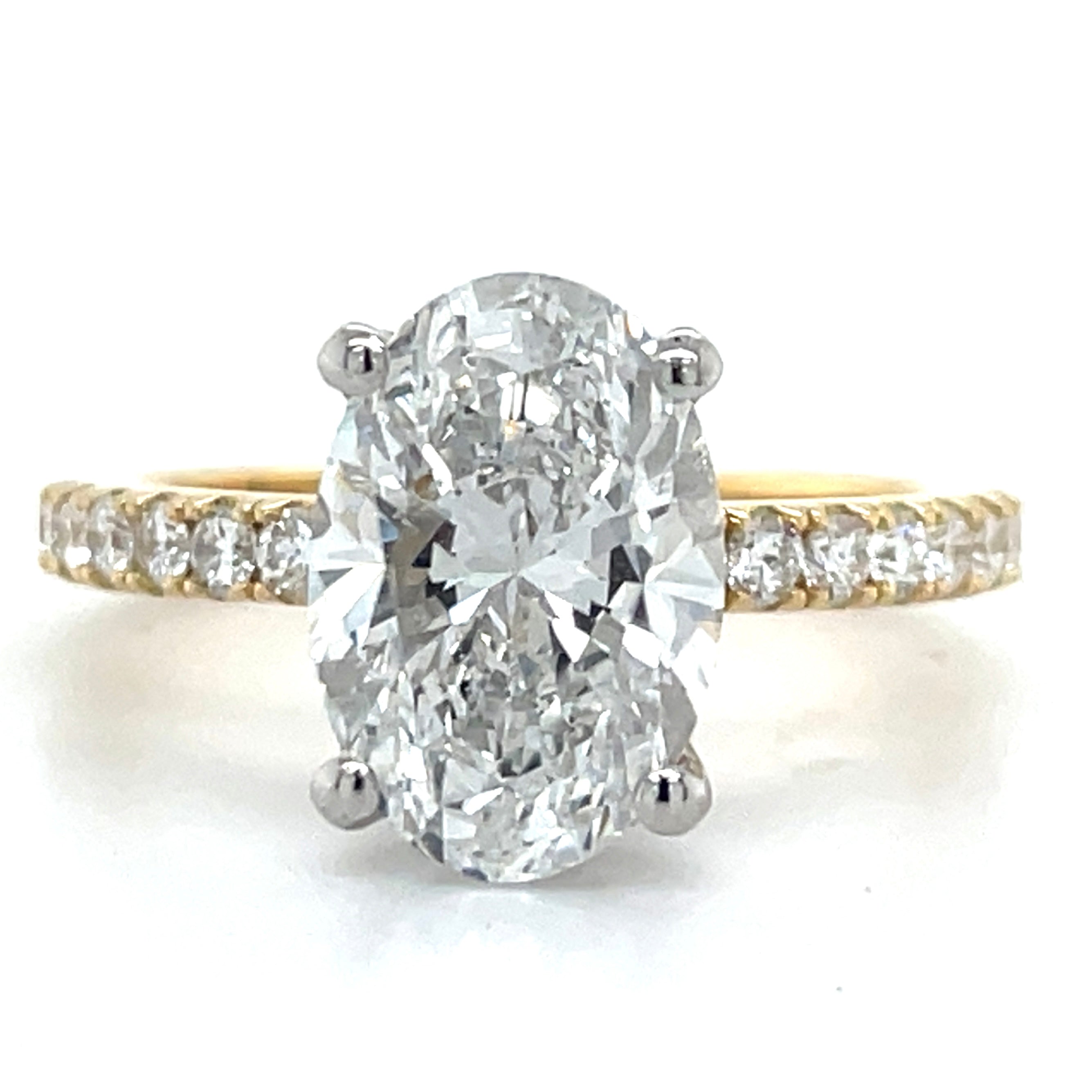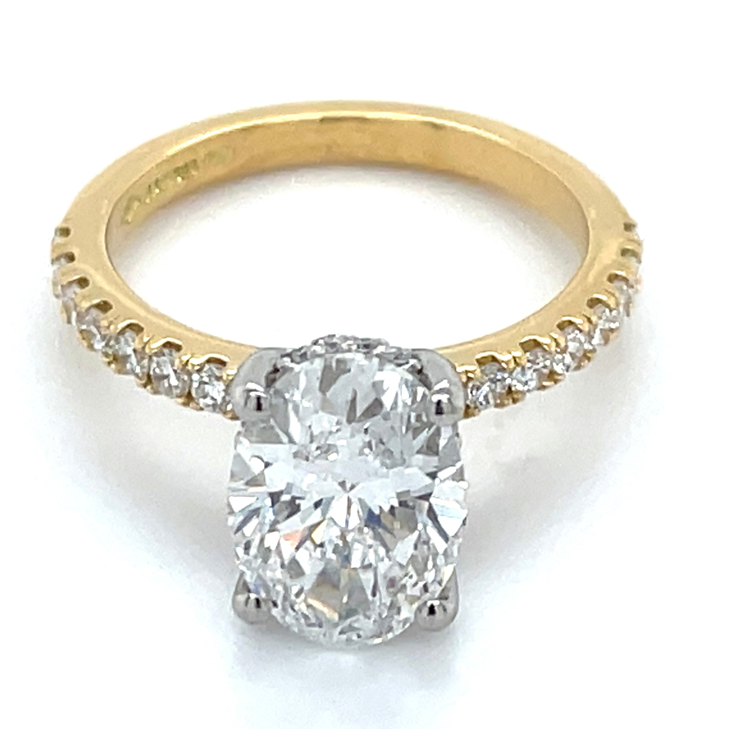 Expertly crafted with laboratory grown 18ct yellow gold and platinum head, this solitaire ring boasts a stunning 2.55ct / 2.56ct oval diamond. A hidden halo of diamonds enhances the center stone, while the castle set shoulders add a touch of elegance. The perfect blend of modern technology and traditional design, this ring is truly one-of-a-kind.