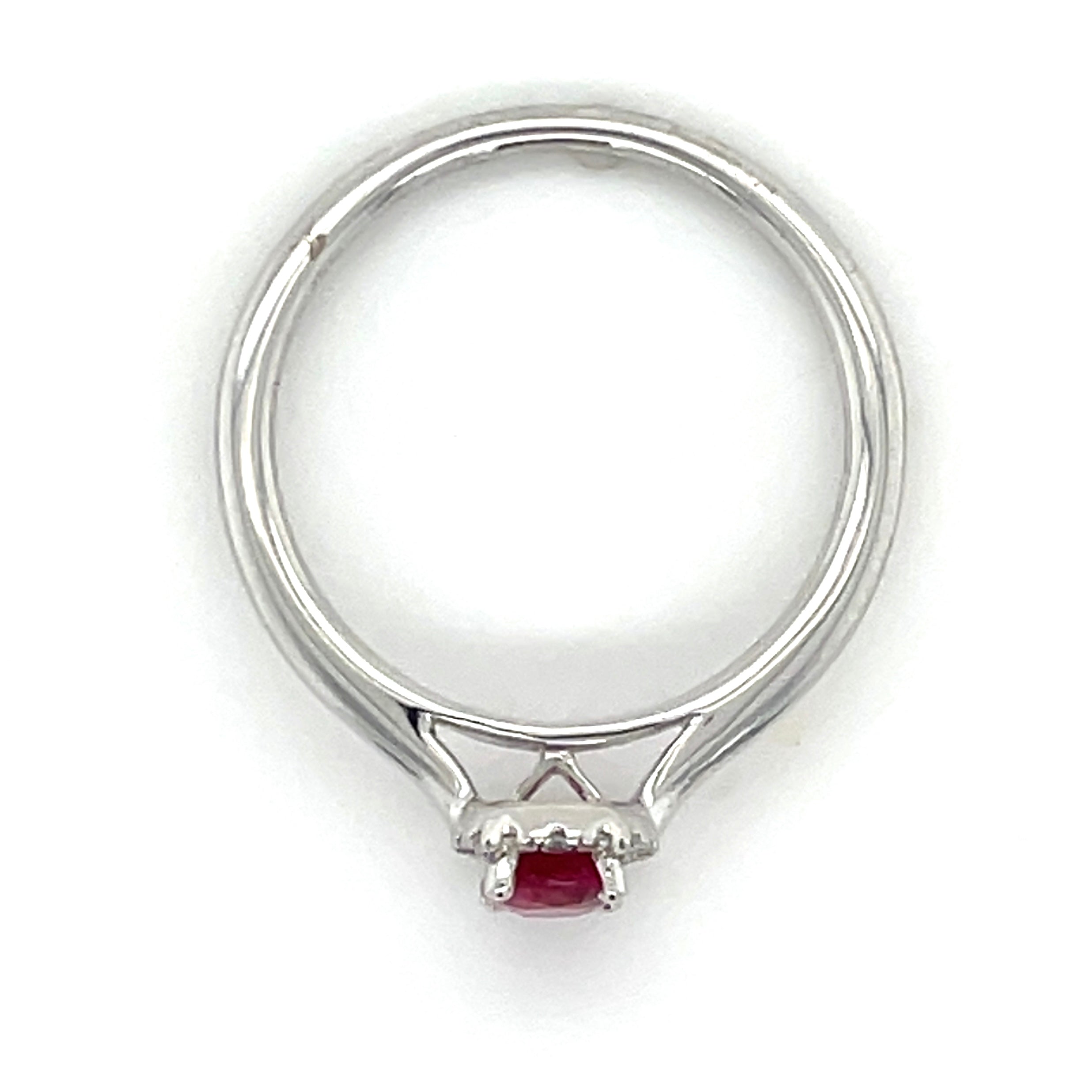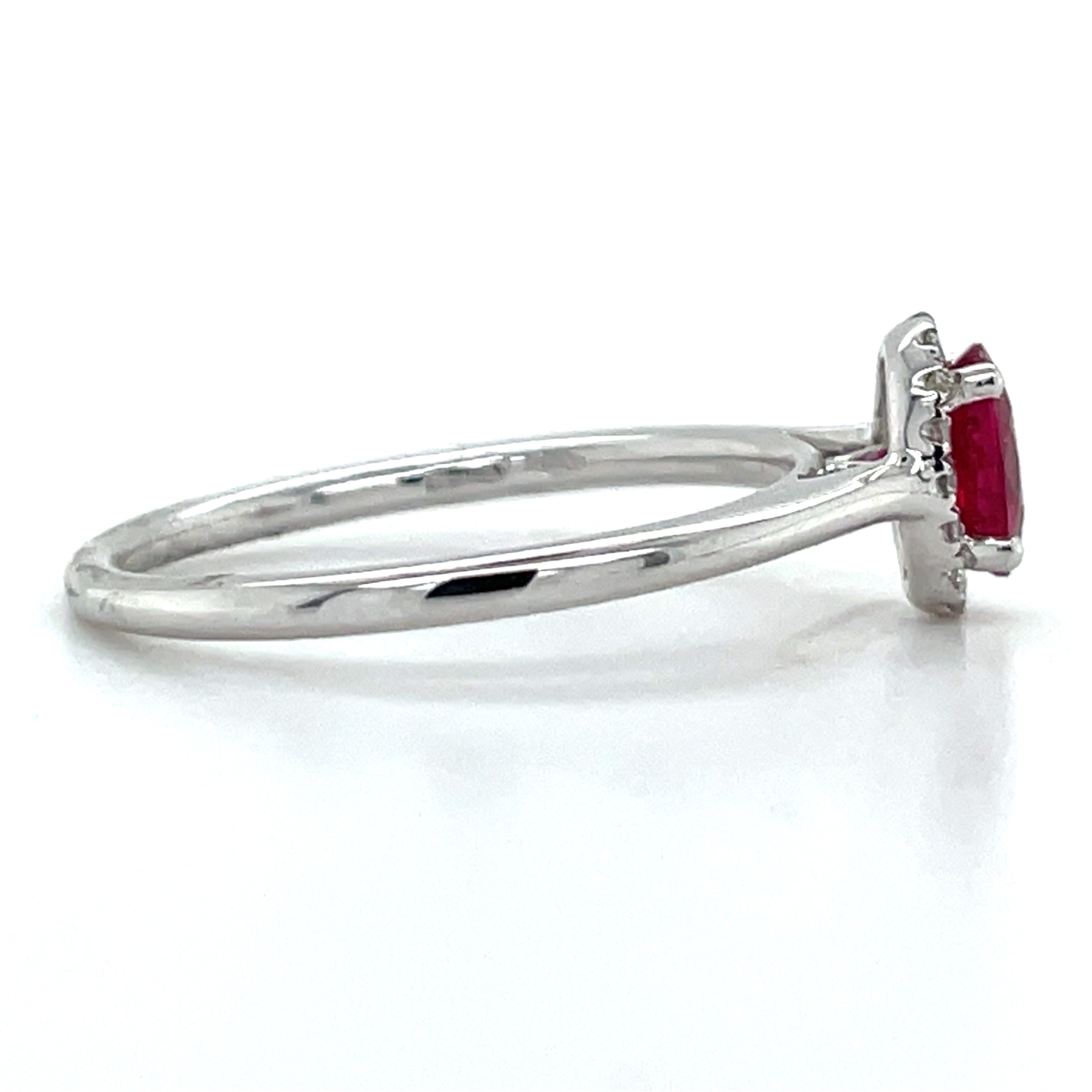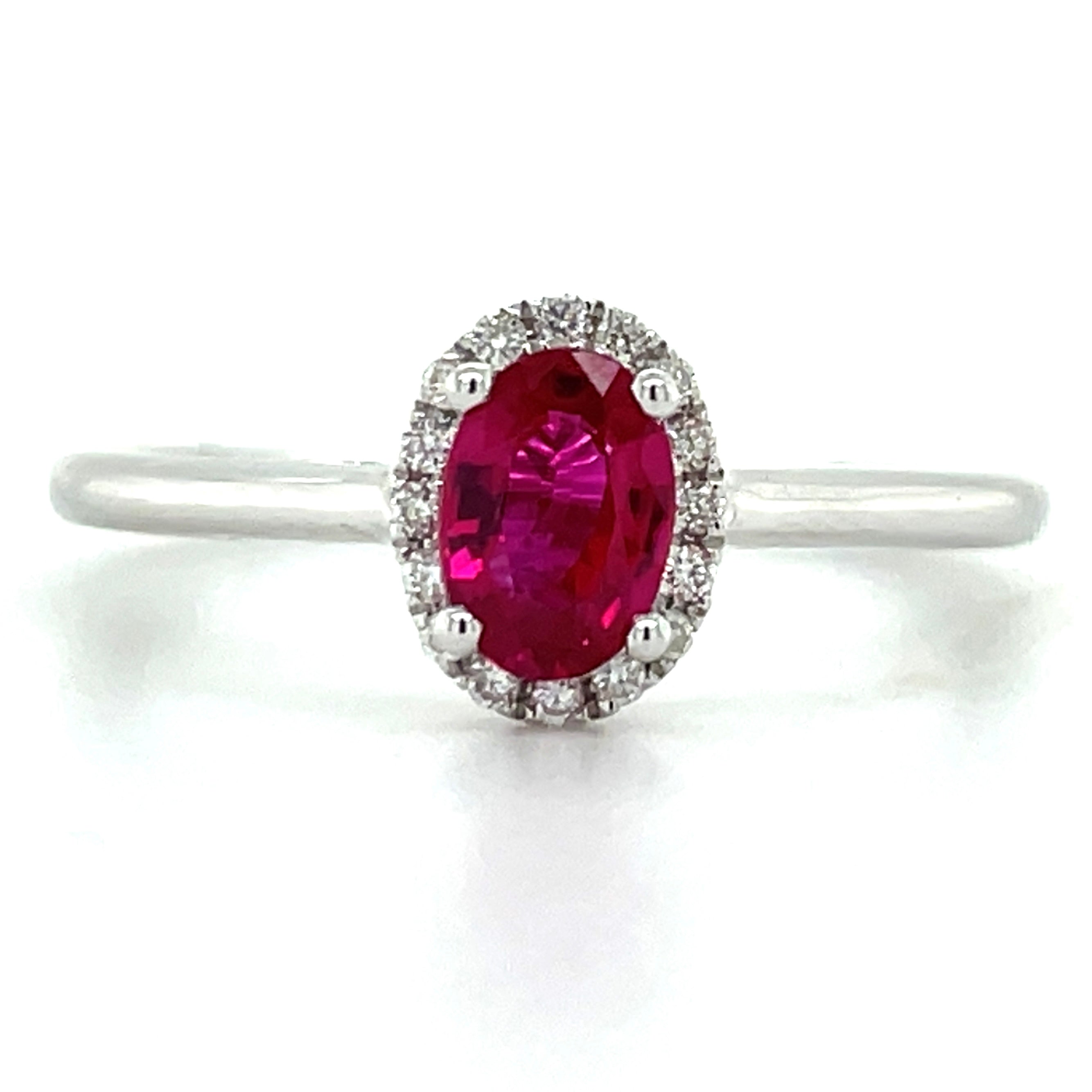 This Stunning Ring Features A 0.63ct Oval Ruby Surrounded By 0.08ct Diamond HAlo Set In 18ct WHite Gold