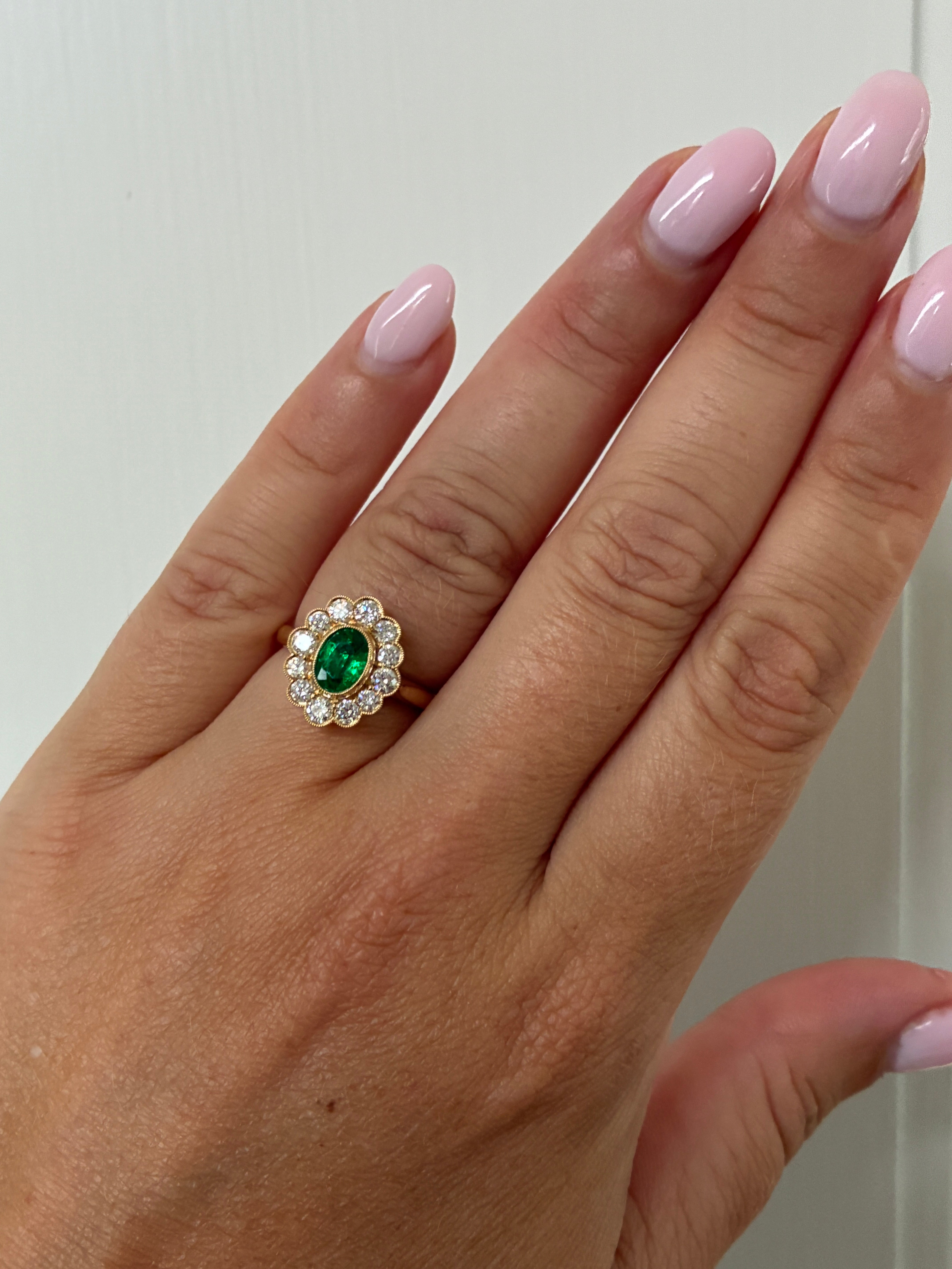 A stunning ring of class and elegance to be worn with pride. This beautiful ring is made from 18ct yellow gold and set with a single emerald that has been oval cut with a weight of between 0.62ct and 0.76ct and twelve beautiful round diamonds supporting it in a floral halo style. This diamonds have a total diamond weight of 0.69ct.