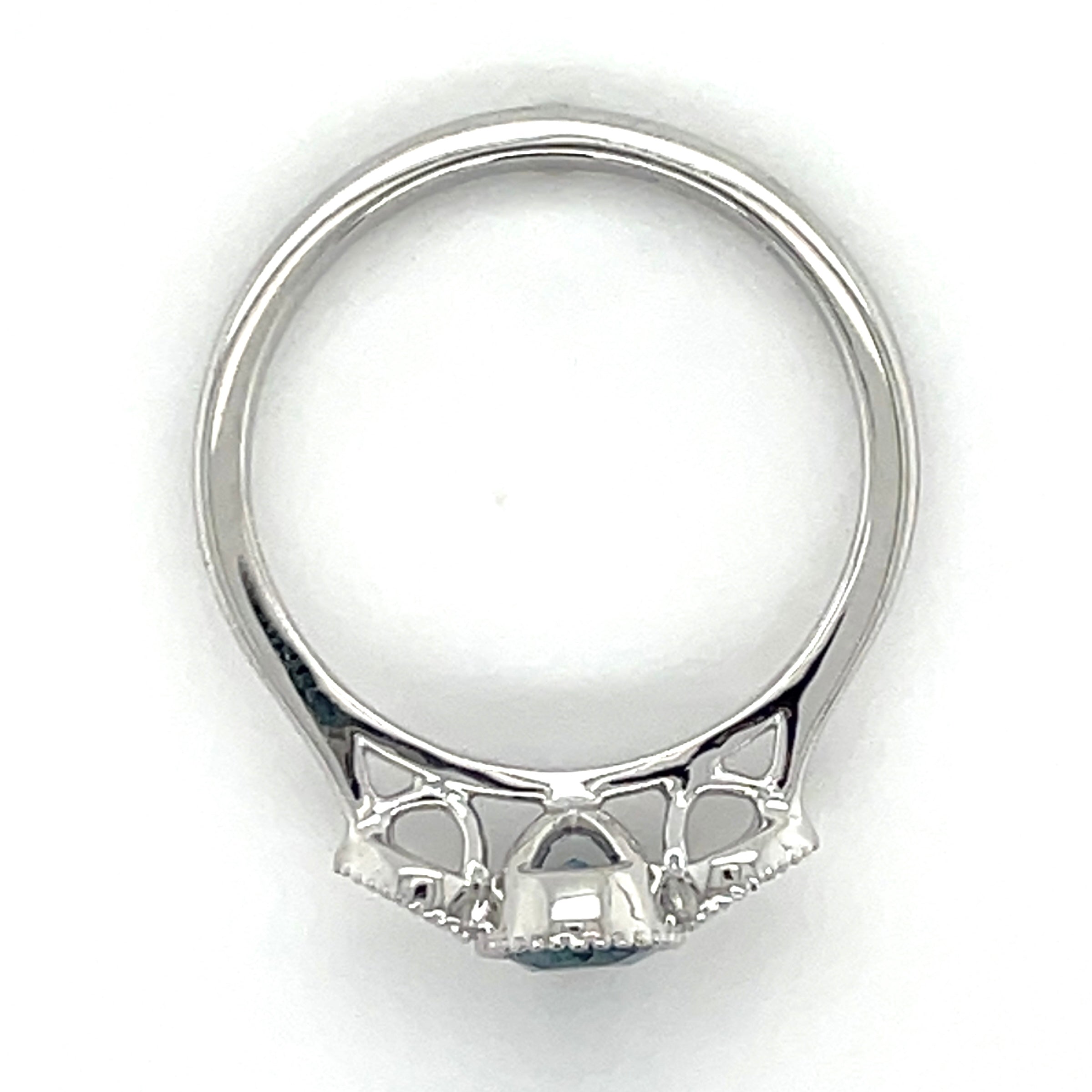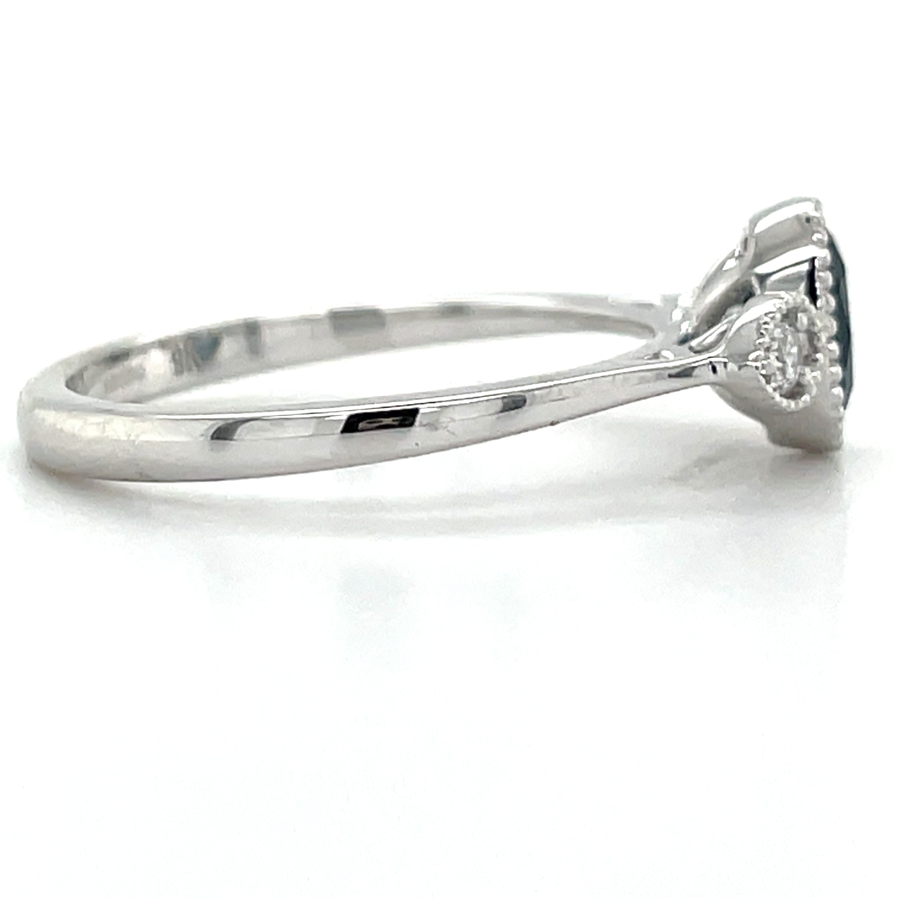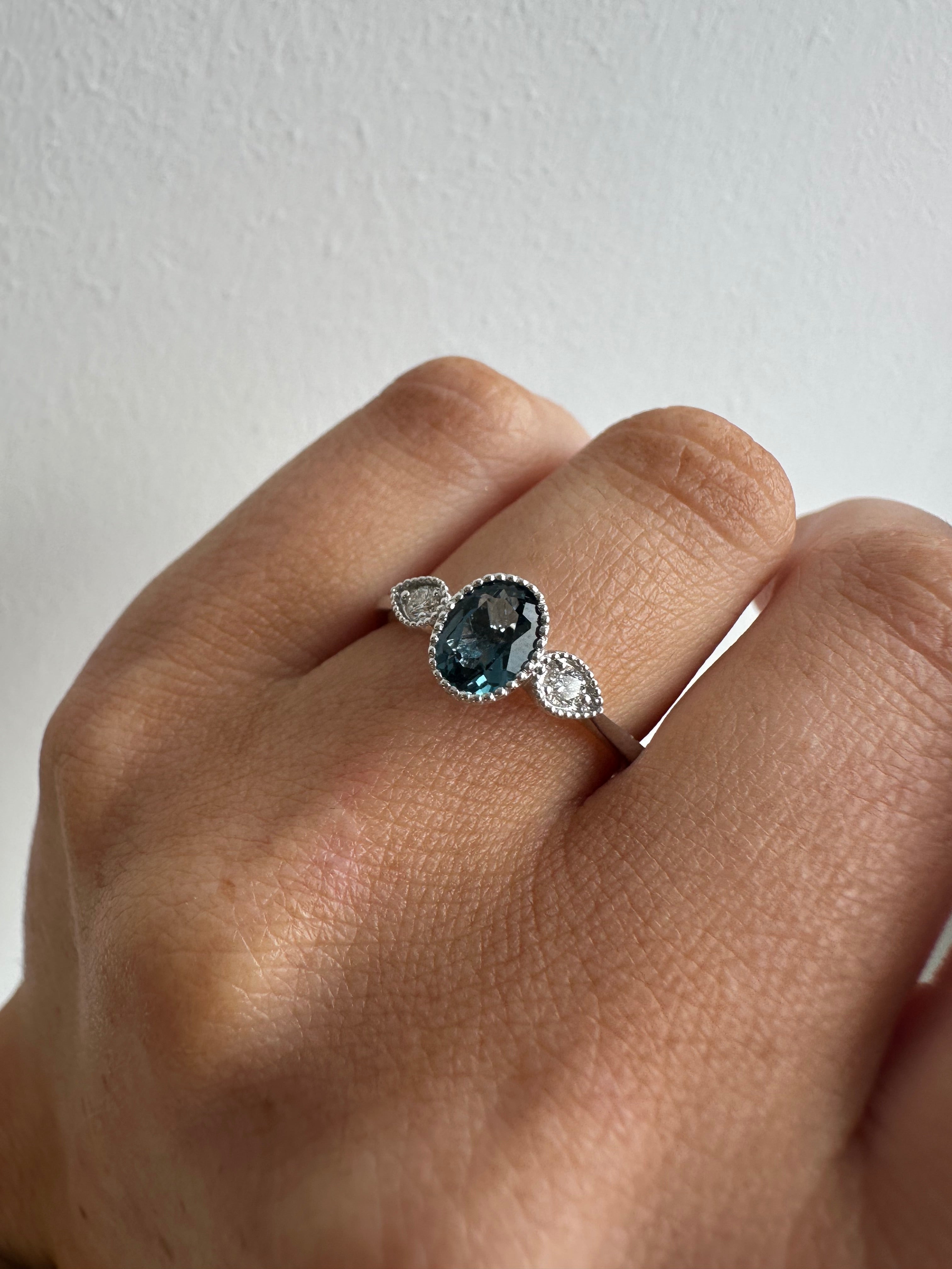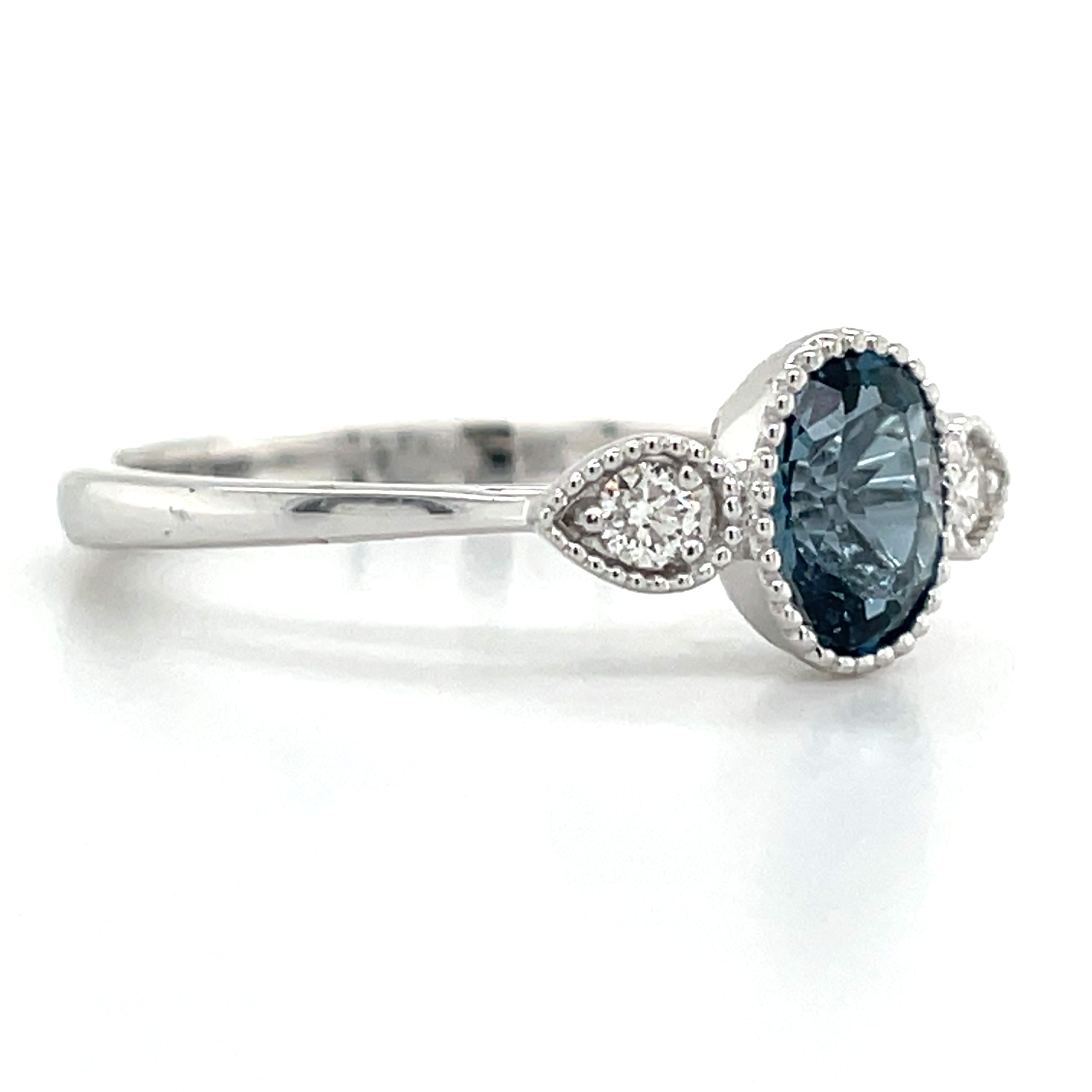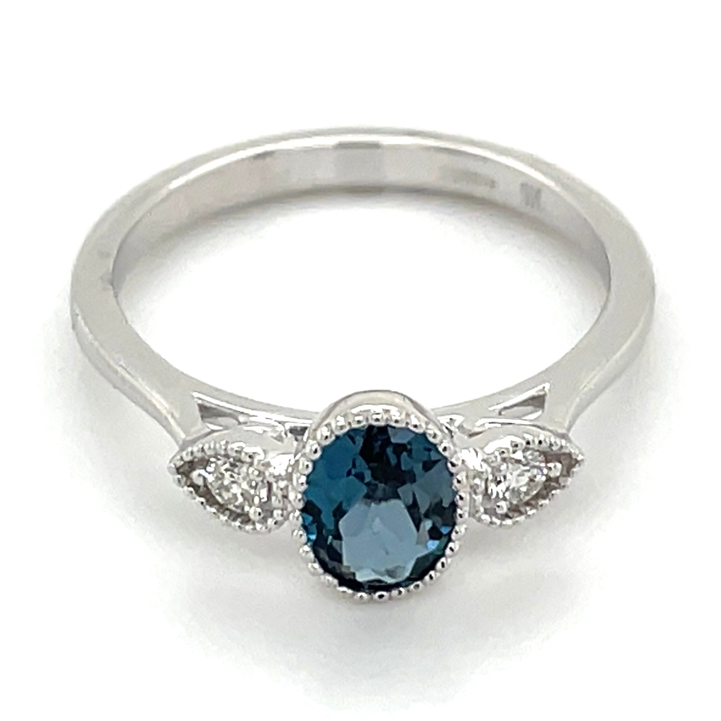 This exquisite 9ct white gold ring features an earth-grown 0.83ct london blue topaz, expertly bezel set within a milgrain-edged frame, enhancing its vintage Deco-inspired elegance. Accented by 0.10ct of sparkling diamonds, this piece combines refined craftsmanship with timeless design, making it a distinguished choice for those who appreciate intricate detail and lasting beauty.