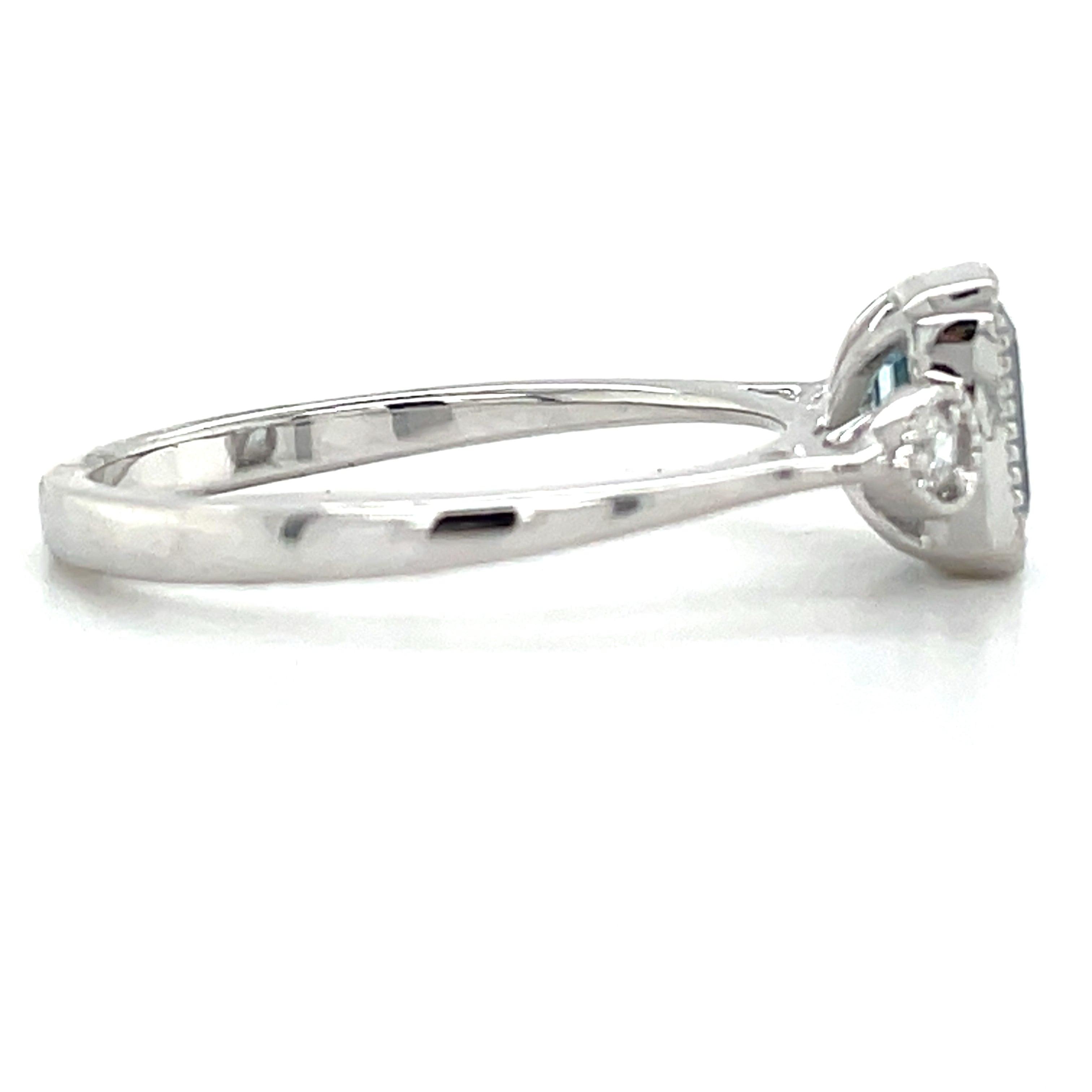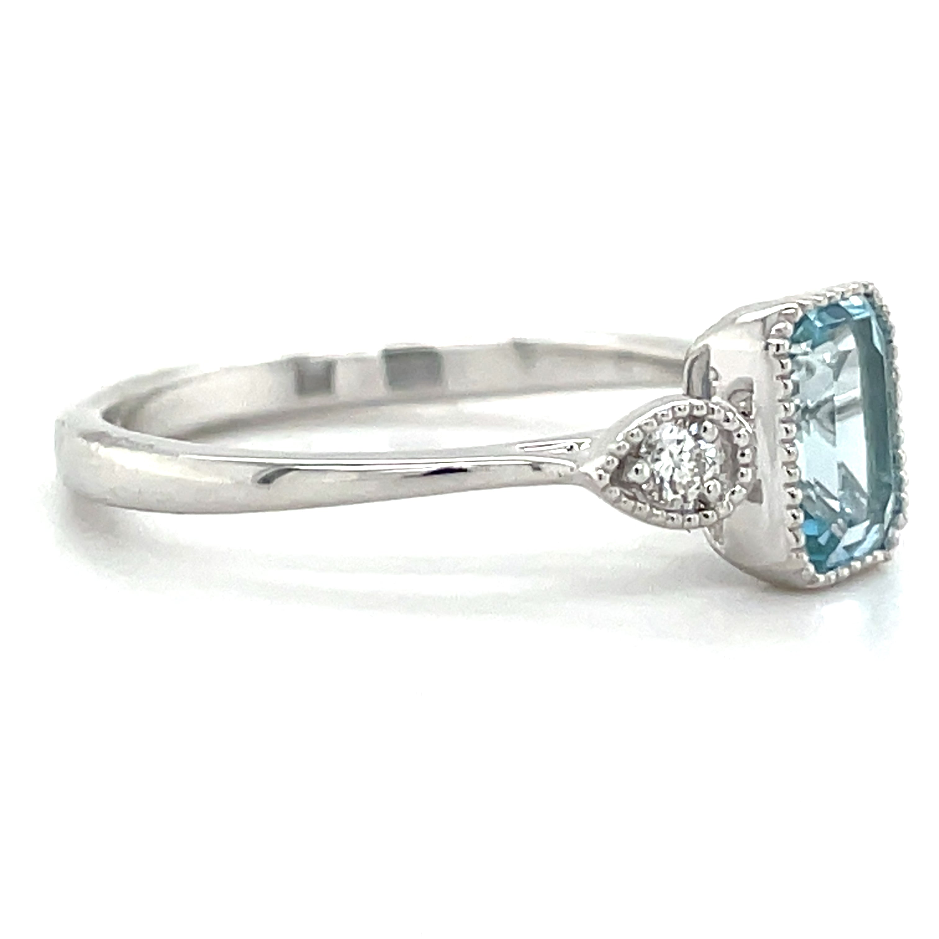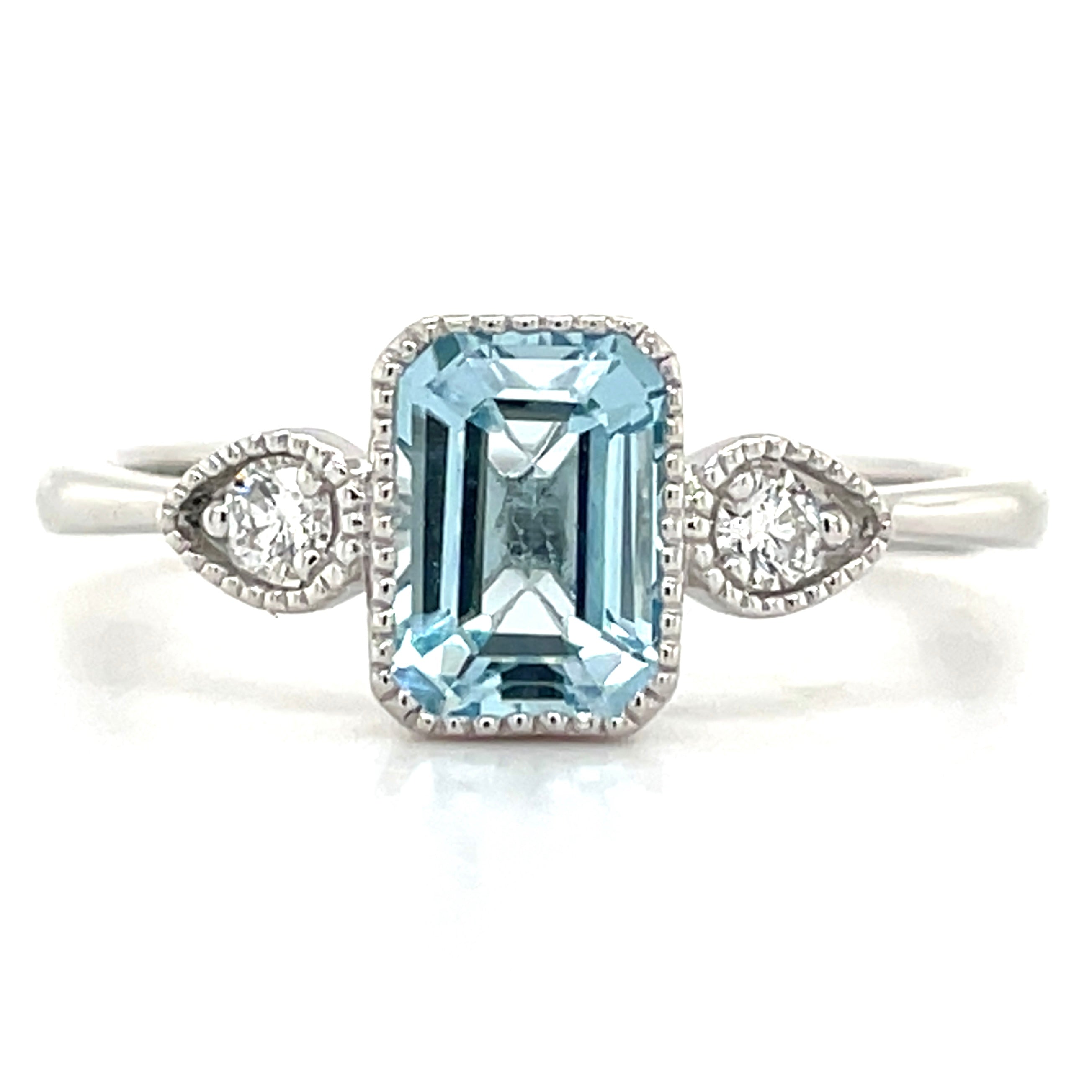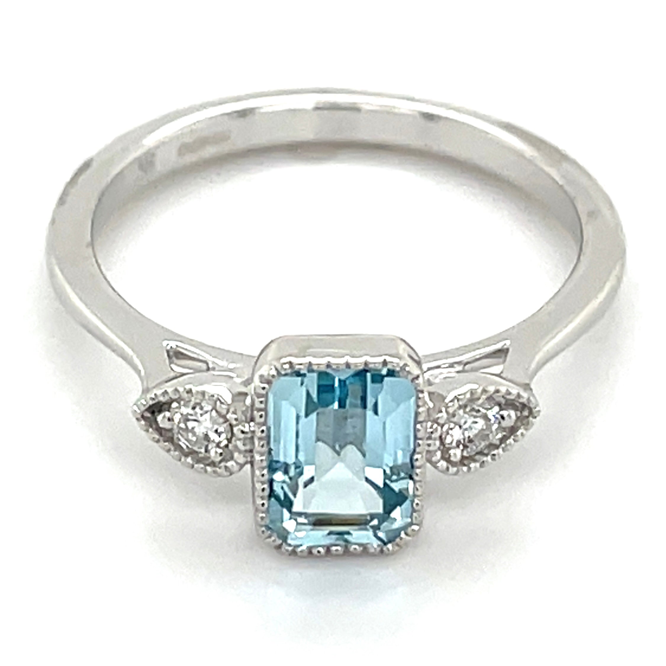 Crafted from 9ct white gold, this ring showcases a 1.21ct earth-grown blue topaz, carefully bezel set and surrounded by a milgrain-edged border that highlights its vintage Deco-inspired style. Complemented by 0.10ct of brilliant diamonds, the design reflects meticulous craftsmanship and enduring elegance.