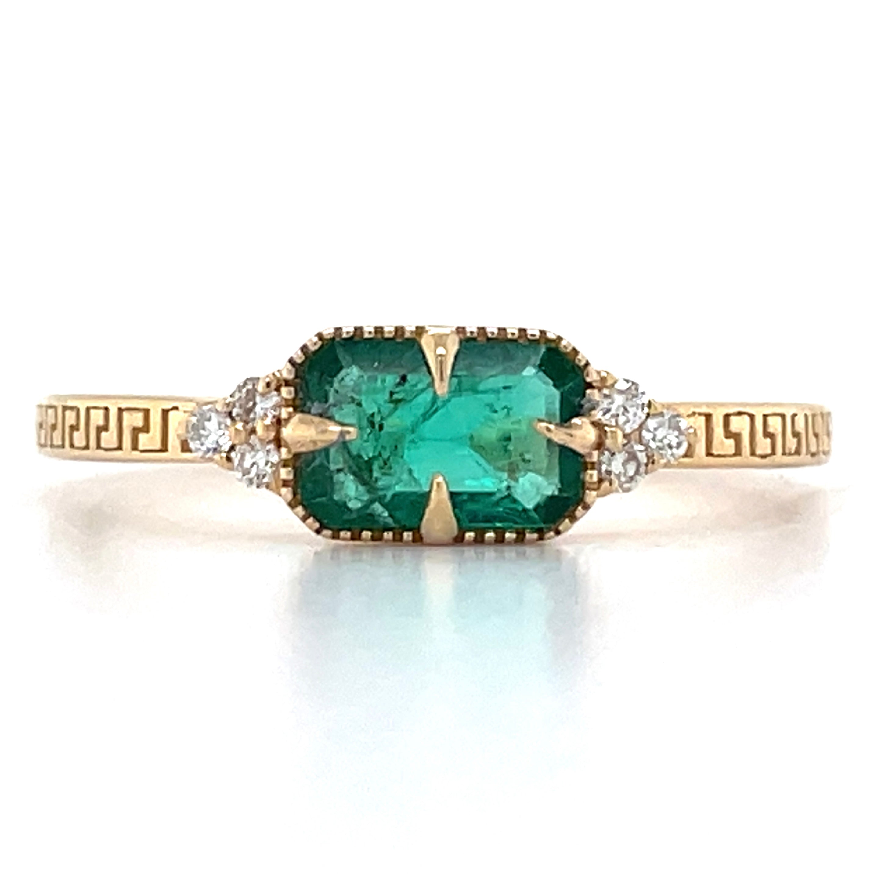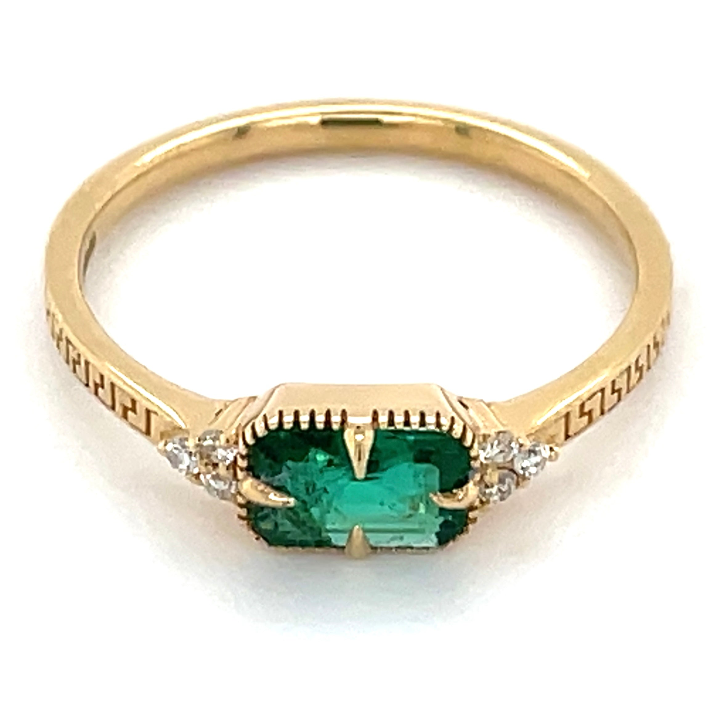 Horizontal Set 0.37-0.47ct Emerald with Side Trio of 0.04ct Diamond Ring Make a statement of luxury and add this timeless piece to your collection for a sophisticated and elegant look. Set in 18kt Yellow Gold.