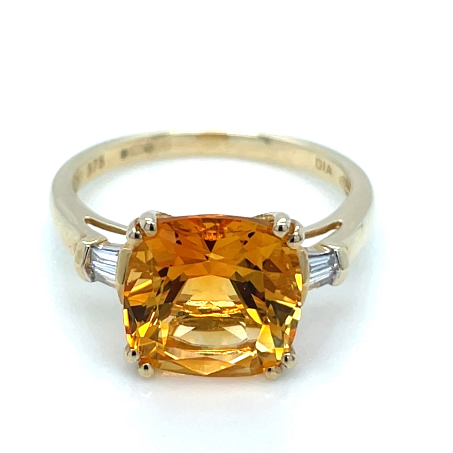 Discover the unique beauty of this 9ct yellow gold ring, showcasing a stunning 3.36ct citrine center stone with sparkling earth grown diamond side stones. Elevate your style with this elegant and timeless piece, perfect for any occasion. Experience the luxurious combination of gold and precious gemstones in this must-have accessory.