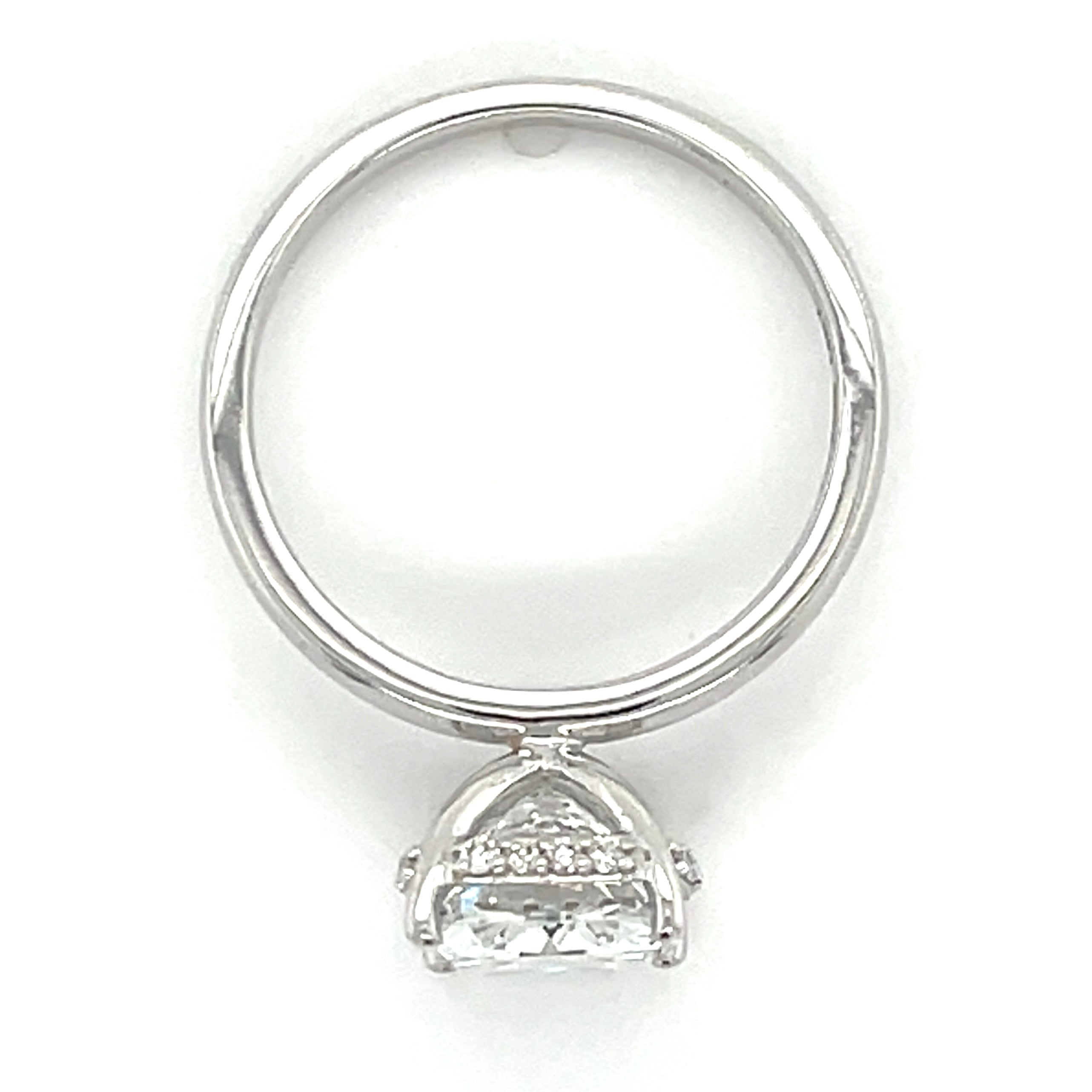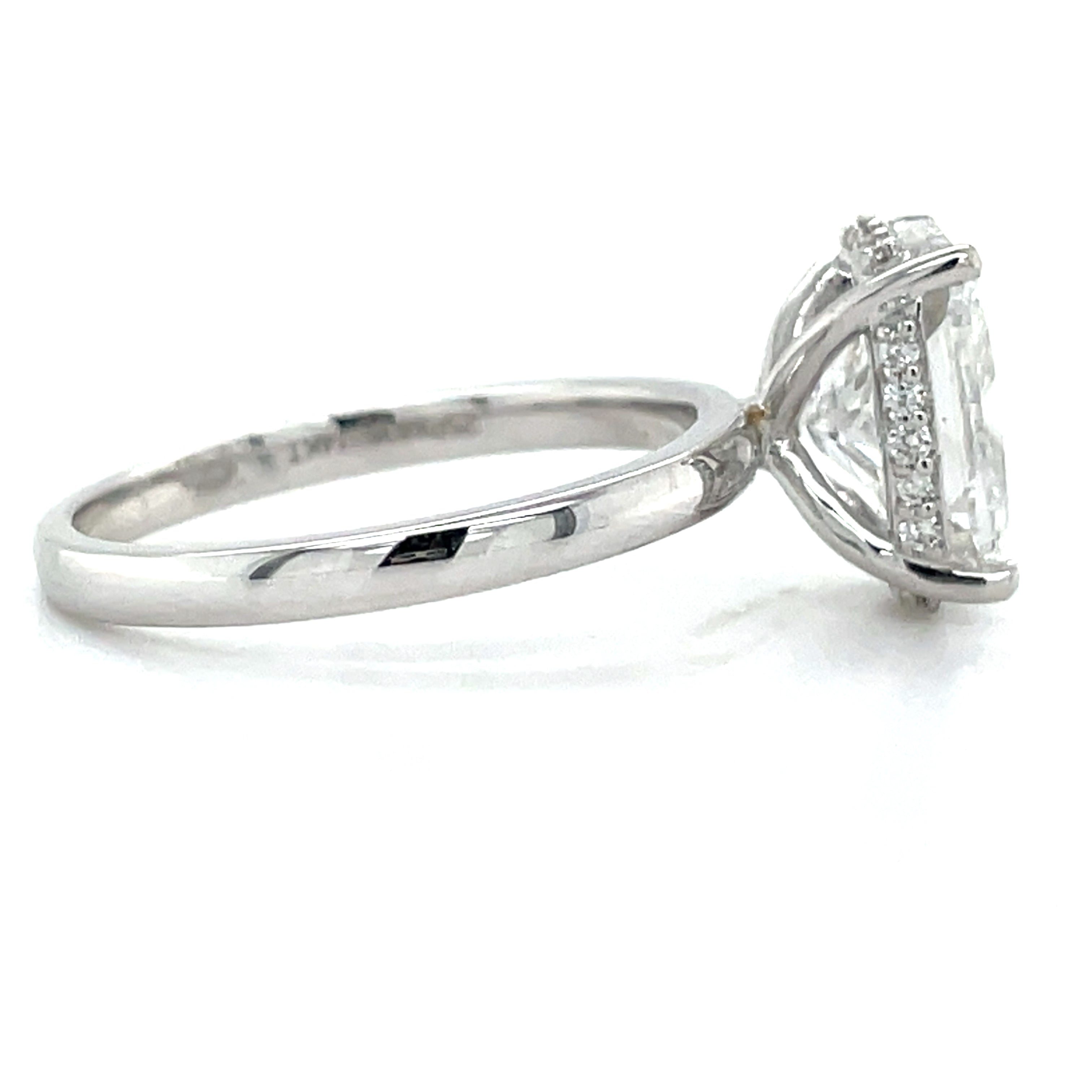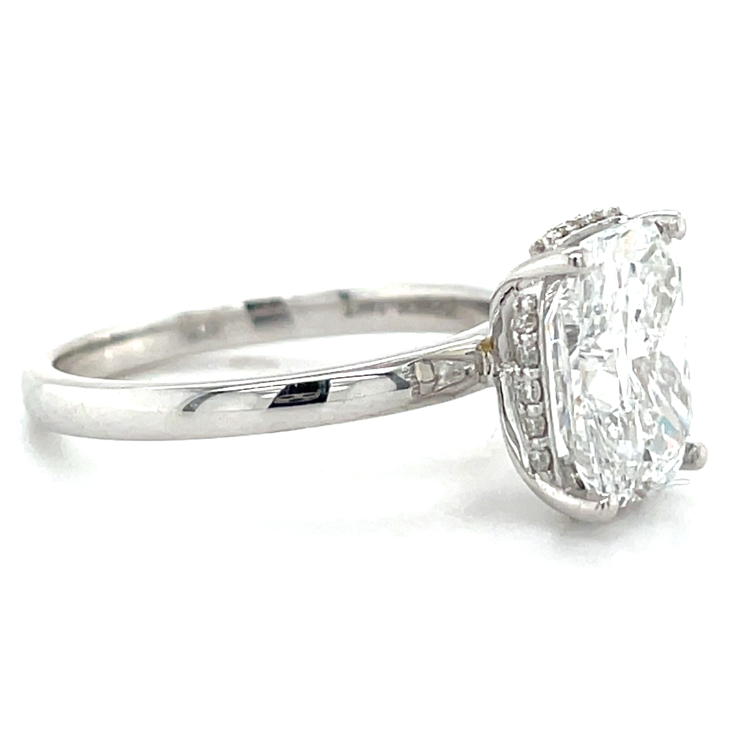Grace is a 14ct white gold engagement ring showcasing a stunning 2.56ct elongated cushion cut central diamond. The sparkling hidden halo brings the total diamond weight to 2.65ct. Grace is a laboratory grown diamond ring that comes with IGI certification.