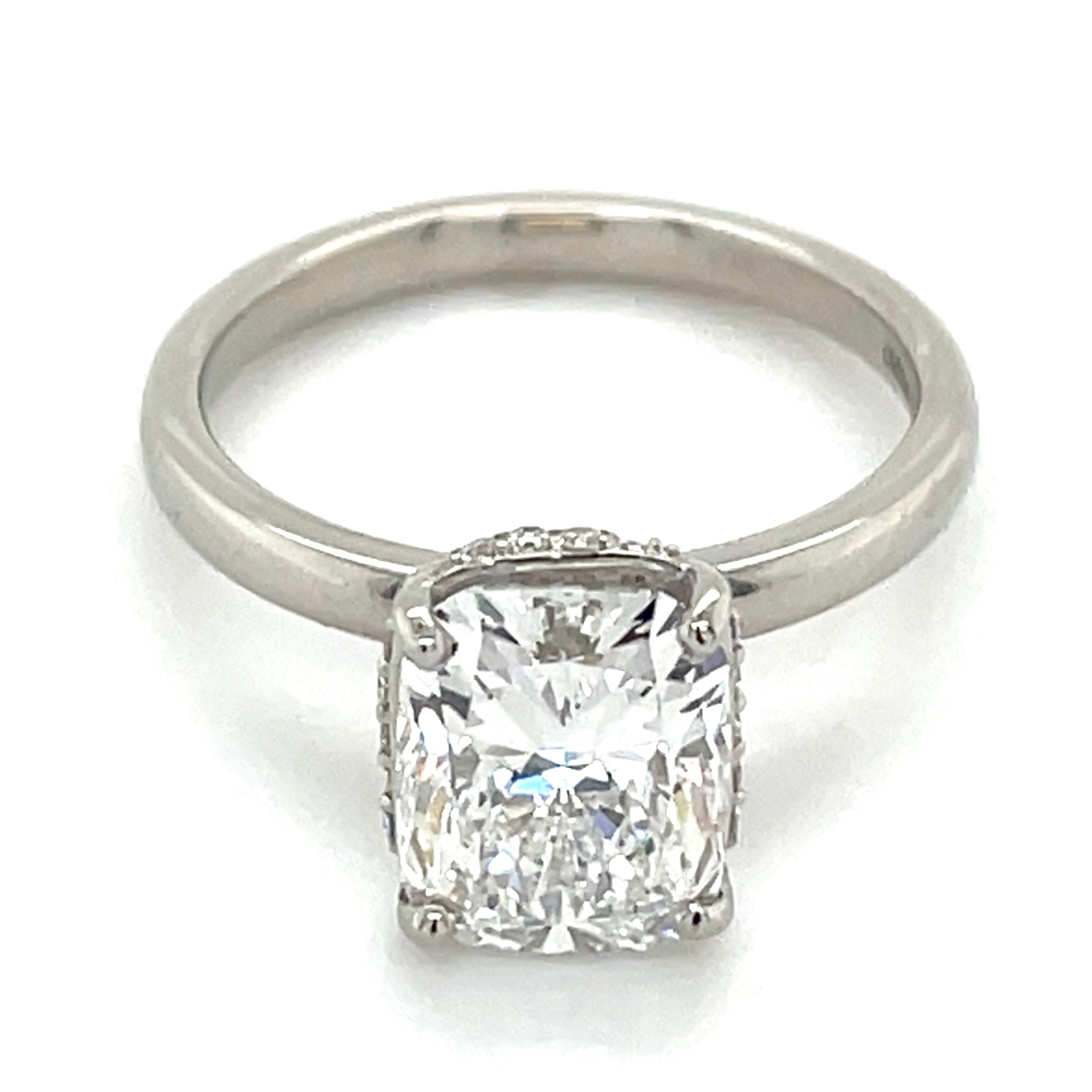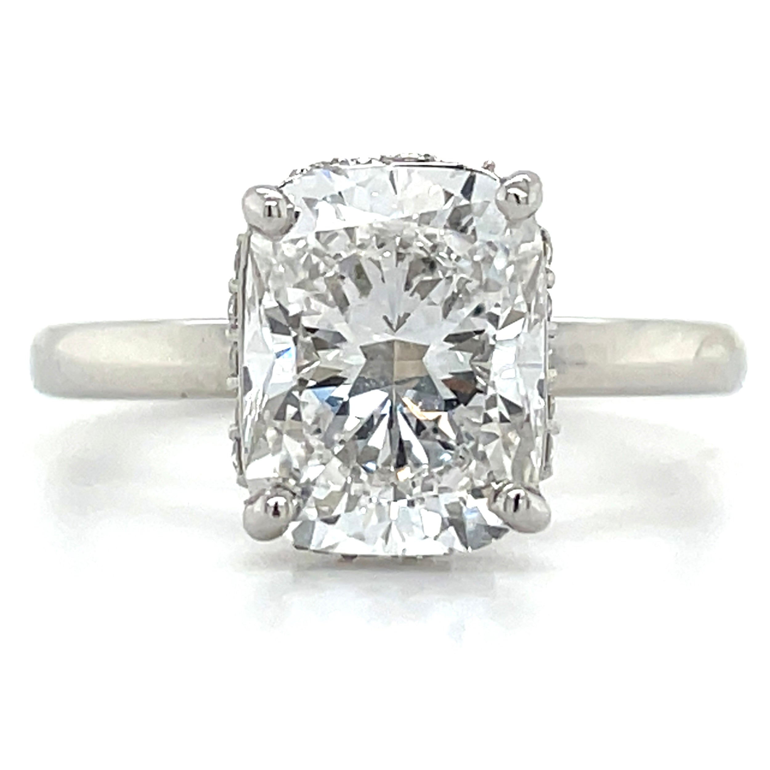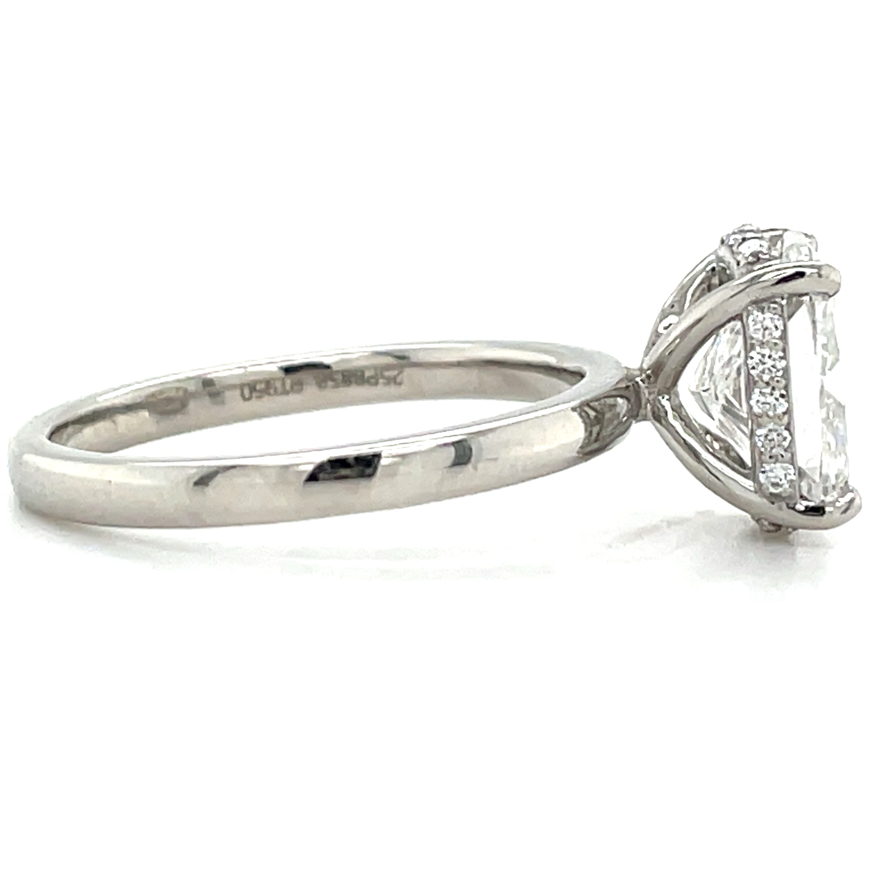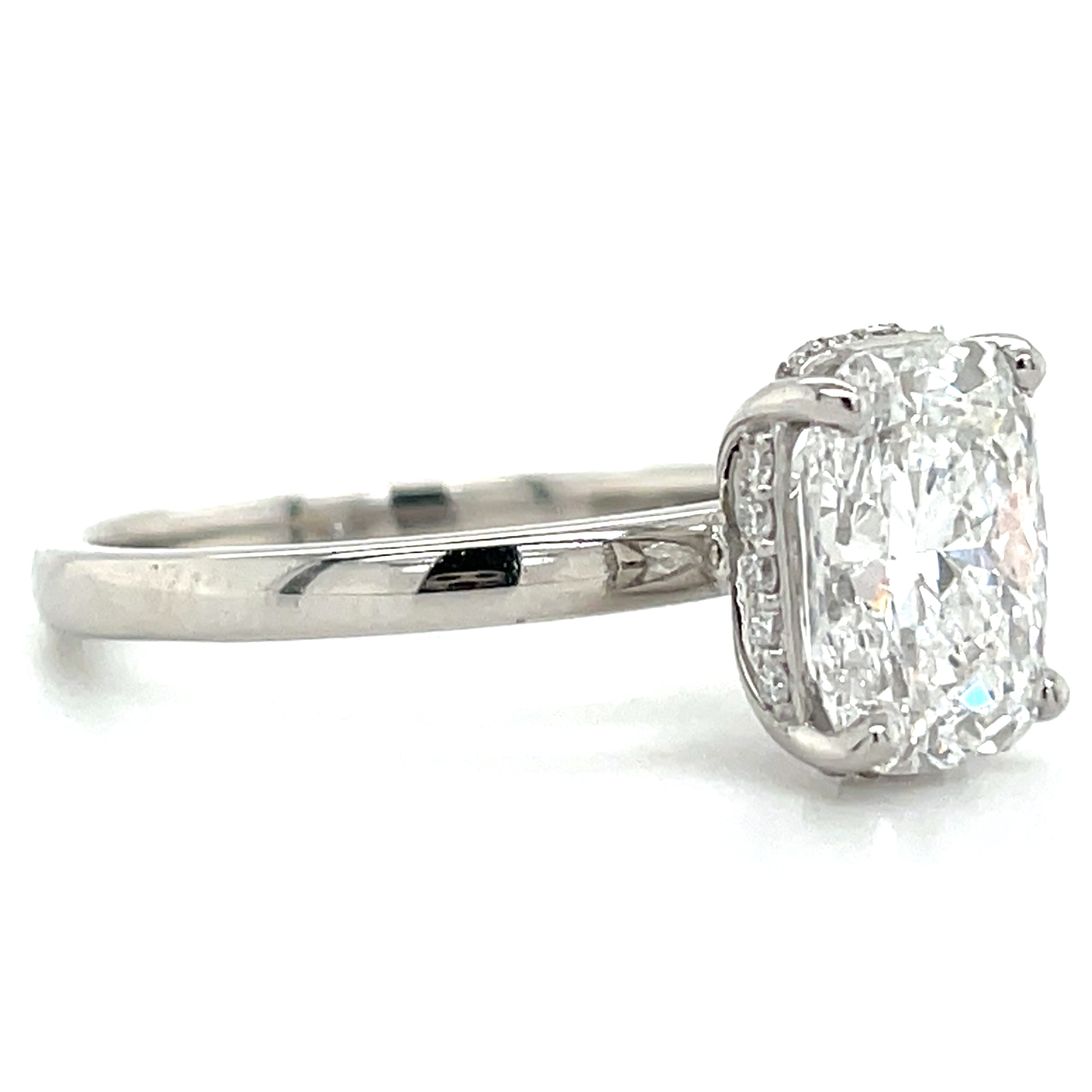 Discover the beauty of Grace, an expertly crafted platinum engagement ring featuring a stunning 2.04 / 2.05ct elongated cushion cut diamond surrounded by a diamond set hidden halo for a total diamond weight of 2.13 / 2.14ct. Grace is a laboratory grown diamond ring that comes with IGI certification.