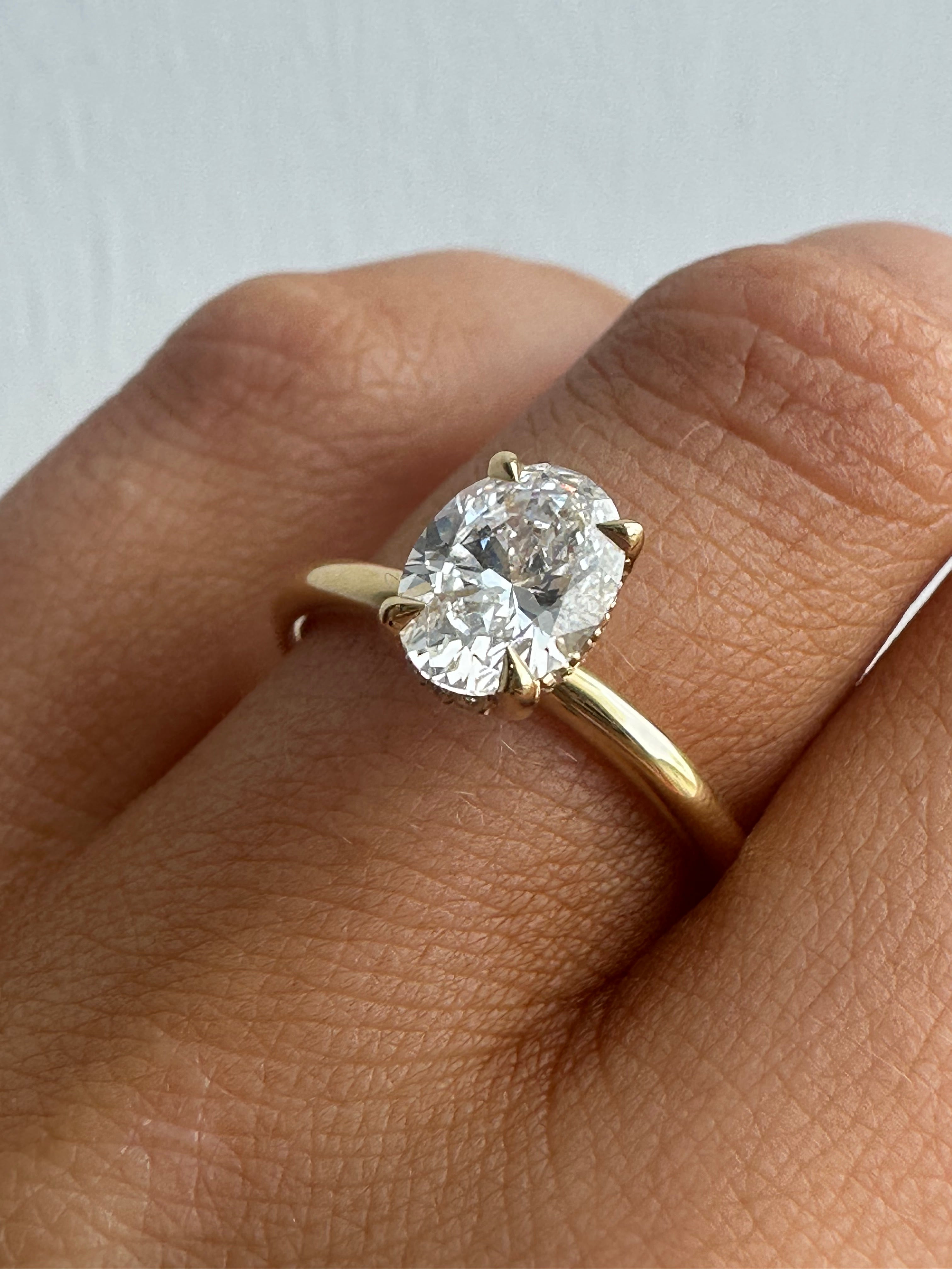 Magnificent Millie. A Ring to be Truly Admired. Sitting Securely on an 18ct Yellow Gold Band is a 1.20ct Oval Cut Diamond that has been Laboratory Grown to the highest of standards. Beneath it, you will find a Hidden Halo supporting it Beautifully, giving it a Total Diamond Weight of 1.35ct. As the Centre Stone is IGI Certified it has been Graded with the Following: