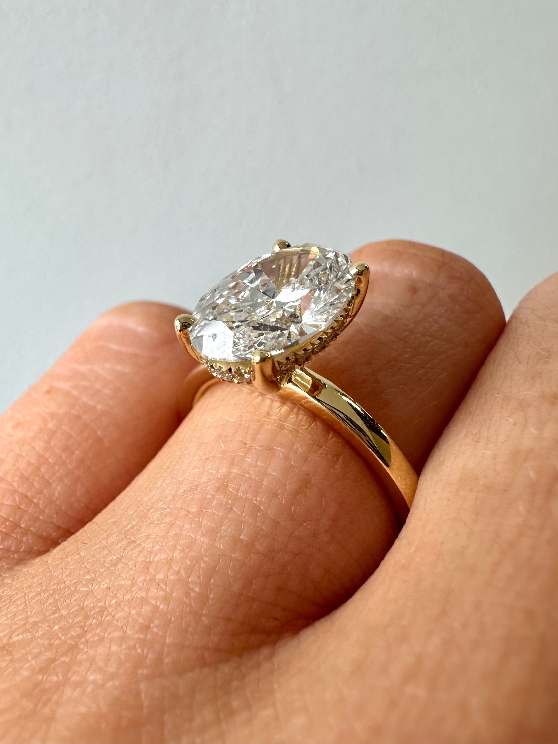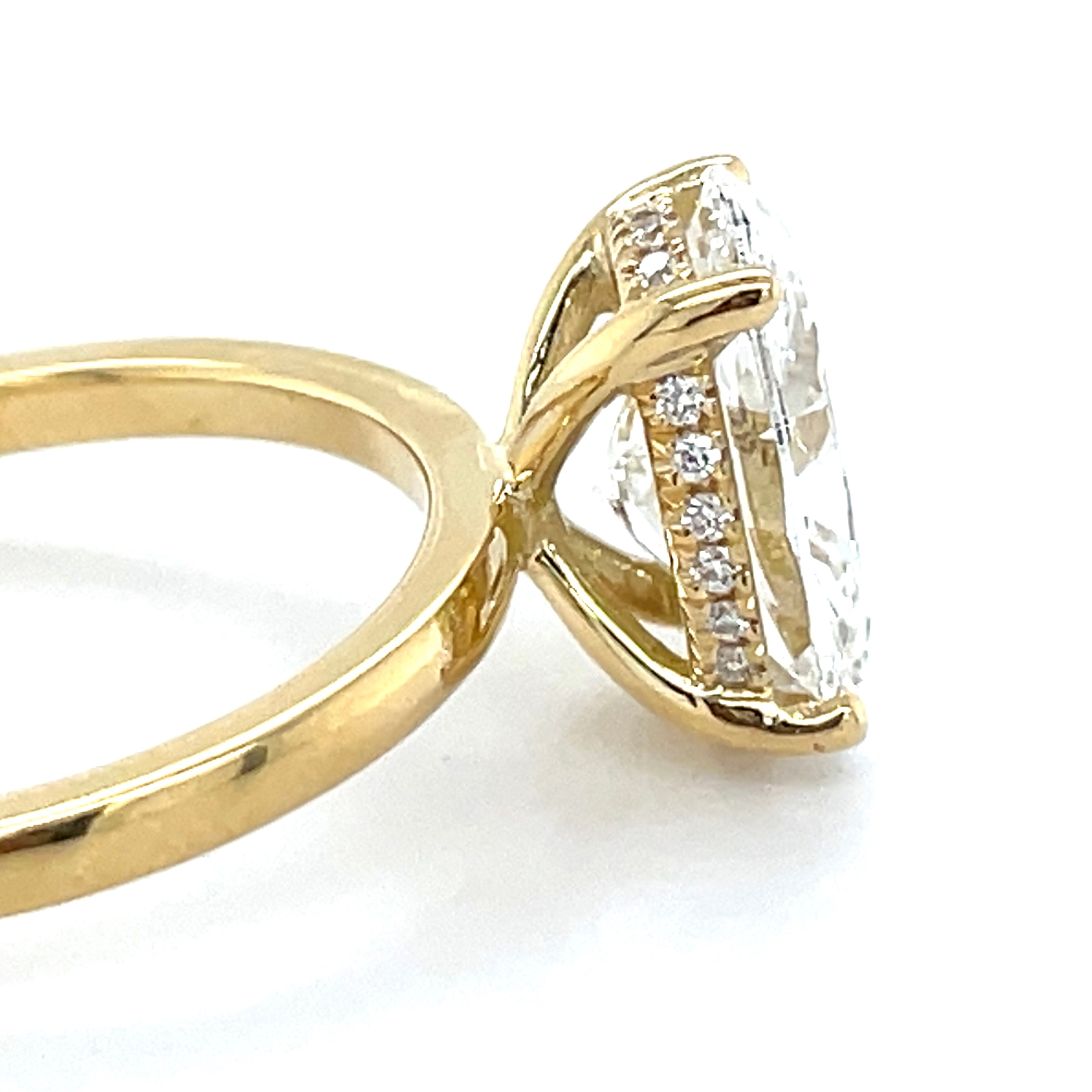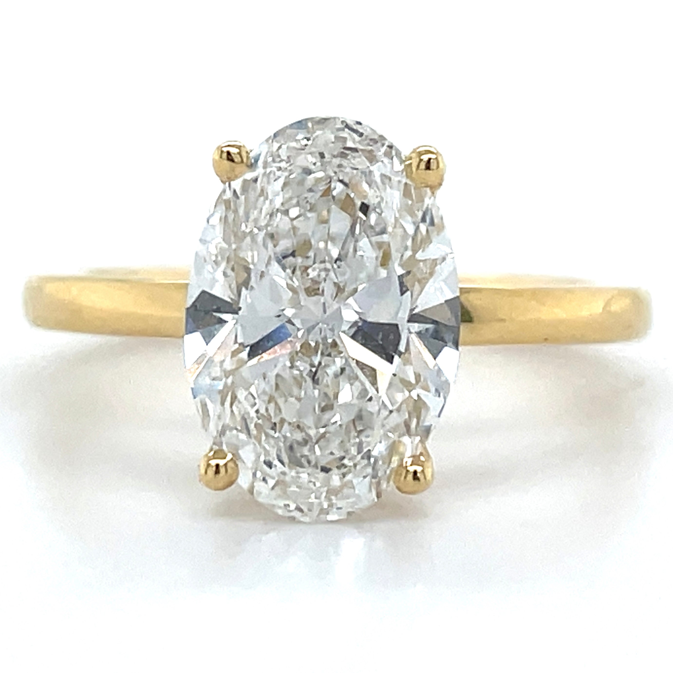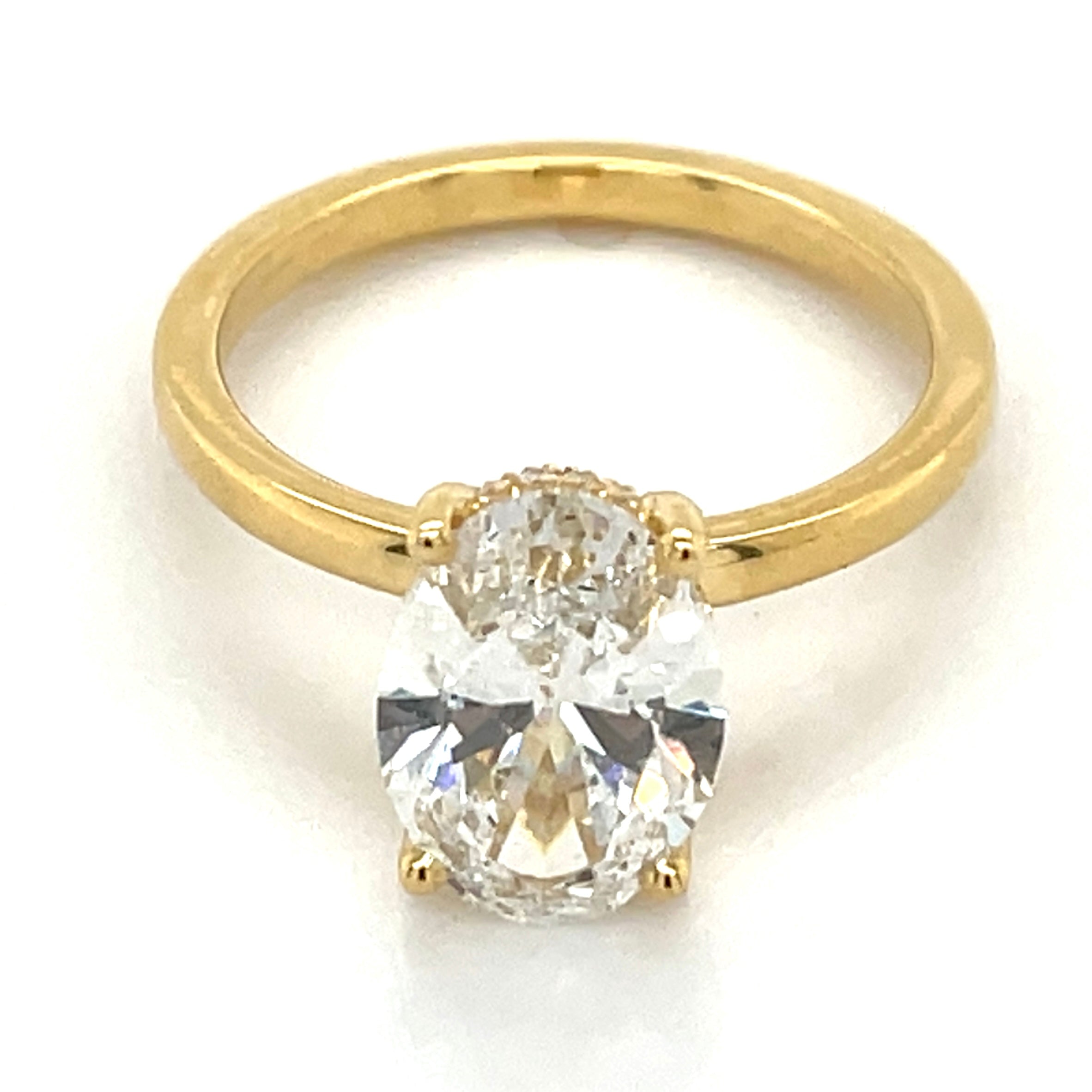 This 18ct yellow gold engagement ring features an elegant 2.51ct oval-shaped laboratory-grown diamond solitaire centre, enhanced by a subtle hidden halo that adds brilliance without overpowering the design. Expertly crafted in yellow gold on a 2m band, it offers a timeless yet modern expression of commitment with sustainable, high-quality stones.