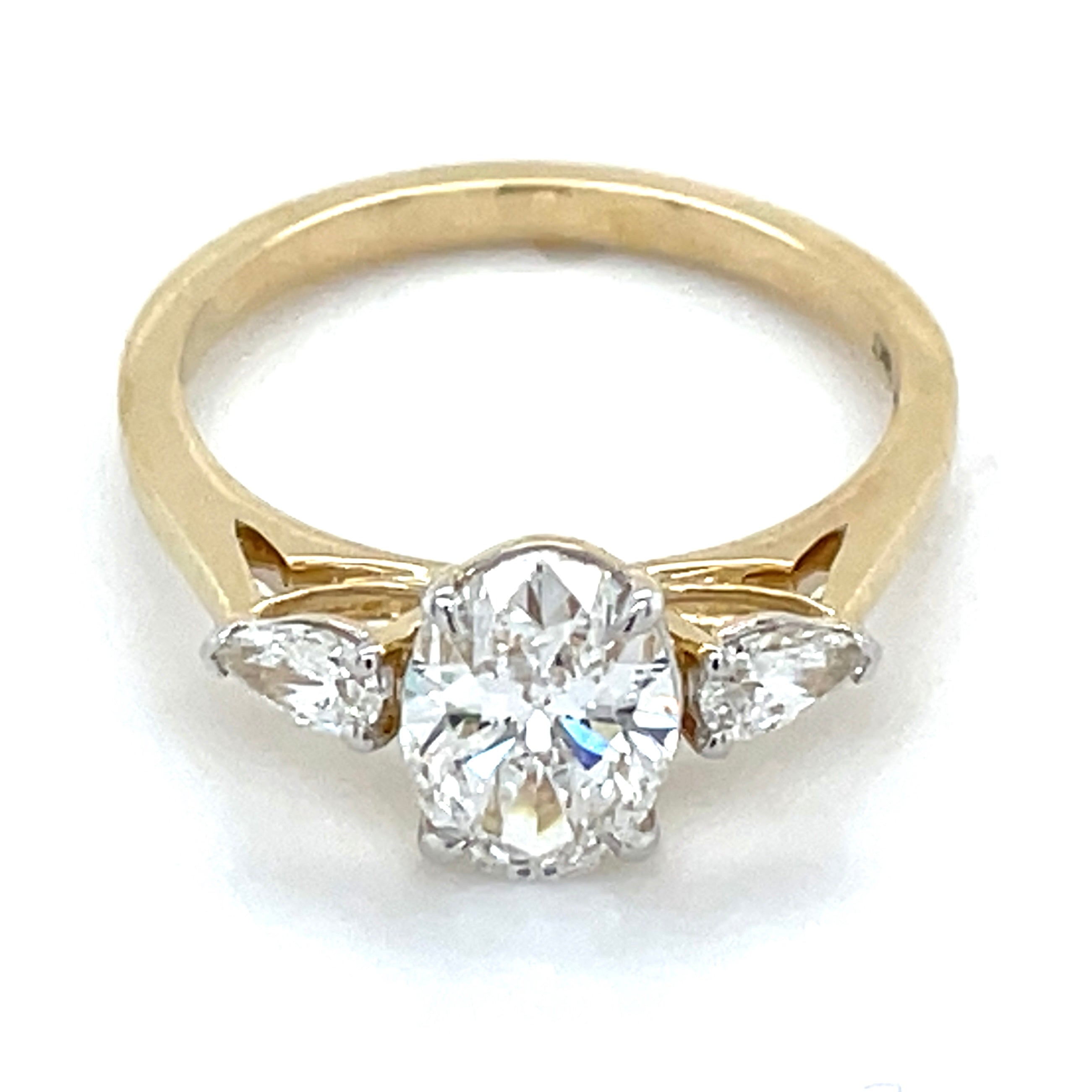The beautiful Tilly features a central 1.06ct central Oval Diamond, E Colour & VVS2 clarity. Double excellent cut stone flanked by two matching pair side stones 14ct yellow gold. The total diamond weight is 1.24 carat.