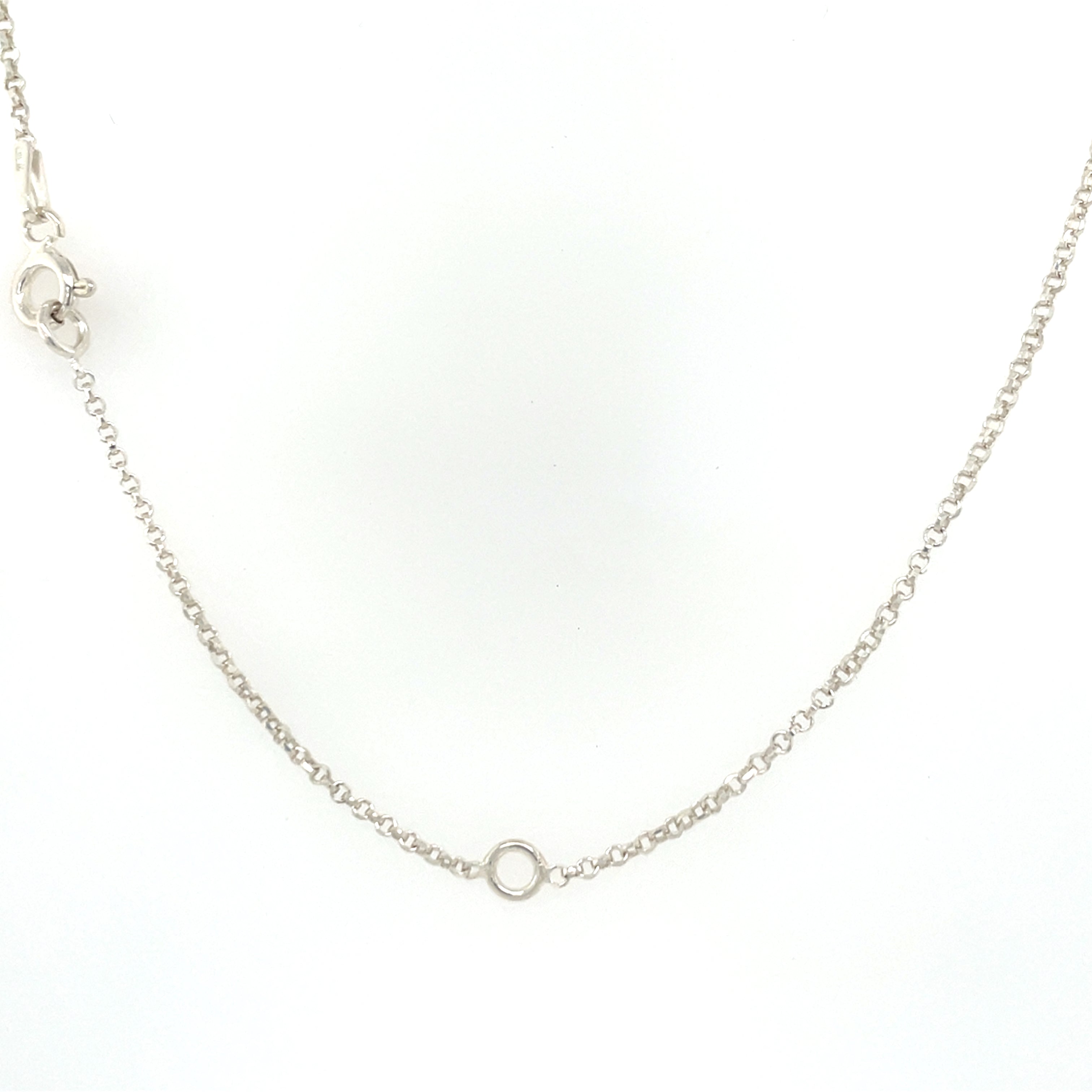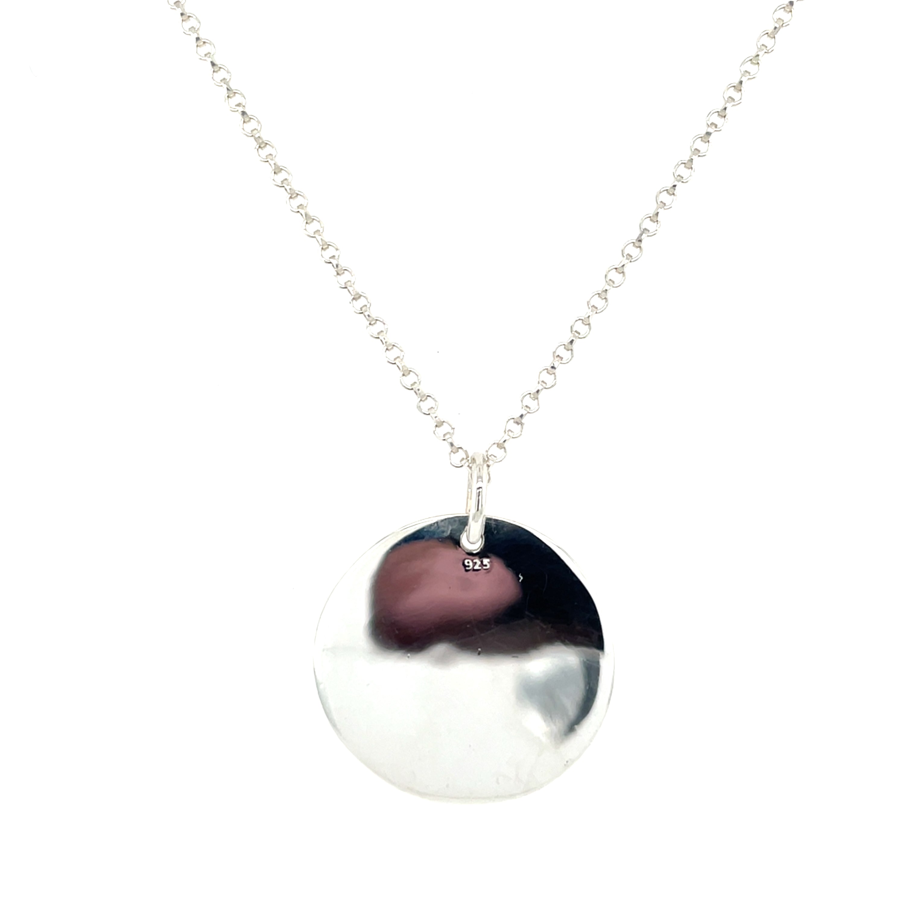 This elegant sterling silver round disc pendant features delicate baby feet. The reverse side offers space for a personalised engraving, such as a name or significant date. The disc is 20mm in diameter. The chain is 45cm with an adjustment at 40cm.