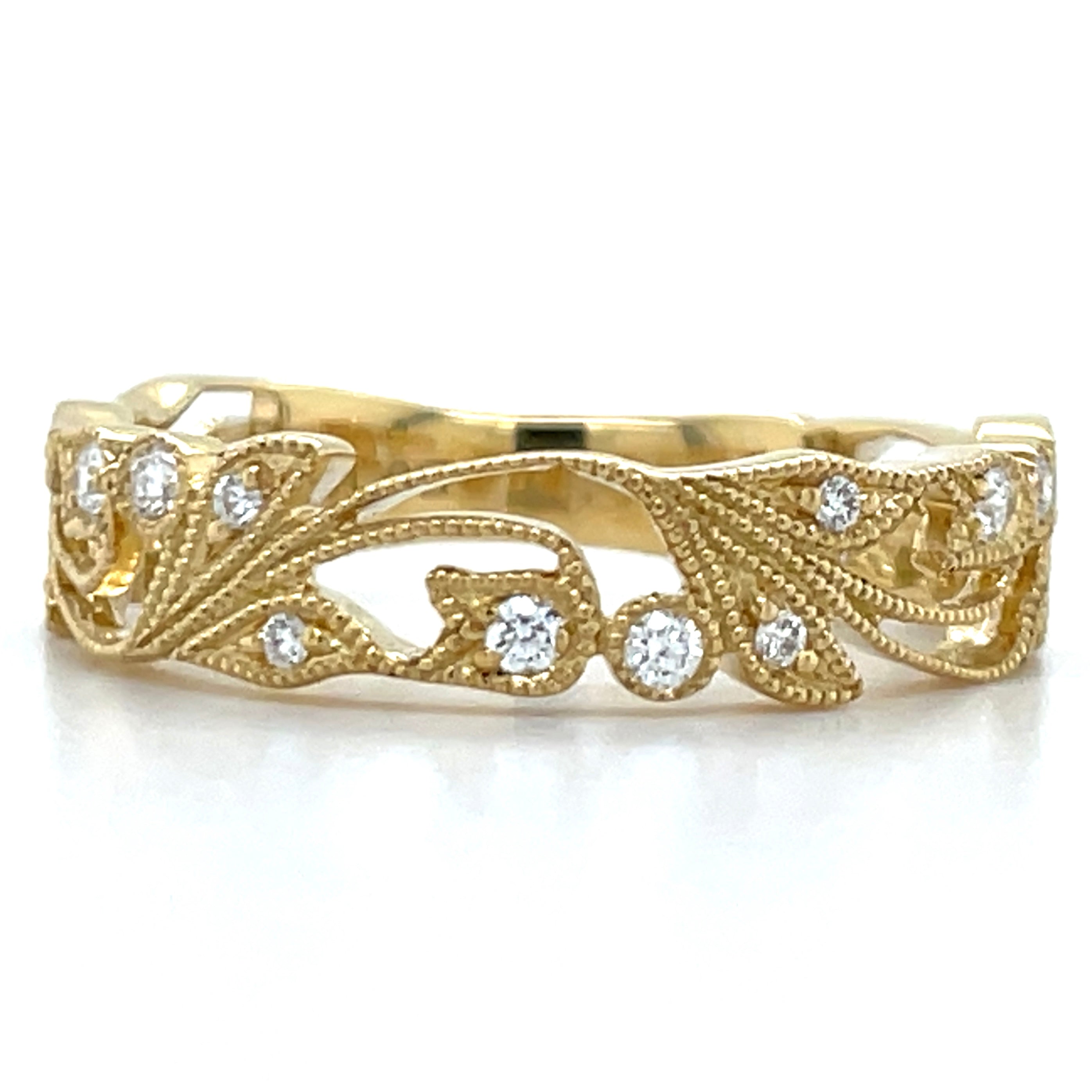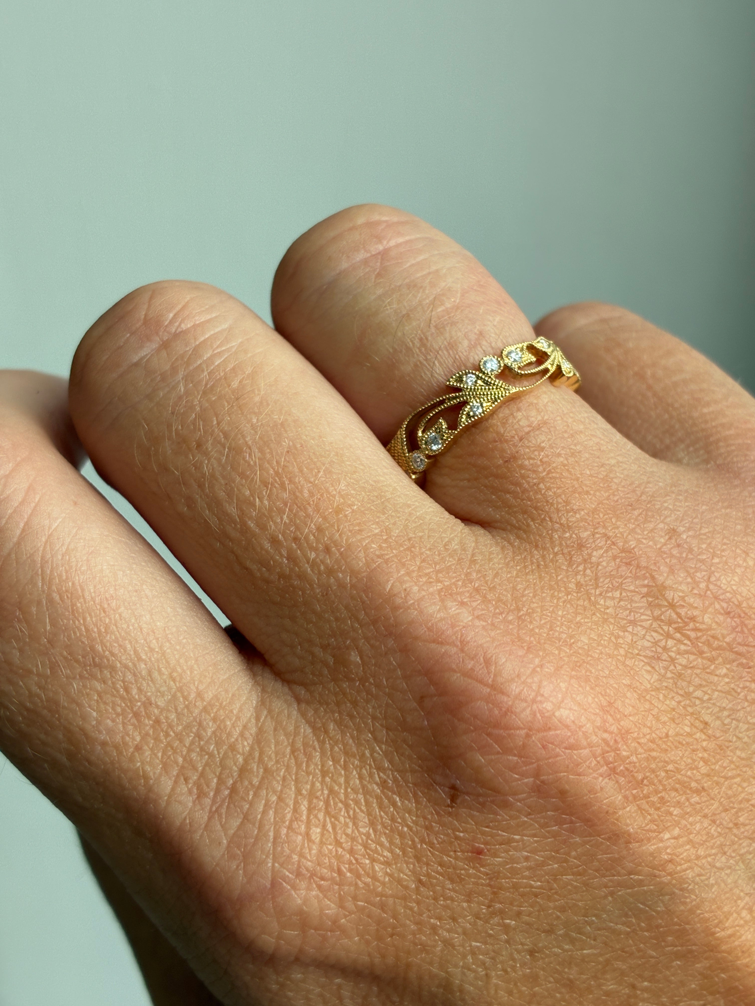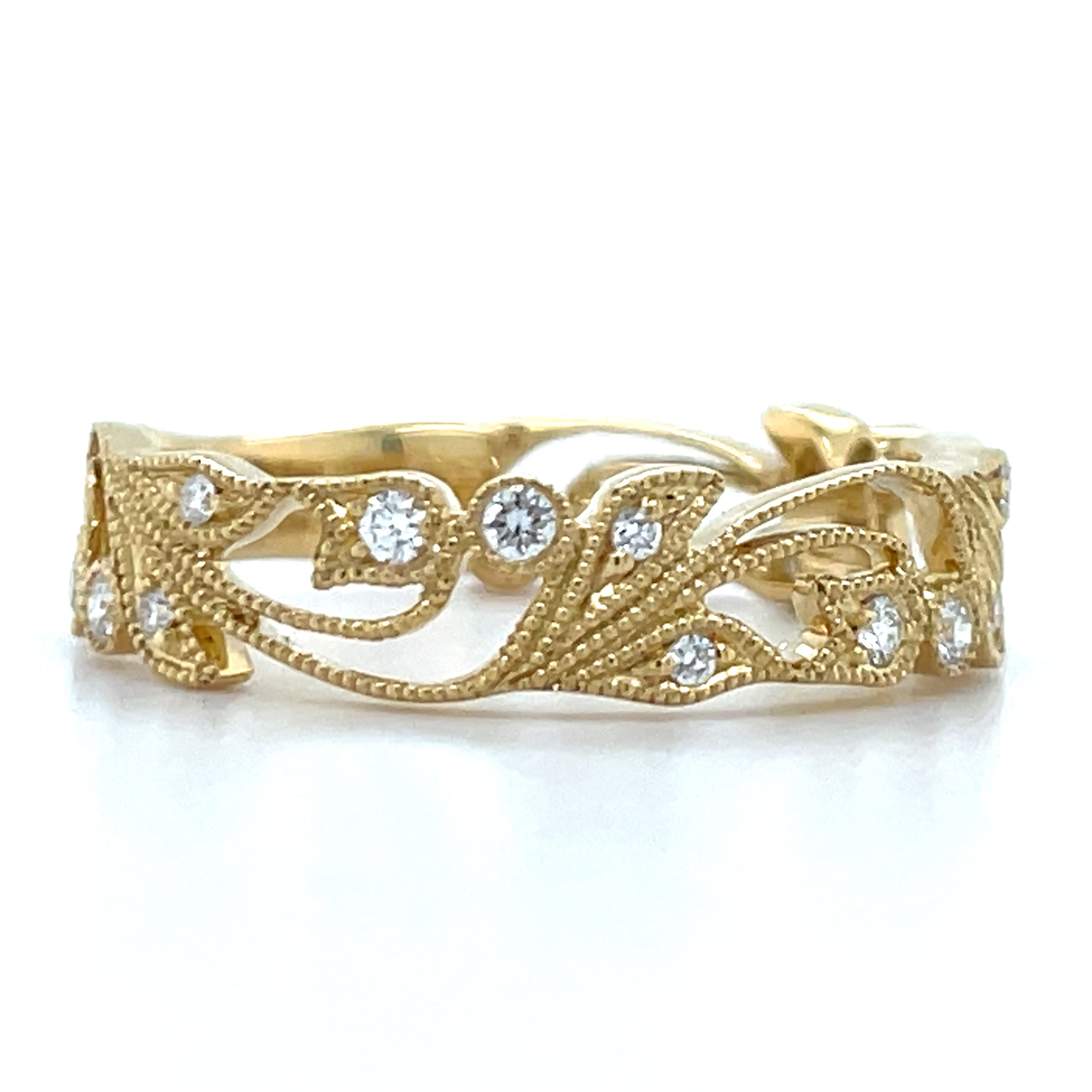 This 18ct yellow gold ring features 18 round earth-grown diamonds totaling 0.18ct. The intricate floral leaf and vine design showcases exceptional craftsmanship, creating a refined and elegant piece that stands out with its unique artistry.