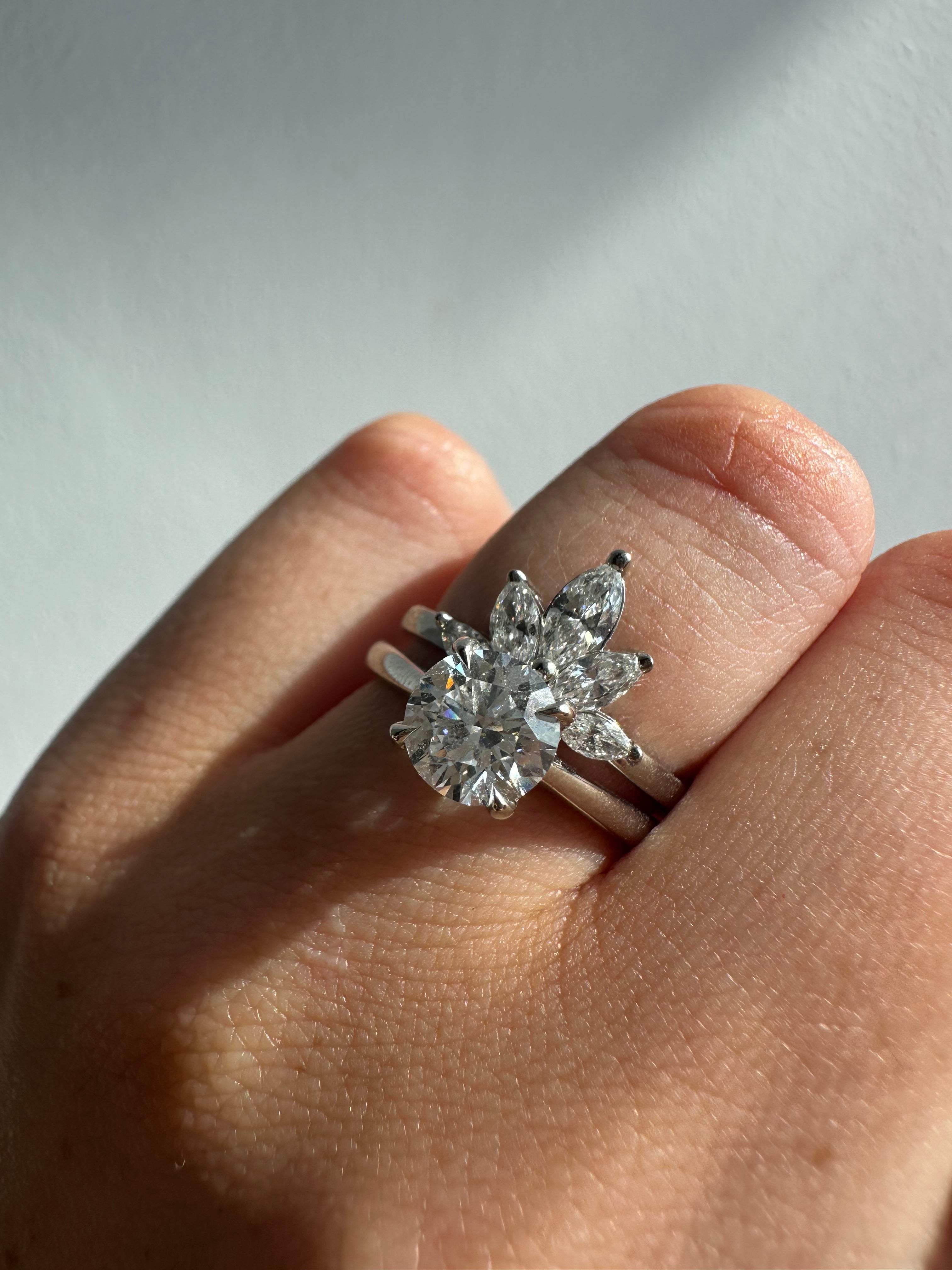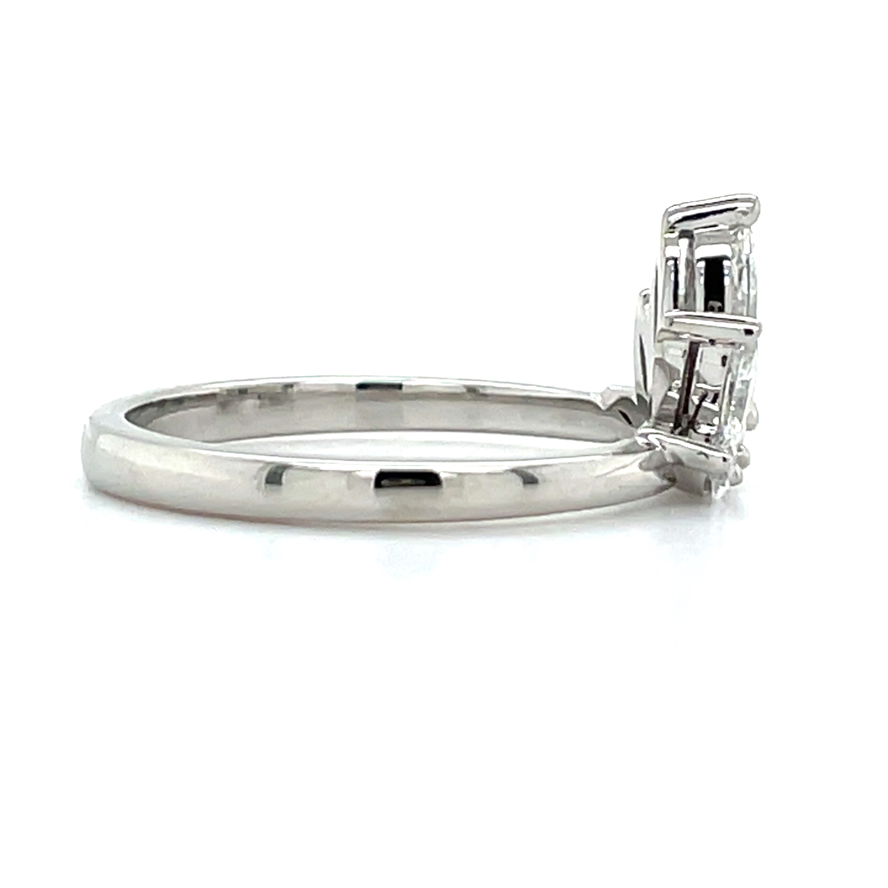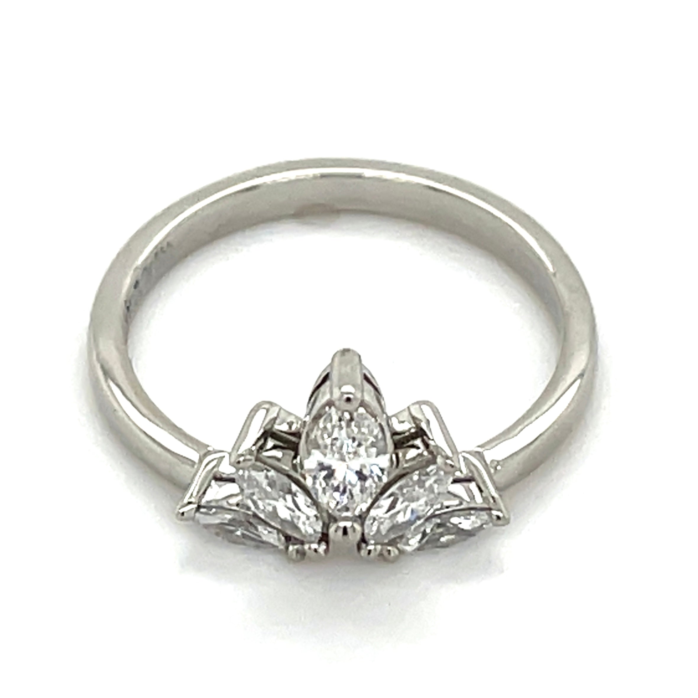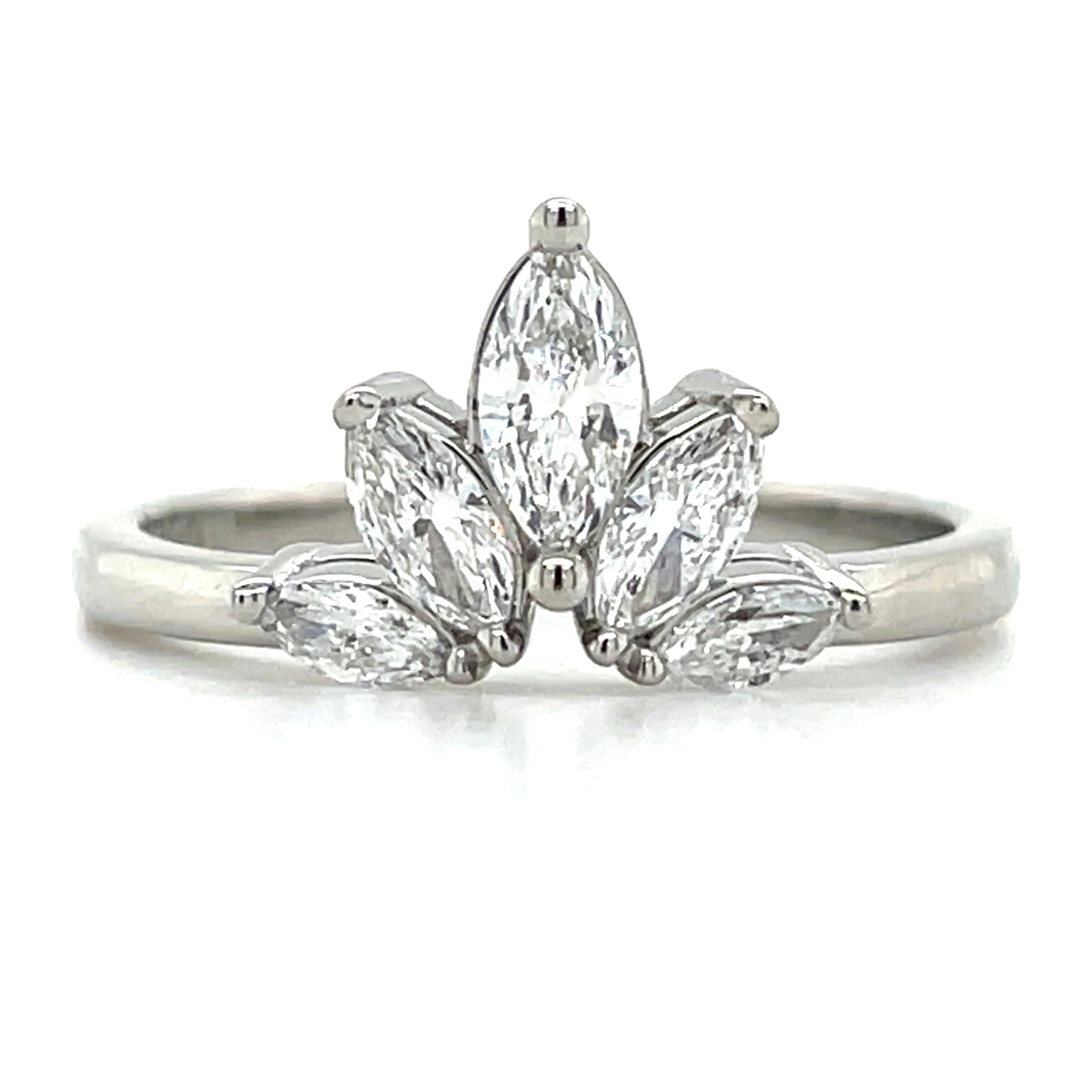This stunning platinum ring showcases five marquise-cut laboratory-grown diamonds, meticulously arranged in a sophisticated crown motif. Crafted from durable platinum, it combines refined elegance with enduring strength. The diamonds collectively weigh 0.55 carats, highlighting the ring’s exceptional quality.