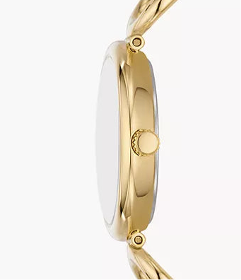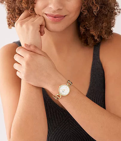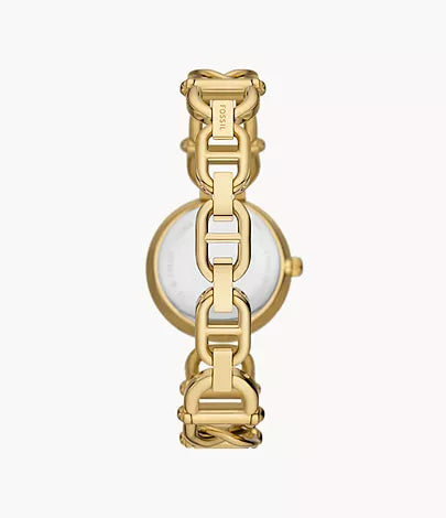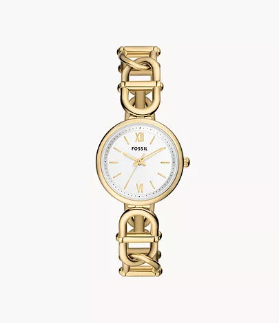 Upgrade your style game with our Fossil Carlie Three-Hand Gold-Tone Stainless Steel Watch. This versatile timepiece boasts a 30mm case, elegant gold-tone finish, and a chic bracelet with signature D-link hardware. Stay on time and in style with its Roman numeral and stick indices and reliable three-hand movement.