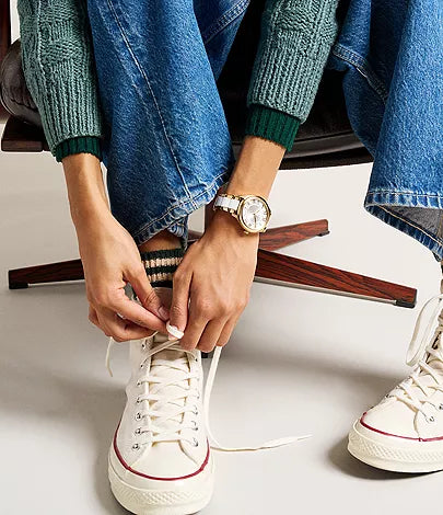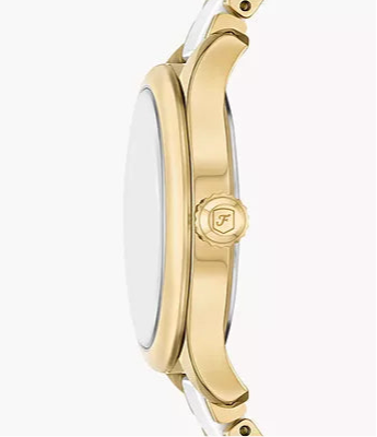 Experience the perfect blend of luxury and durability with the Fossil Gilmore Three-Hand Date Gold-Tone and White Ceramic Watch. The stunning combination of gold-tone and white ceramic creates a timeless design that adds a touch of refinement to any outfit. Featuring a satin and sunray-finished white dial, this watch exudes elegance and showcases impeccable attention to detail. With its sleek and sturdy design, it's the perfect addition to any watch collection.