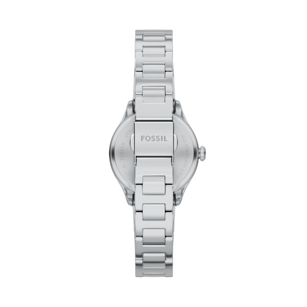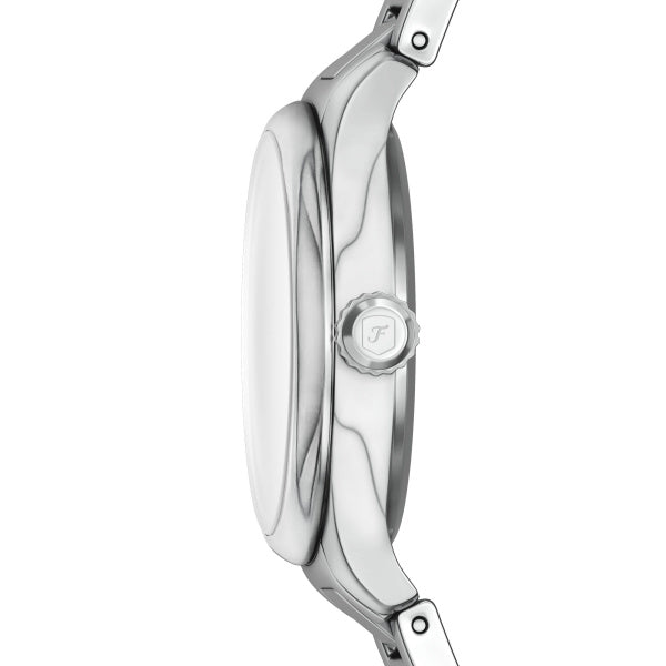 Crafted in silver-tone stainless steel, the Fossil Gilmore watch boasts a refined and sleek monochromatic look. Its minimalist design features a three-hand configuration and a satin sunray dial for precision and simplicity. The polished bracelet and streamlined dial showcase expert craftsmanship and modern style.