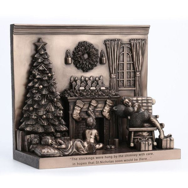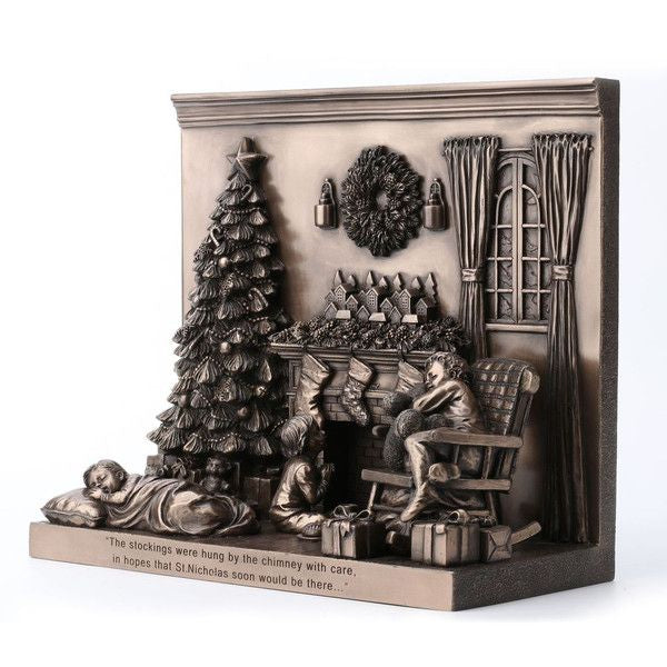 • A gorgeous bronze coloured Christmas decoration by Genesis Ireland. Beautifully crafted, this Christmas scene incorporates three children trying to stay awake to see Santa! Showcasing the classic Christmas scene of sitting around the Christmas tree and stockings over the fireplace, this ornament is finished off with the inscription "The stockings were hung by the chimney with care in hope that St. Nicholas soon would be there...". A perfect keepsake which will bring the magic of Christmas to your home for many years to come.