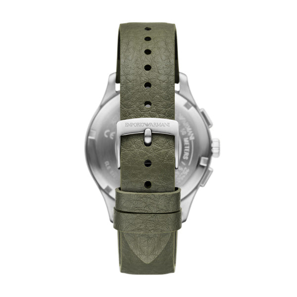This distinctive men's watch features a sage green leather strap paired with a black dial, elegantly framed by a silver case.