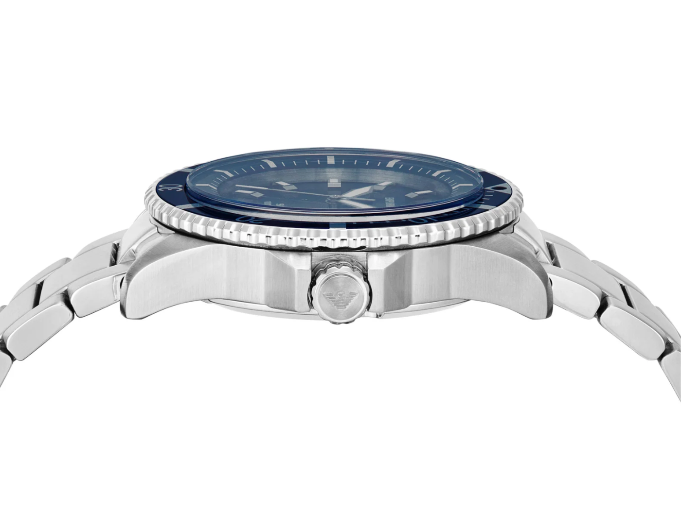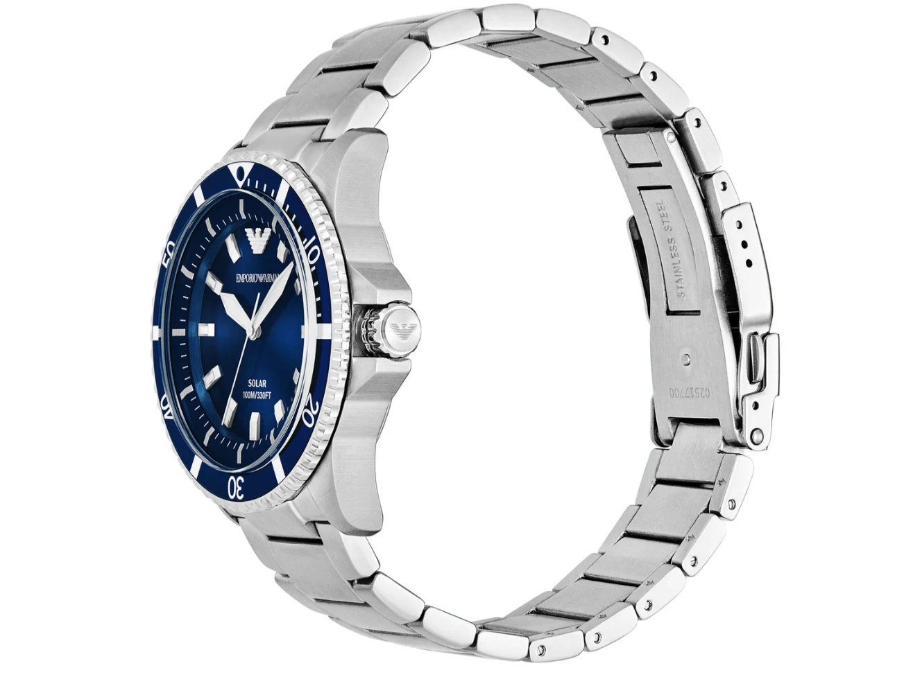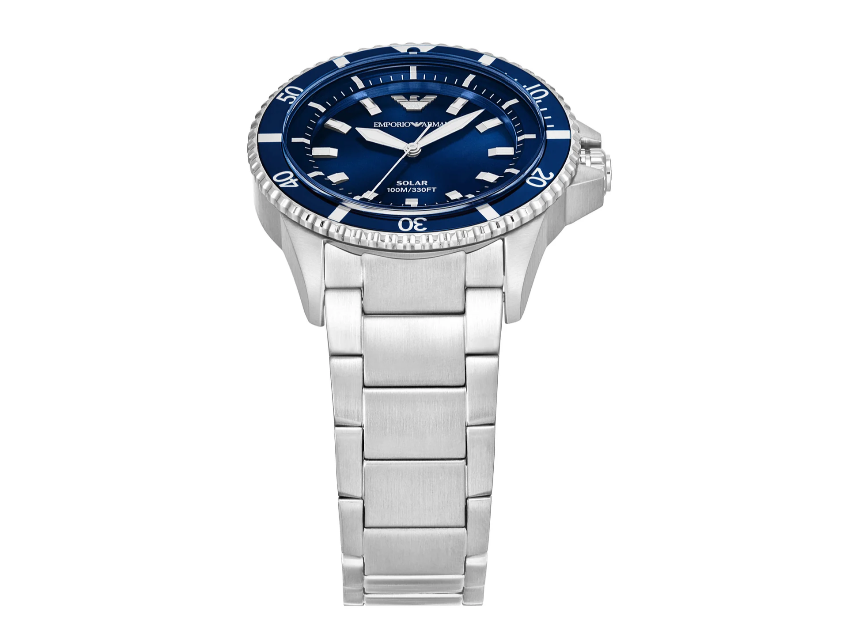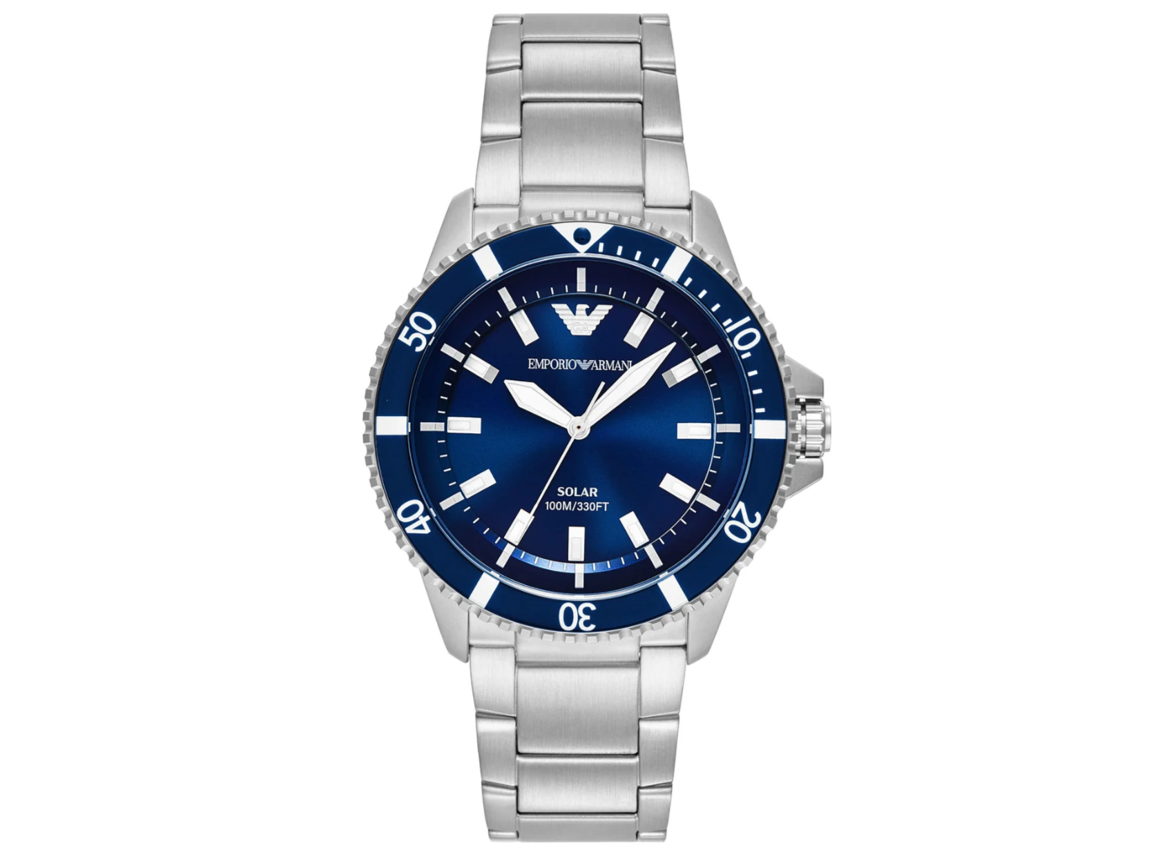 Explore the world in style with Emporio Armani's Men's World Explorer Solar-Powered Watch. Featuring a 42mm blue sunray dial and sapphire crystal, this watch is both sleek and reliable. Its solar-powered movement ensures accurate timekeeping for all your adventures.