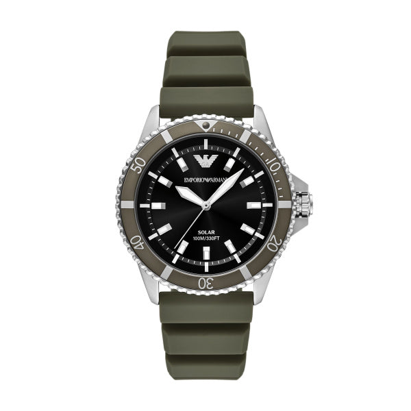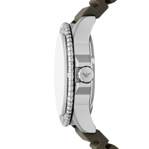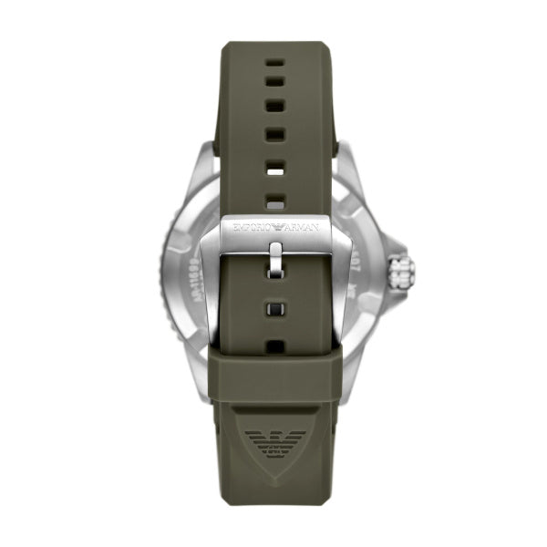 The Emporio Armani World Explorer AR11699 offers a bold and versatile timepiece suitable for various settings. Featuring a rugged textured bezel edge and durable green silicone strap, this watch stands out with a statement-making 42mm diameter. With quartz movement and 10 ATM water resistance, it offers everyday durability, while the classic silver and green design elevates any look.