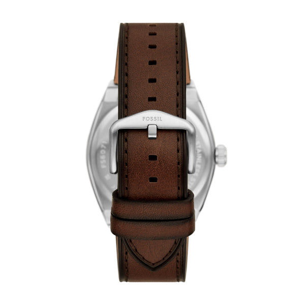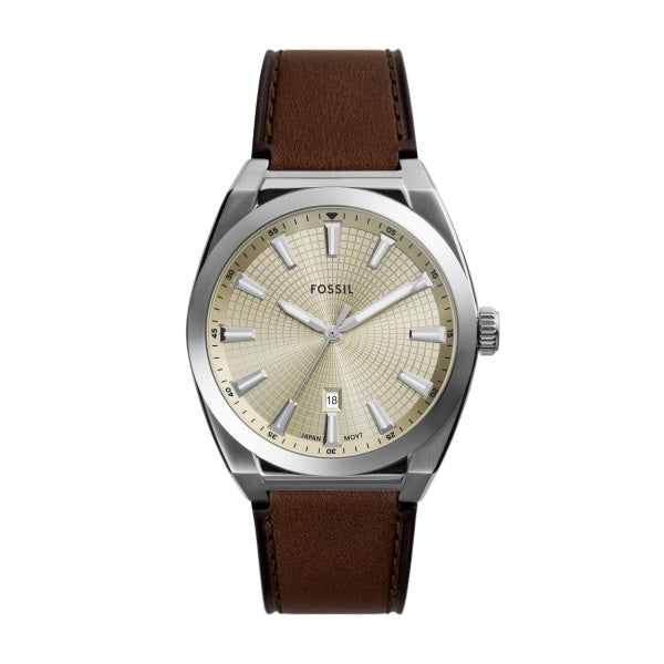 The Fossil Everett Three-Hand Date Brown Leather Watch offers a classic and sophisticated look with its cream sunray dial and brown leather strap. Its three-hand date movement allows for easy timekeeping.