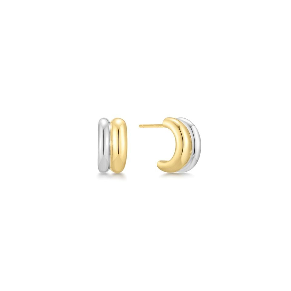 These huggie hoop earrings feature a sophisticated two-tone design, crafted from sterling silver and enhanced with gold plating for a refined mixed-metal look.