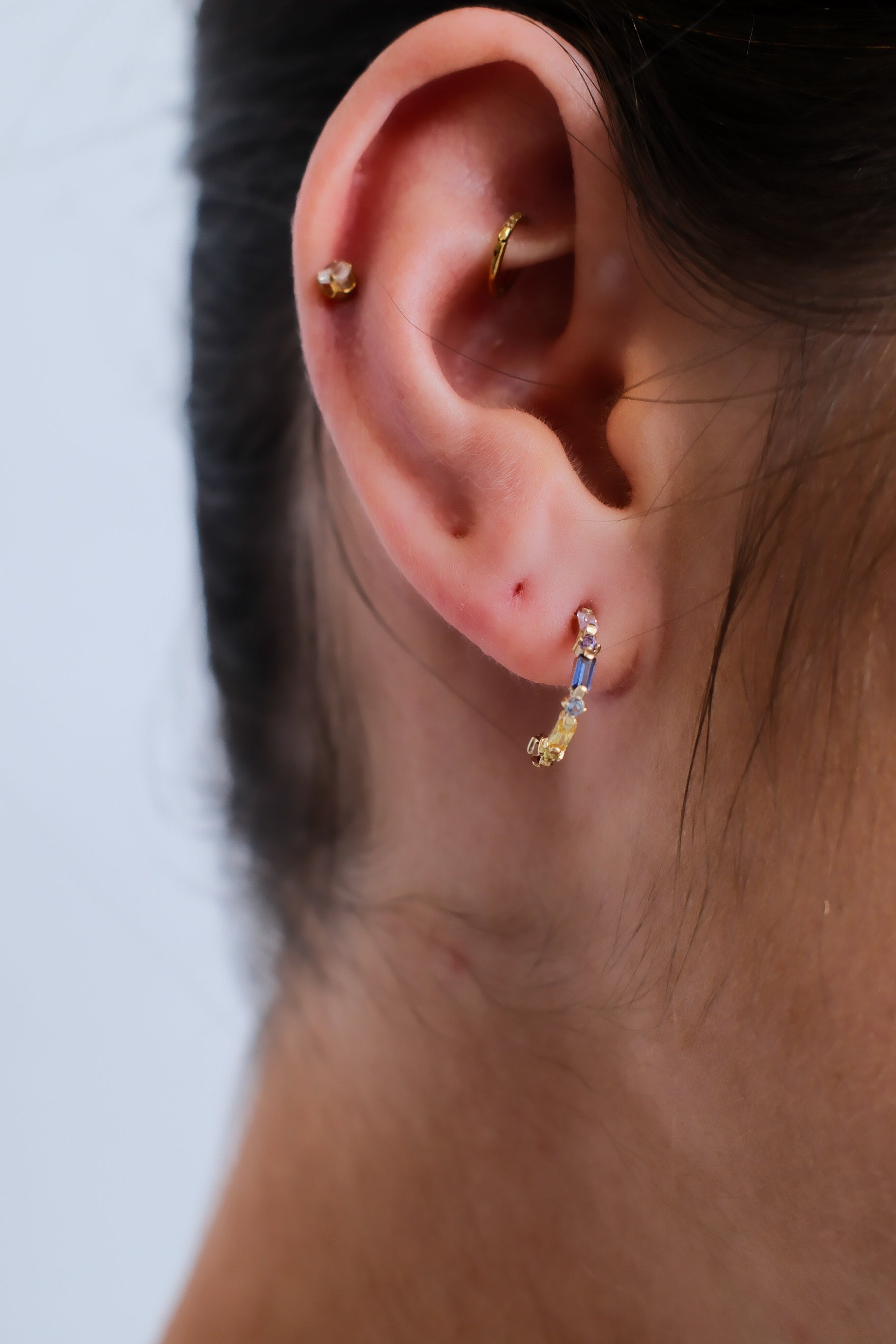 Crafted from luxurious 9ct yellow gold, these multi-coloured hoop earrings feature a stunning combination of round and emerald cut gems. With a unique design and quality materials, these earrings are the perfect accessory for adding a touch of elegance to any outfit.