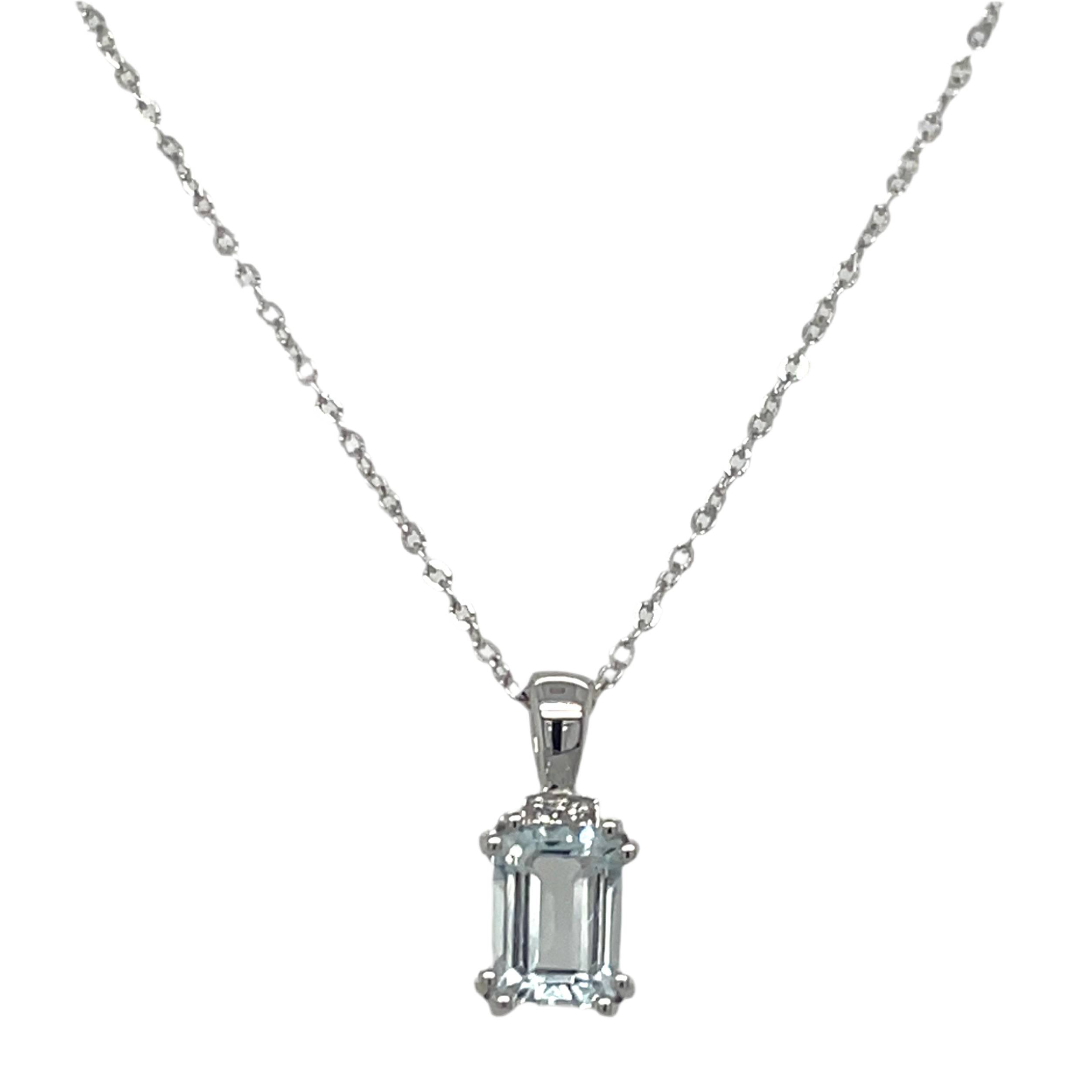 For those who love the hues of the sky and the sea or the more delicate colours of semi-precious stones - and especially for those who have this gem as their March birthstone. An octagonal cut Aquamarine is set into polished White Gold and strung on a fine matching White Gold chain. A hint of Diamond detail on the Pendant's bail adds the perfect, sparkling finishing touch.