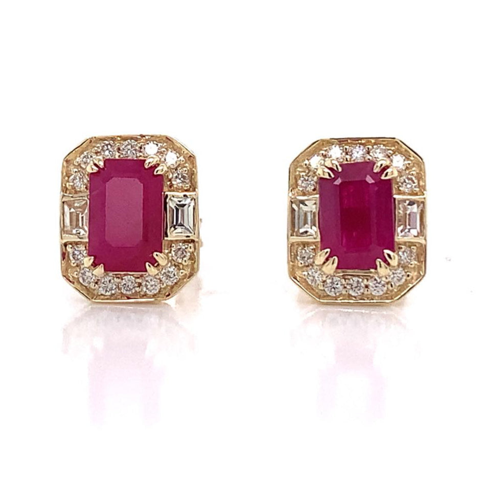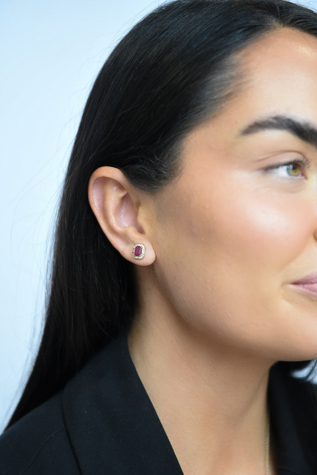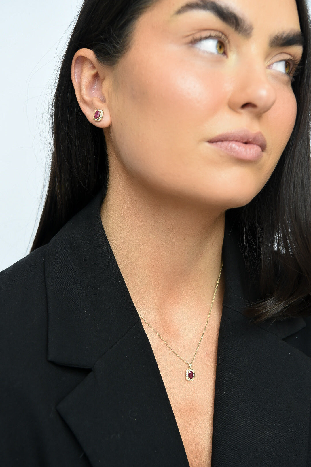 Crafted with 9ct yellow gold, this pendant and earring bundle showcases stunning earth grown rubies in an elegant emerald cut. Adorned by a sparkling halo of white sapphire and diamond, these pieces exude timeless sophistication and luxury. Elevate your look with this exquisite bundle at an amazing price.