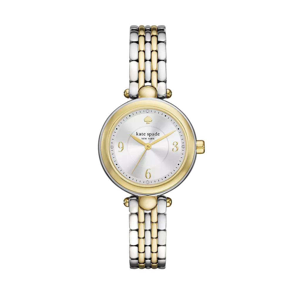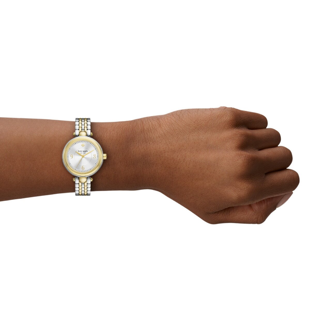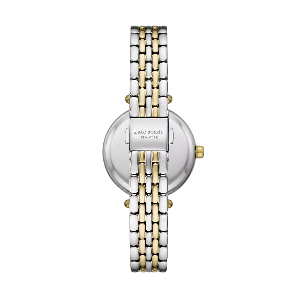 Introducing the Kate Spade New York Gracie Two-Tone Stainless Steel Watch. With a 32 mm case size and Quartz Three-Hand movement, this classic timepiece features a stylish two-tone stainless steel band in gold and silver. Elevate any outfit with this versatile and elegant accessory.