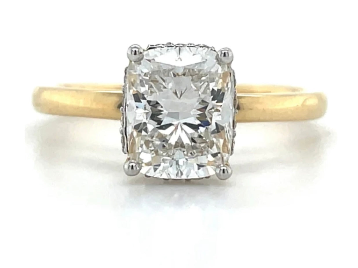 This 14CT yellow gold engagement ring features a 1.5ct IGI certified lab grown diamond in an elongated cushion cut, with a hidden halo design for added sparkle. Total carat weight is 1.57ct. Elevate your proposal with the brilliance of lab grown diamonds.
