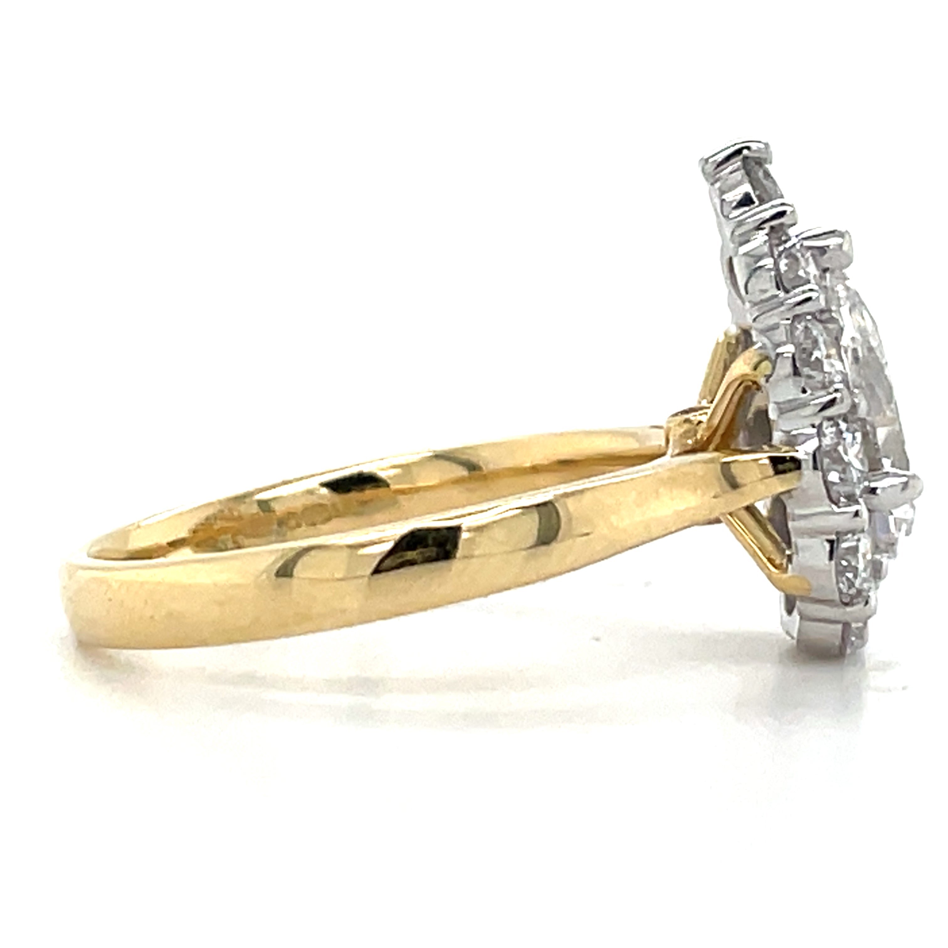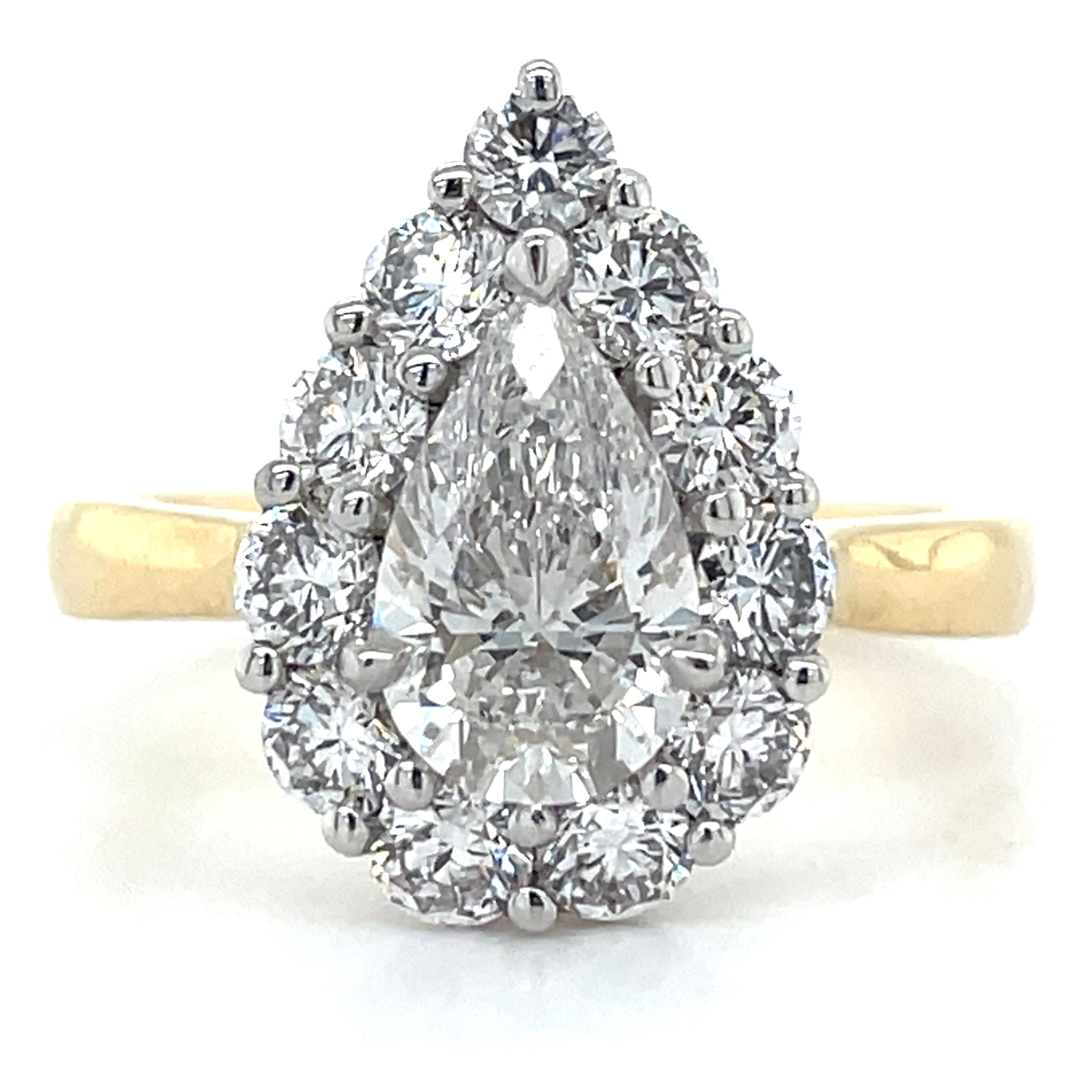 Elevate your style with the luxurious Lorraine ring. Set in 18ct yellow gold, the central 1.00ct pear diamond is surrounded by a halo of sparkling diamonds, with a total weight of 2.00ct. The platinum head ensures maximum brilliance for the diamonds. The centre stone is IGI Certified with the following: