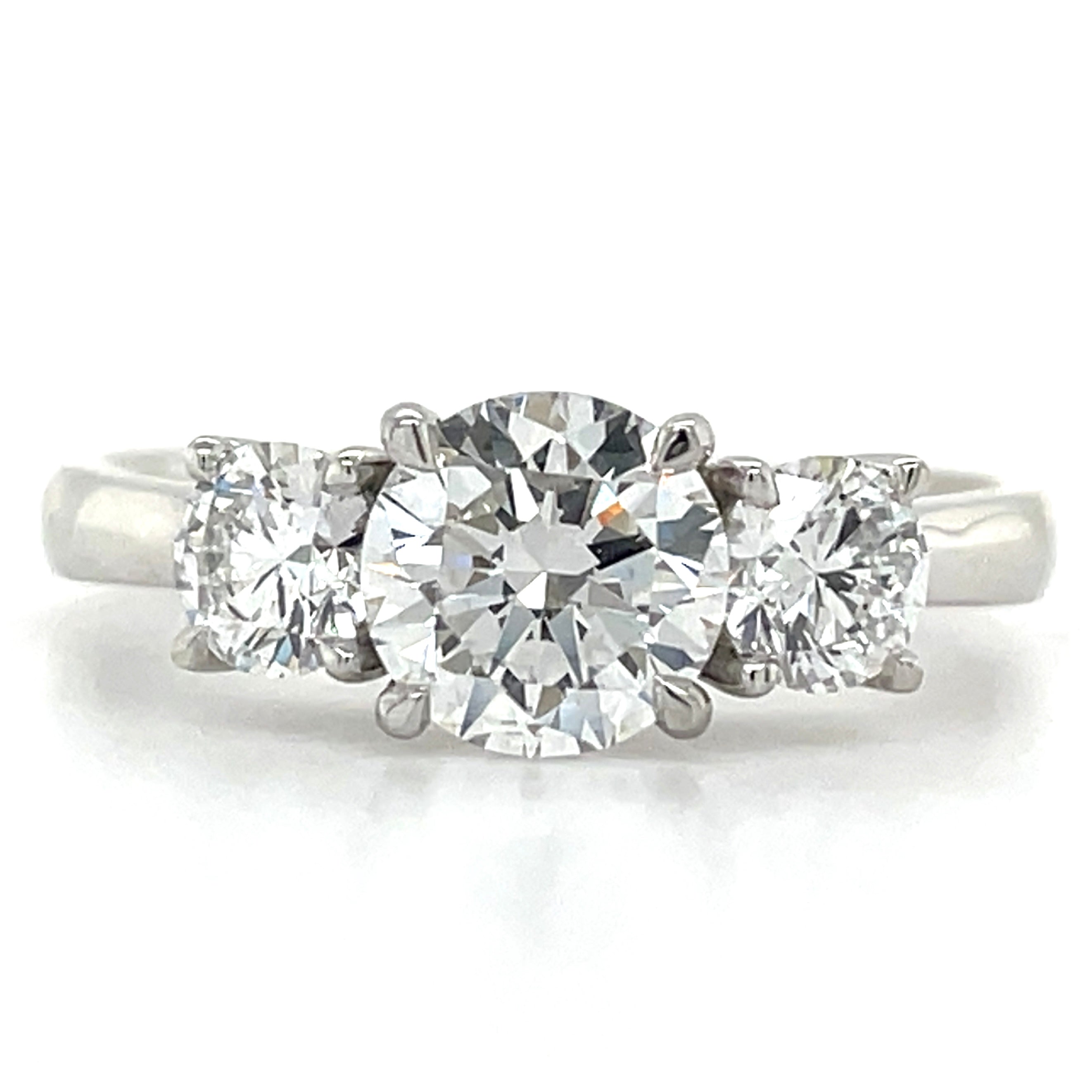 Featuring a timeless three-stone design, this platinum Phoebe engagement ring showcases 1.55 carats of laboratory-grown diamonds with exceptional brilliance and clarity. The classic setting celebrates the centre stone while the flanking diamonds add elegant symmetry and enhanced sparkle.
