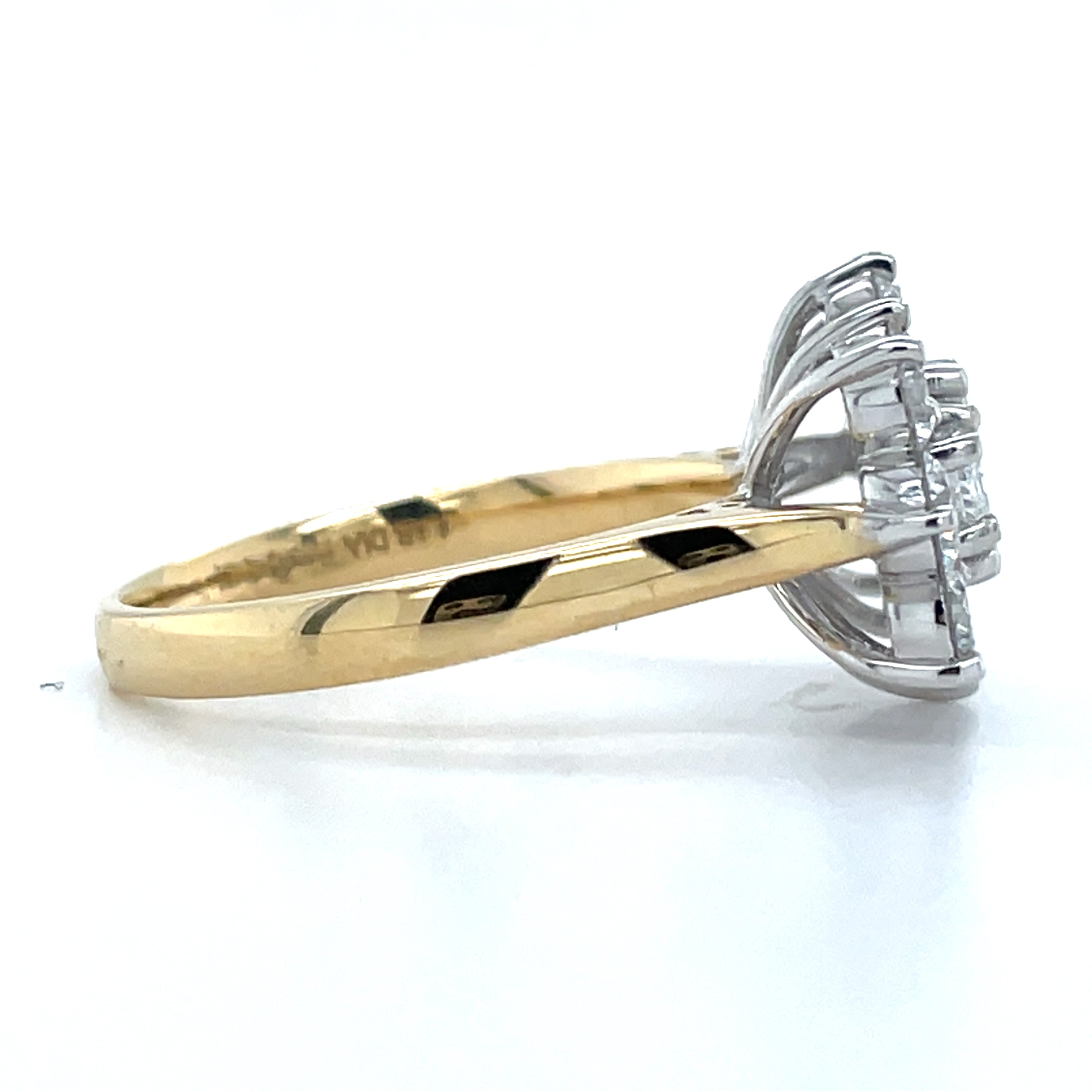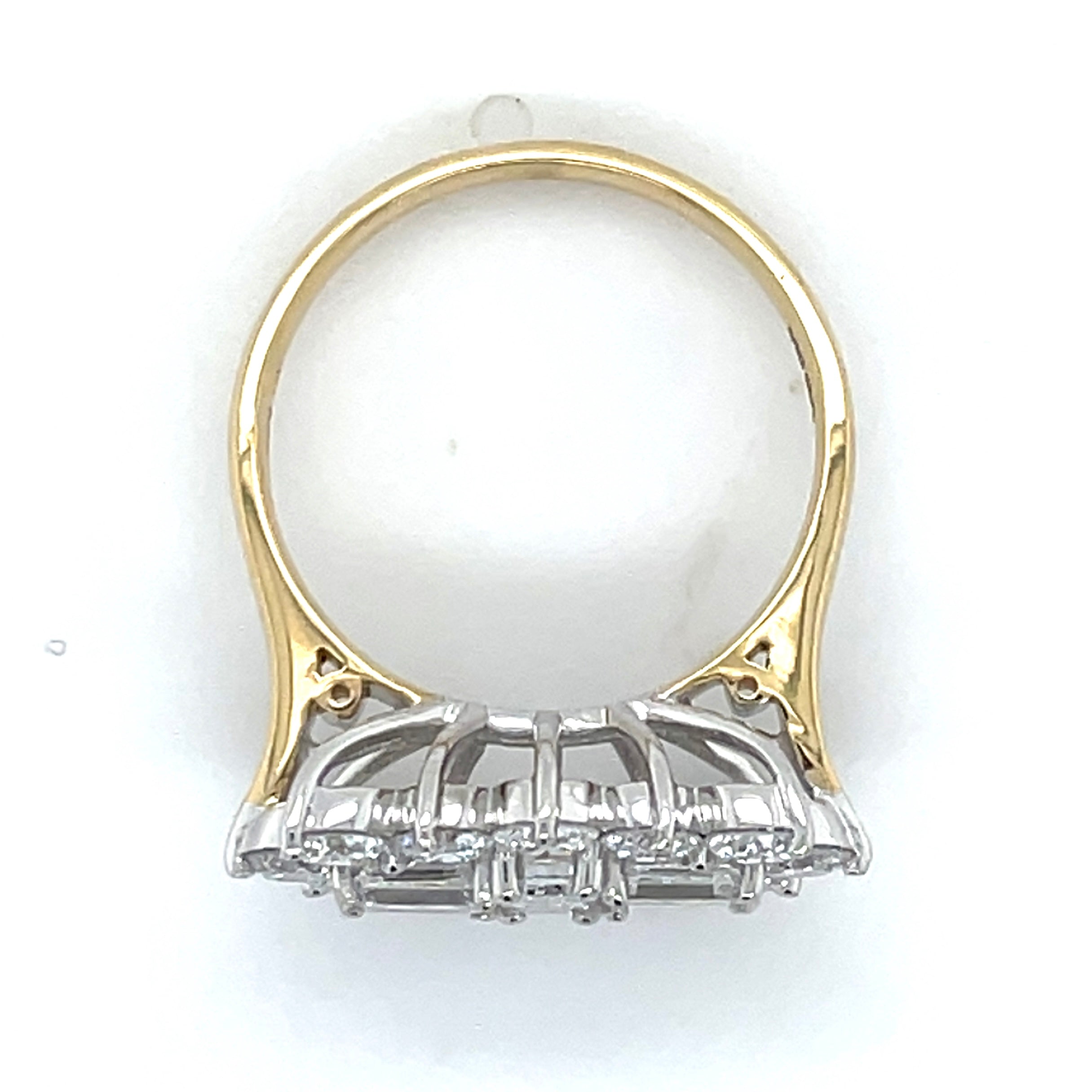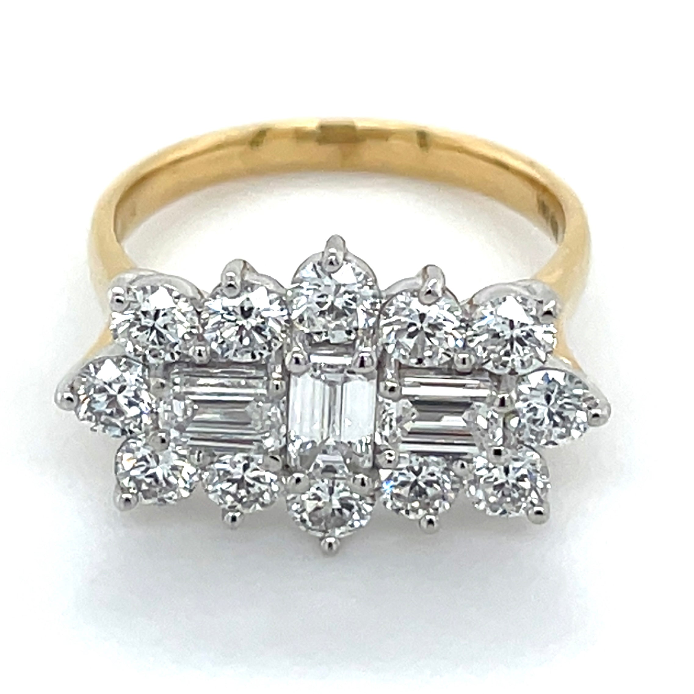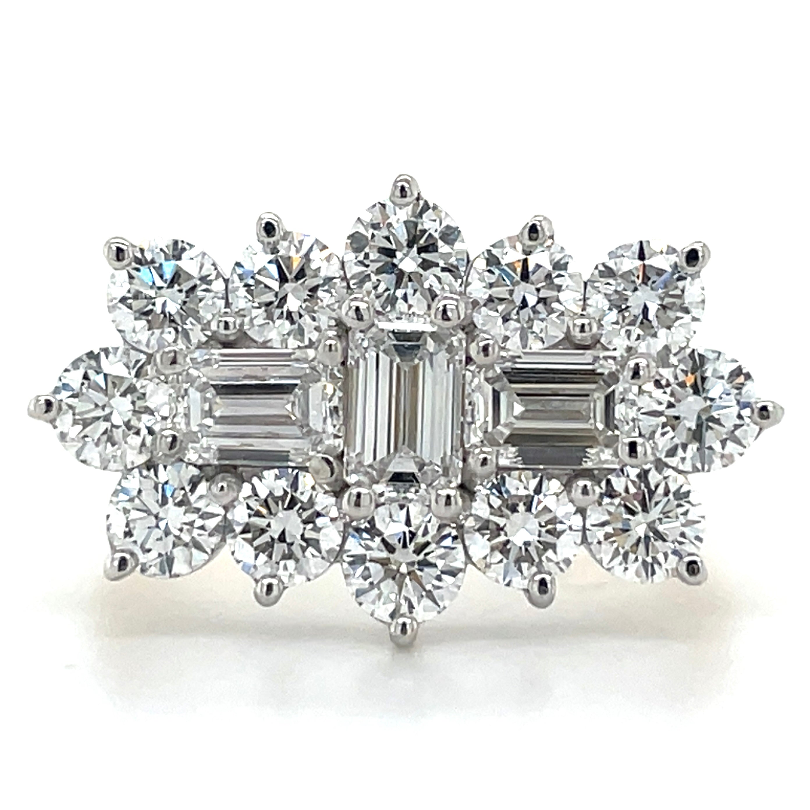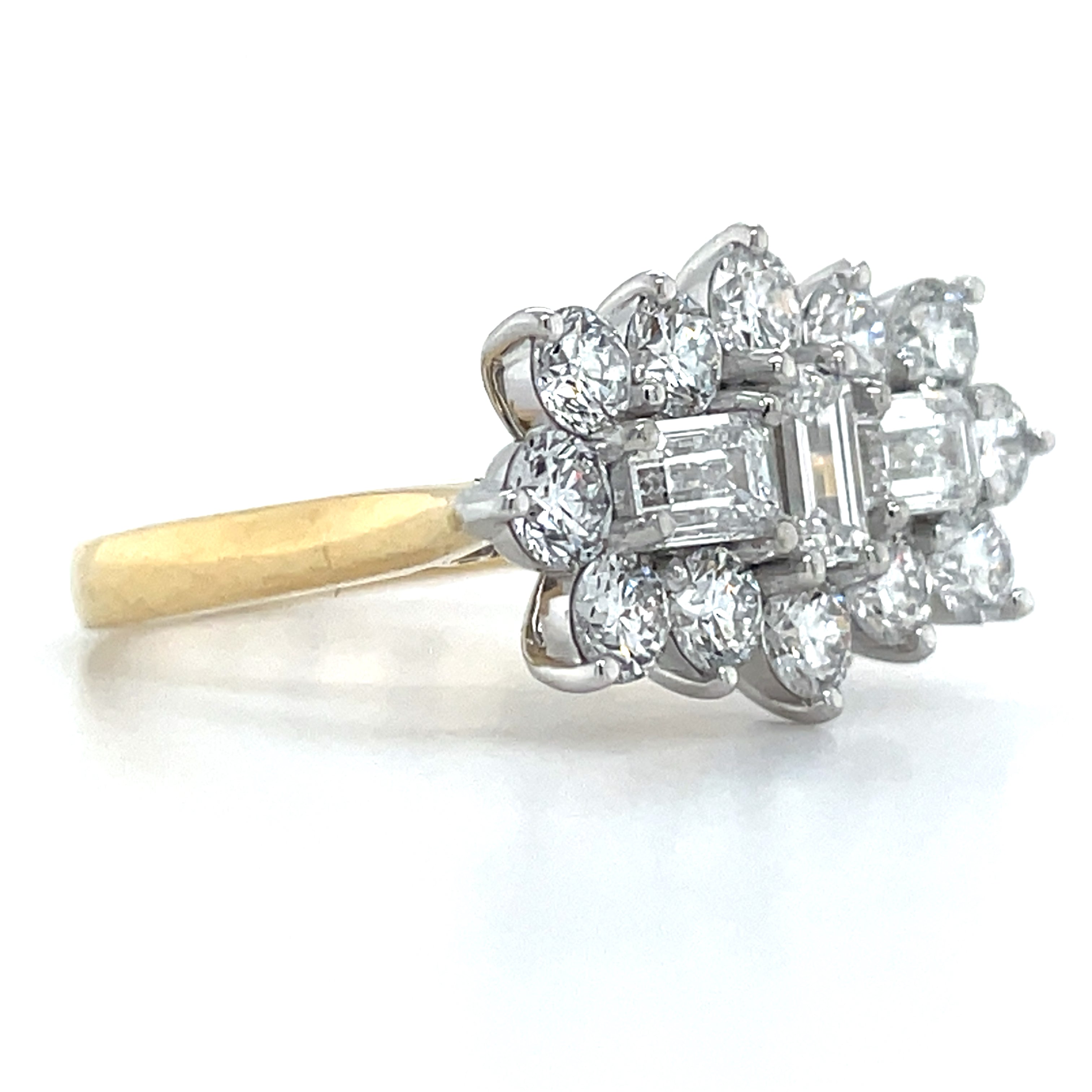 Featuring 2.37 carats of laboratory grown diamonds in VS clarity, this elegant cluster dress ring showcases three emerald cut diamonds surrounded by round brilliant diamonds secured by platinum claws. The warm lustre of the 18ct yellow gold band provides a classic foundation for this sophisticated piece.