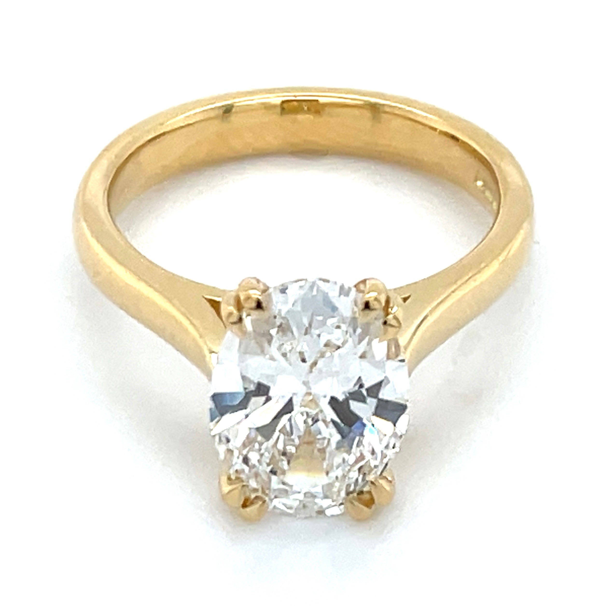 This stunning Caitlin solitaire features a magnificent 2.51ct laboratory-grown oval cut diamond, renowned for its sophisticated sparkle. Set in luxurious 18ct yellow gold, this engagement ring combines timeless elegance with contemporary craftsmanship. The centre stone is IGI Certified with the following: