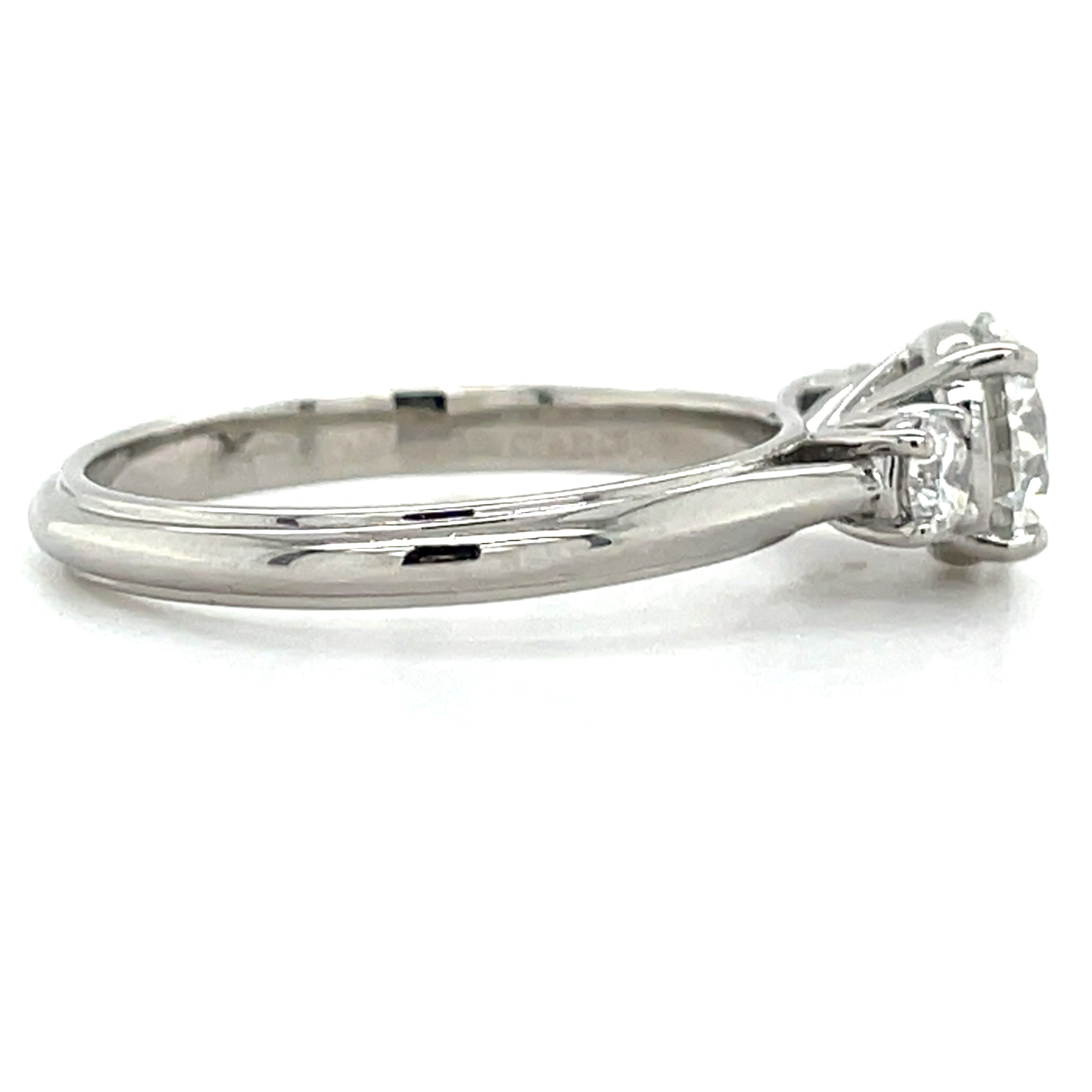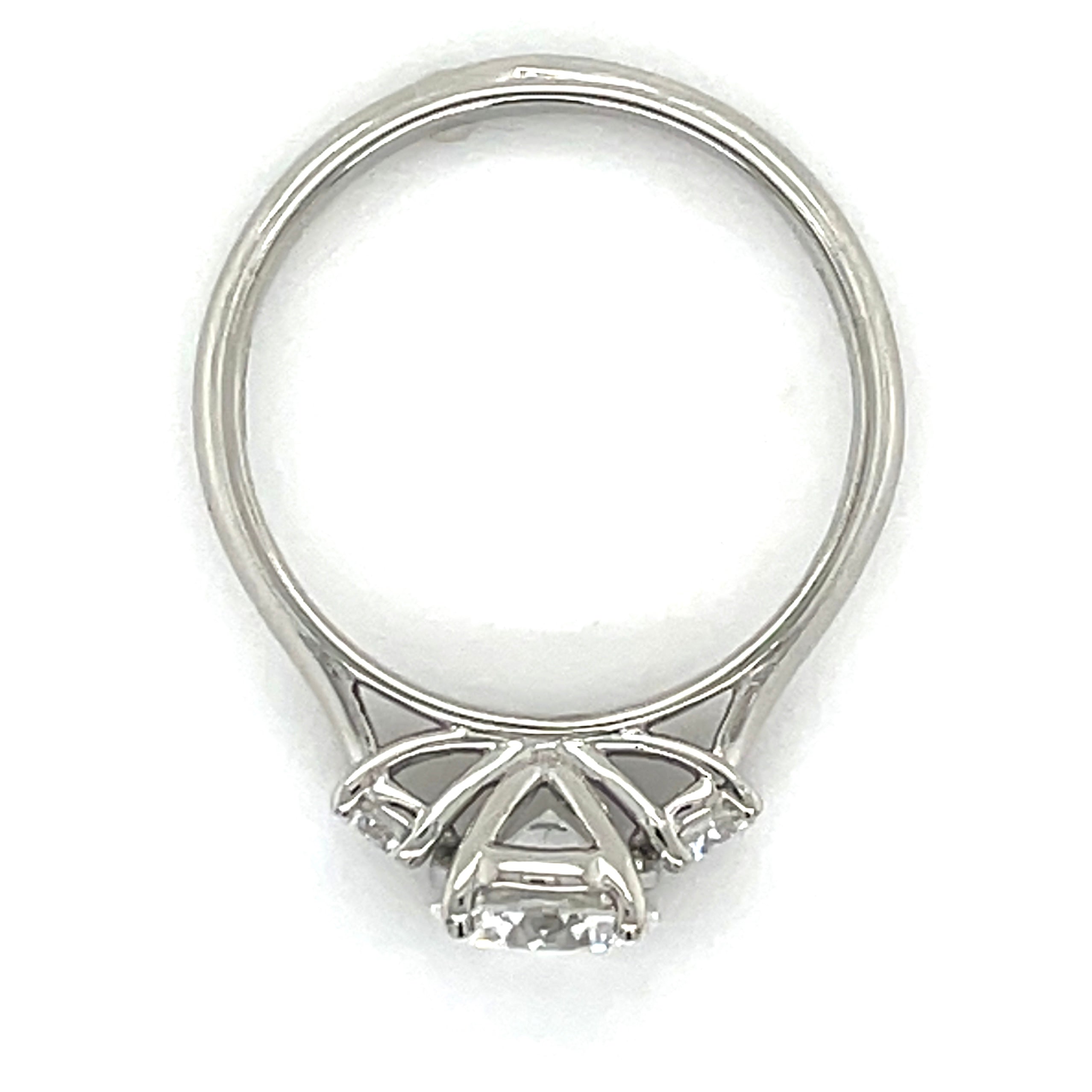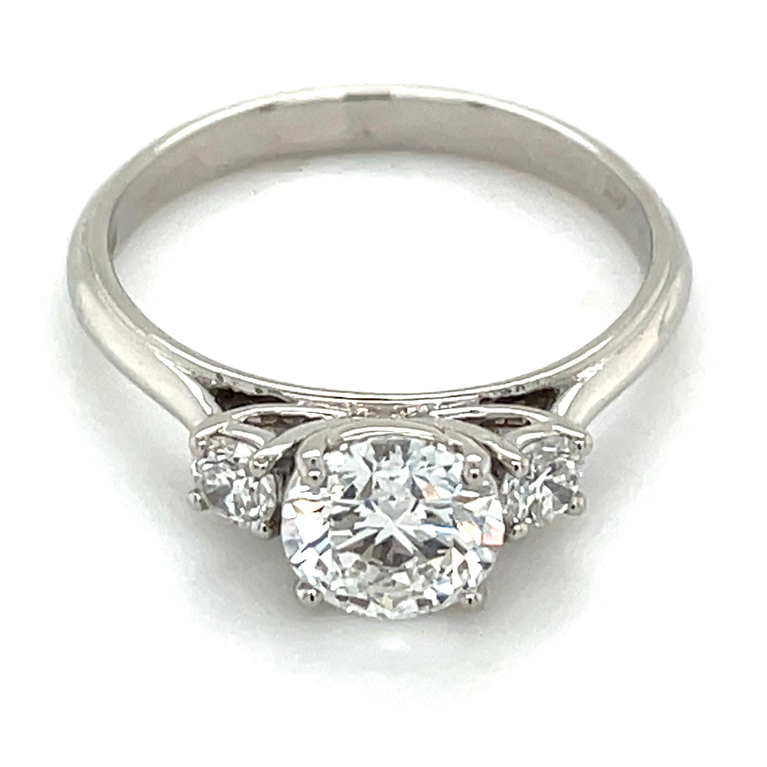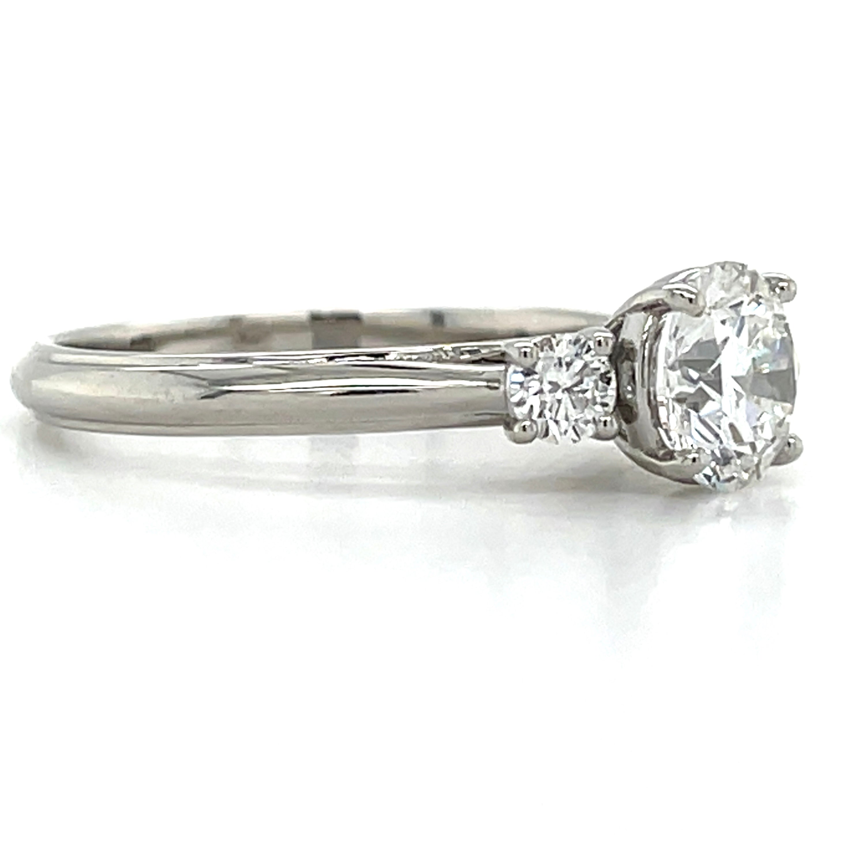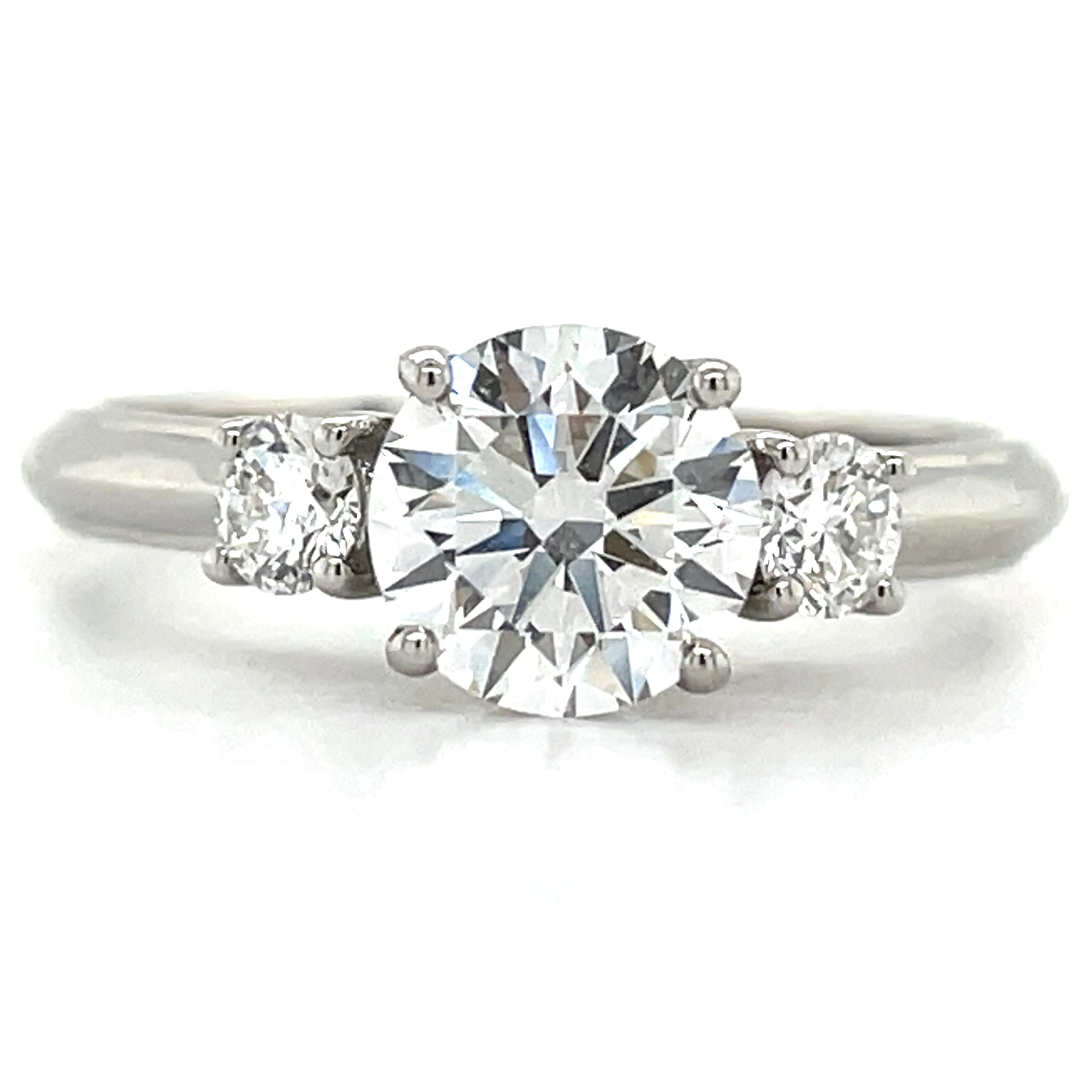 Expertly crafted from platinum, the Anna three stone round brilliant diamond ring boasts a sparkling 1.01ct IGI Certified center laboratory-grown diamond. Total diamond weight is 1.23ct. This ring is superior quality and a timeless choice for any special occasion.