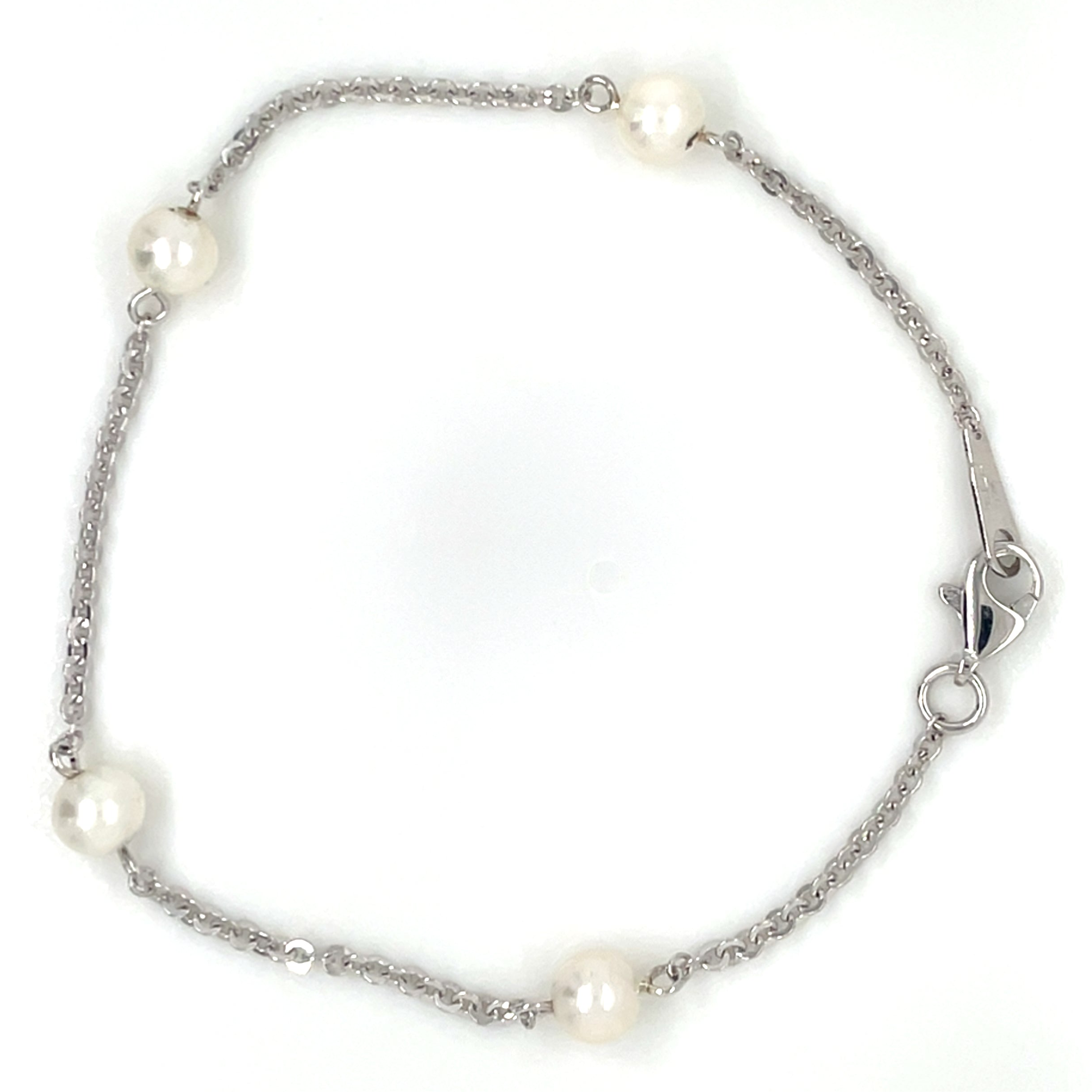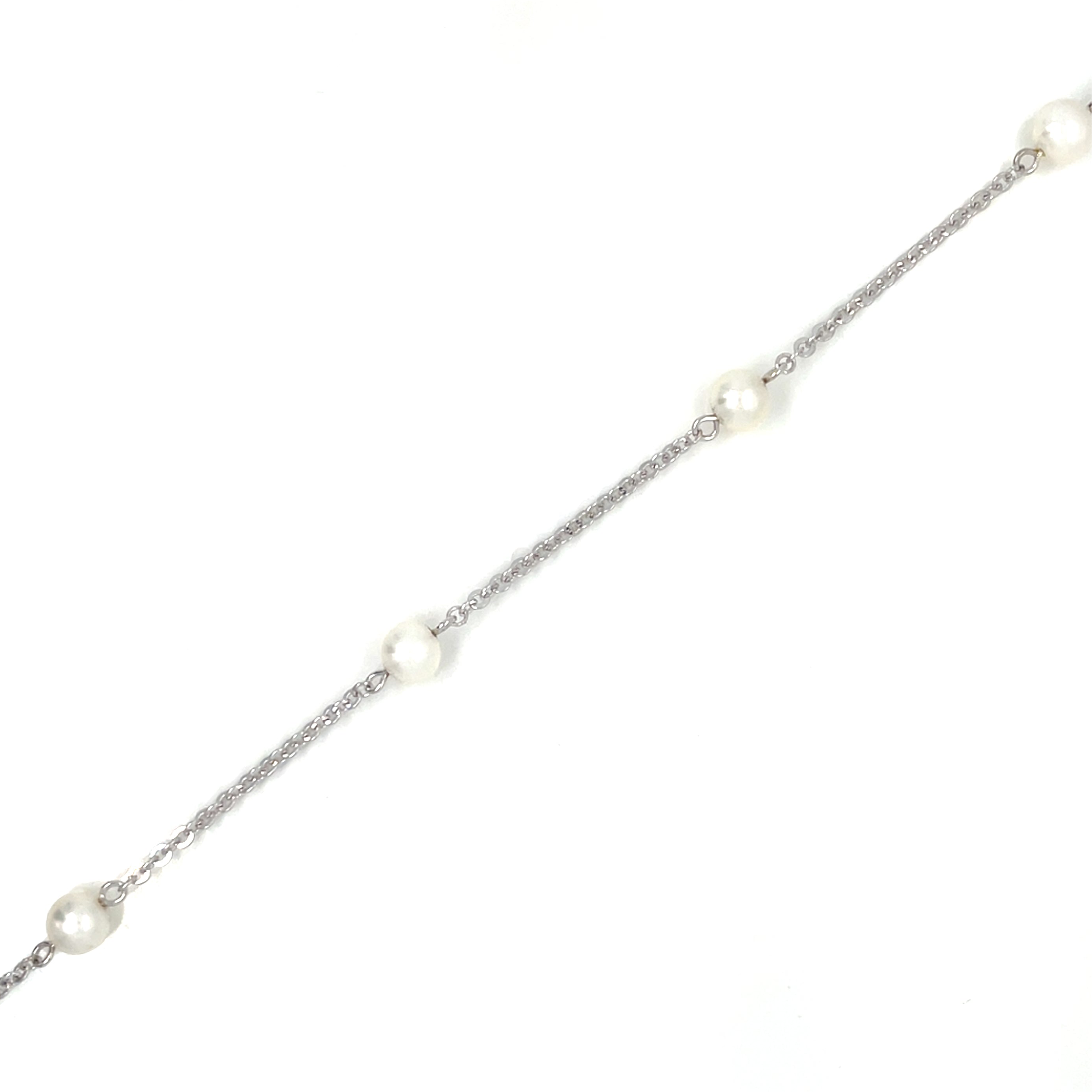 This exquisite 9ct white gold bracelet is a stunning addition to any outfit. Adorned with delicate pearls along its 18cm length, it exudes elegance and sophistication. Crafted with care, it is the perfect piece for any occasion.