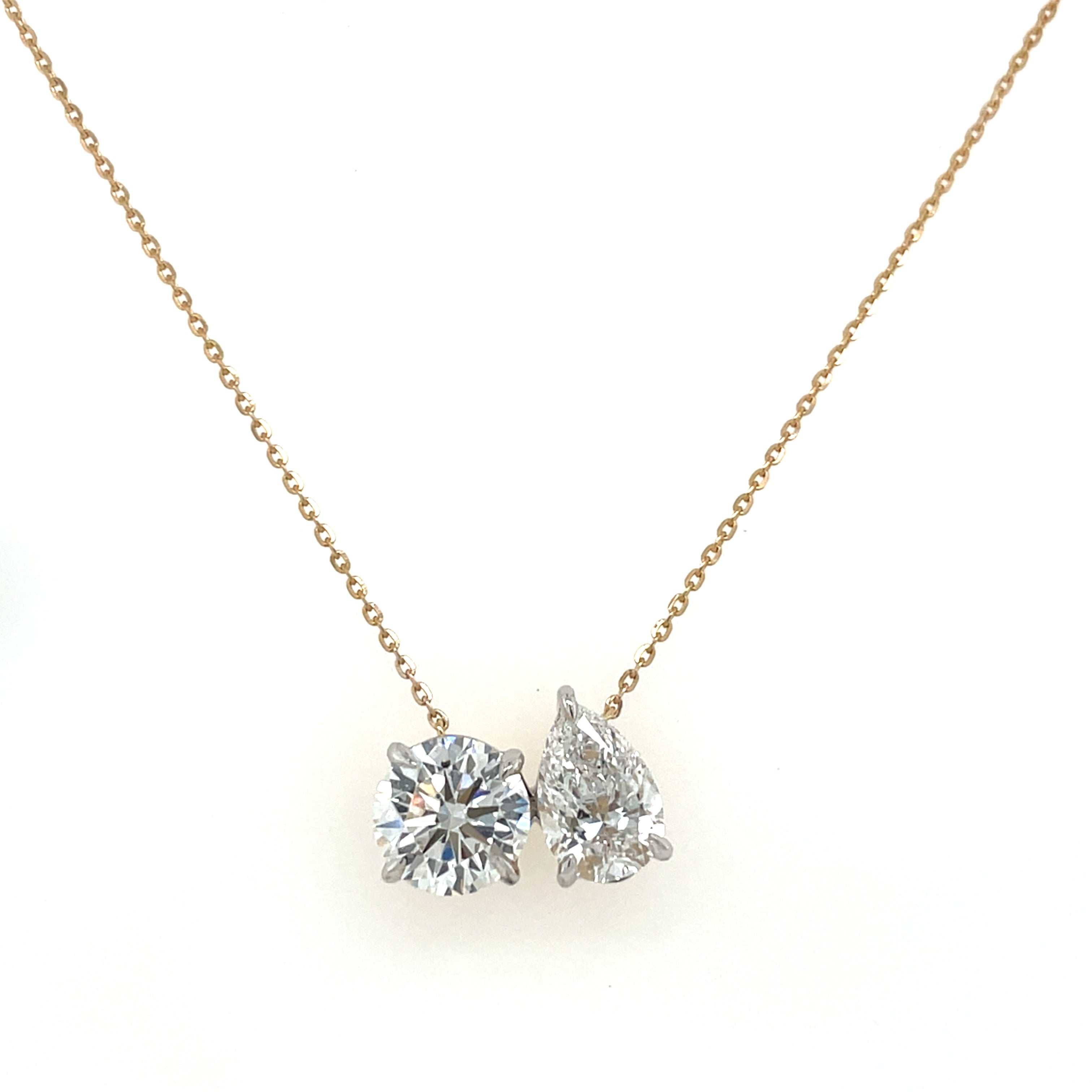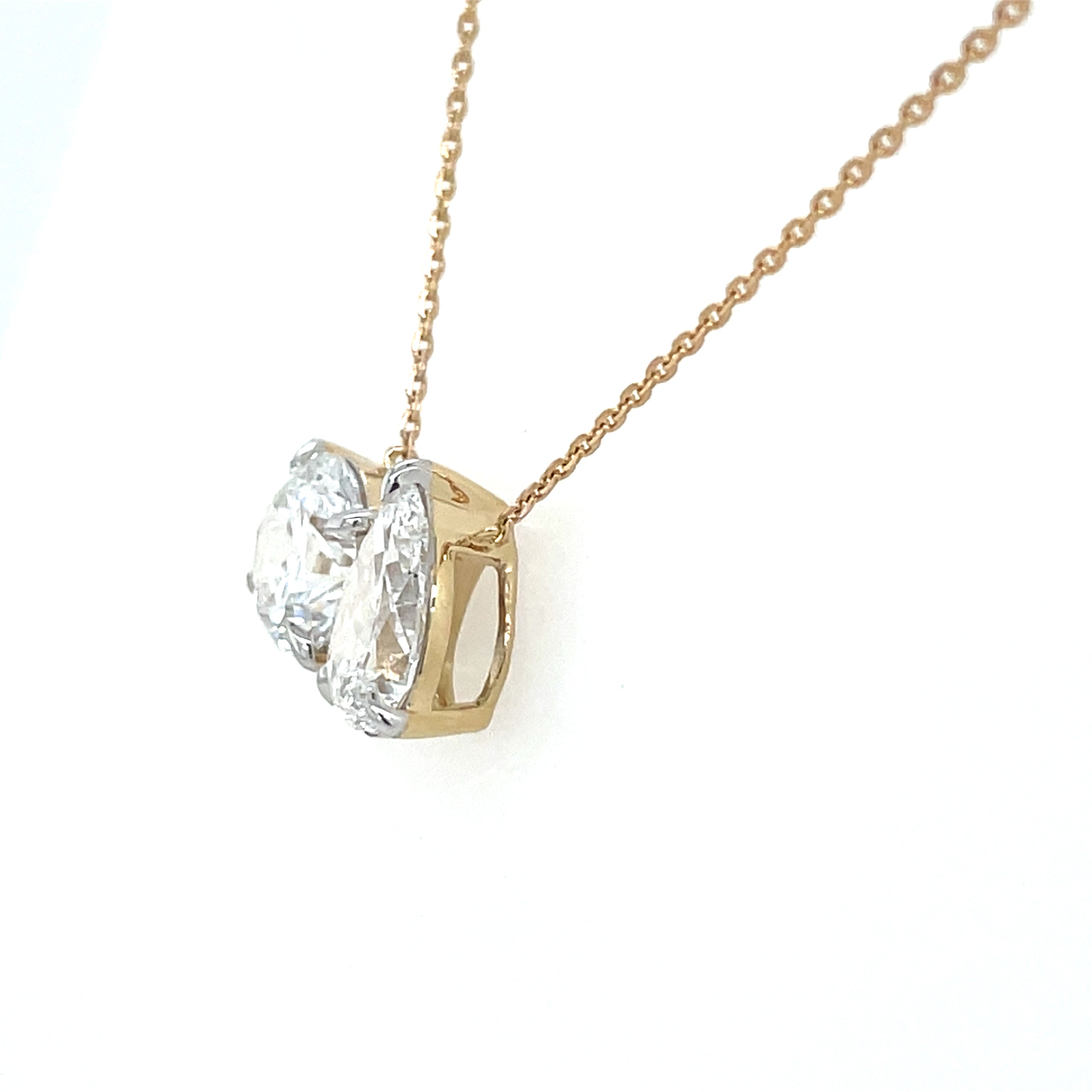 9ct yellow gold toi et moi necklace. 18 inch chain with an adjustment at 17 and 16 inches. the round and pear laboratory grown diamonds total 2.60ct / 2.61ct. The round diamond is IGI Certified with the following grades: