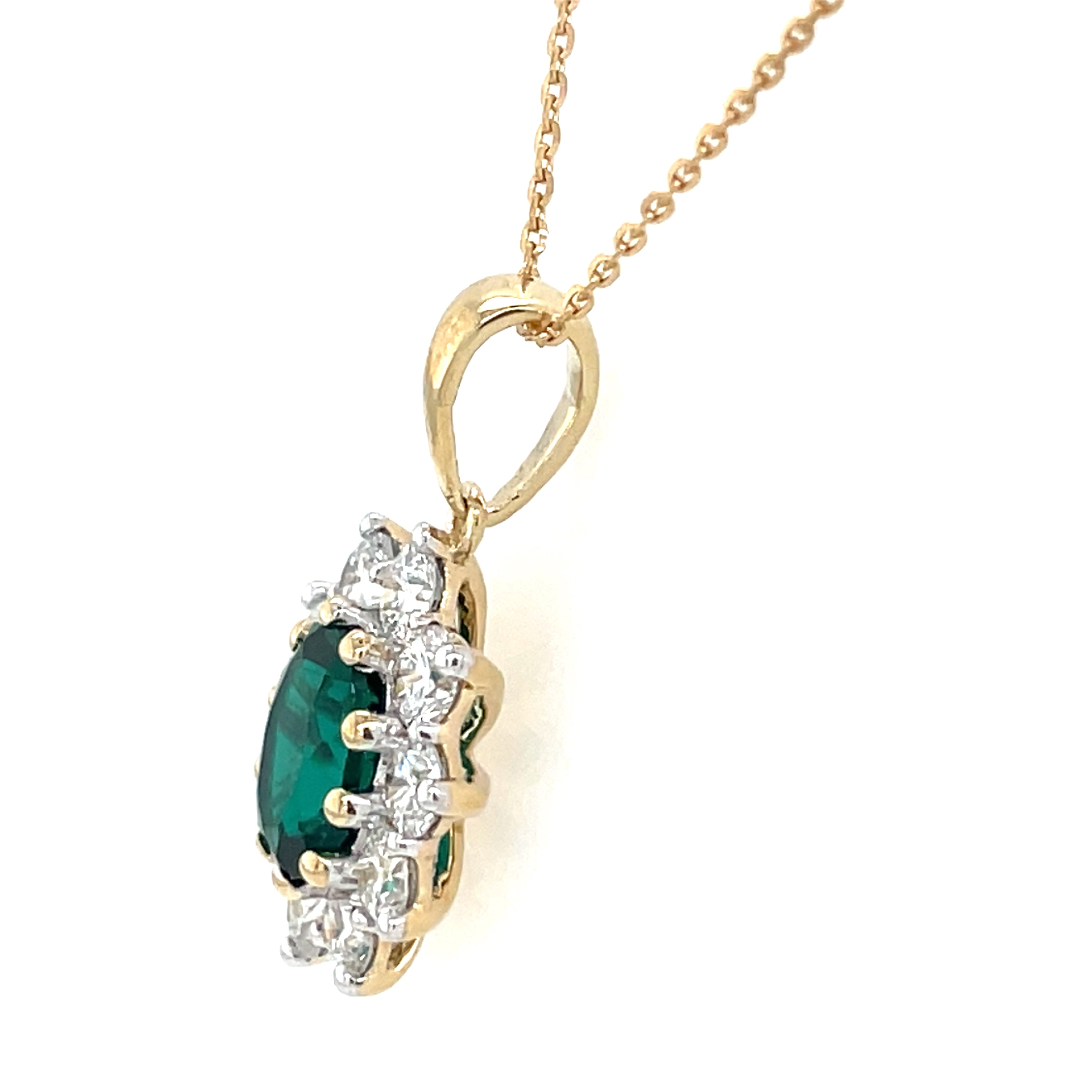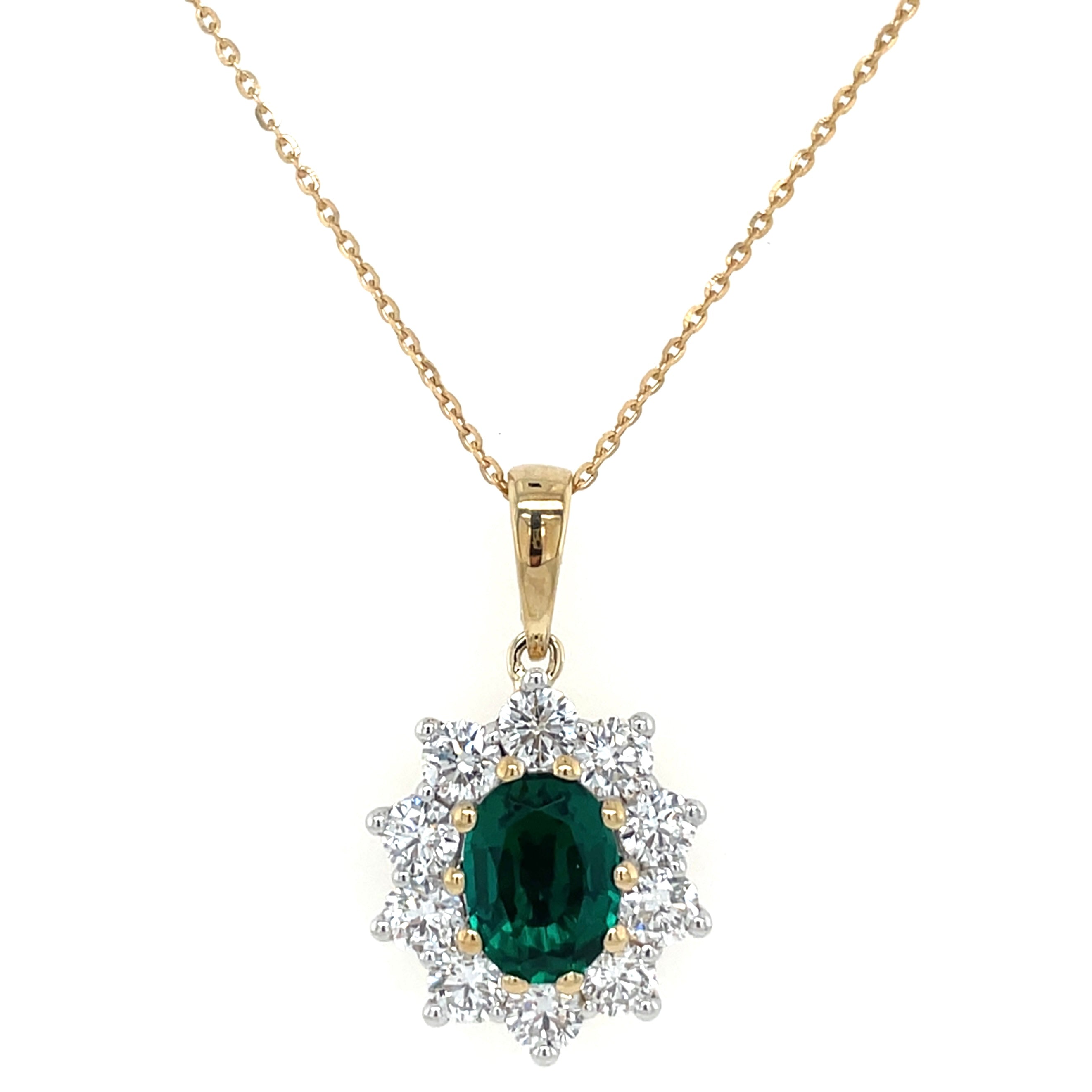 This stunning 9ct yellow gold pendant features a magnificent 1.17ct laboratory-grown oval cut emerald as its centrepiece, radiating deep, rich colour. Surrounded by a brilliant 1.08ct halo of laboratory-grown round diamonds, this pendant combines timeless elegance with the colourful choice of laboratory-created gemstones. The chain is 18 inches with adjustments at 17 and 16 inches.
