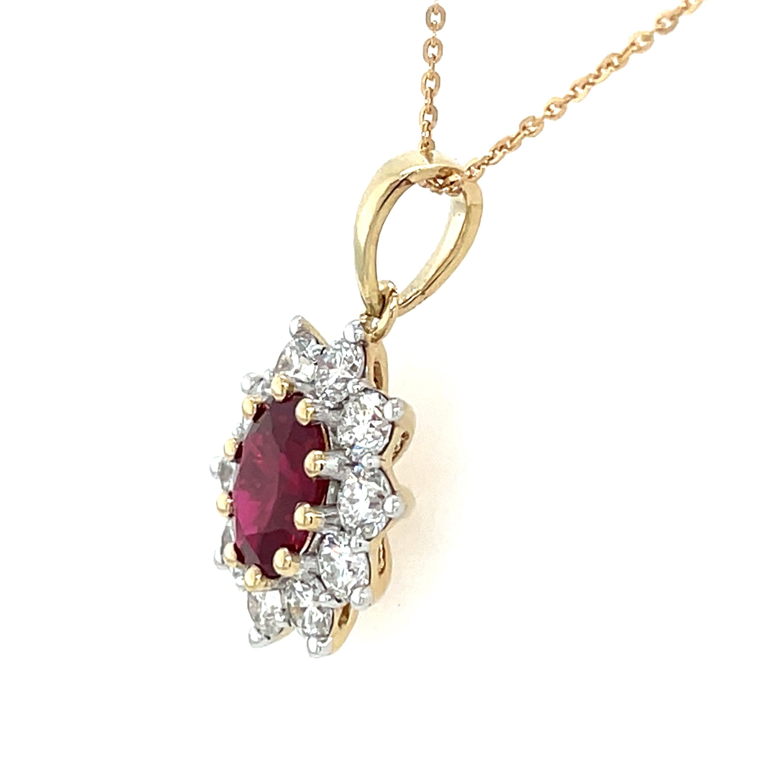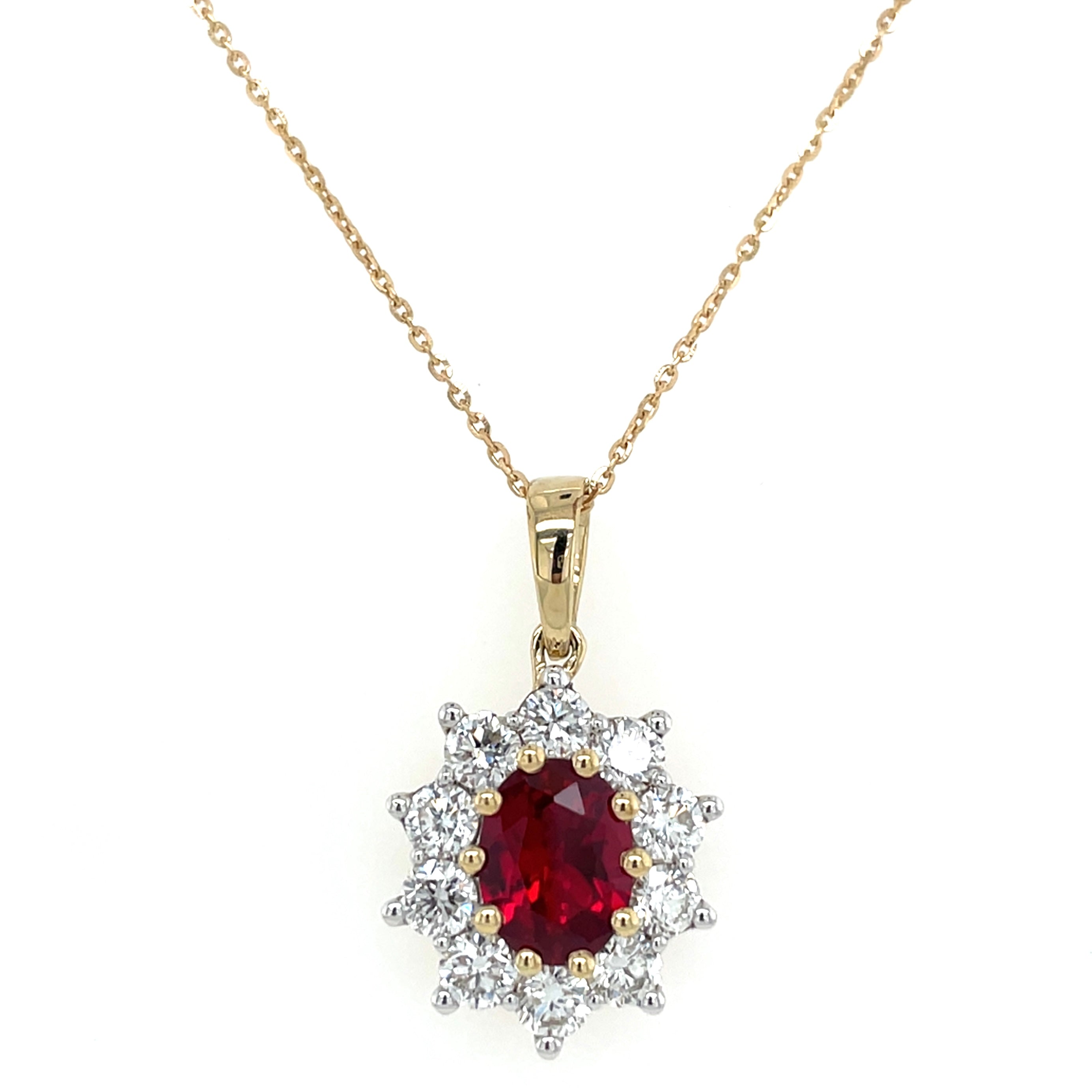 This stunning 9ct yellow gold pendant features a magnificent 1.34ct laboratory-grown oval cut ruby as its centrepiece, radiating deep, rich colour. Surrounded by a brilliant 1.05ct halo of laboratory-grown round diamonds, this pendant combines timeless elegance with the colourful choice of laboratory-created gemstones. The chain is 18 inches with adjustments at 17 and 16 inches.