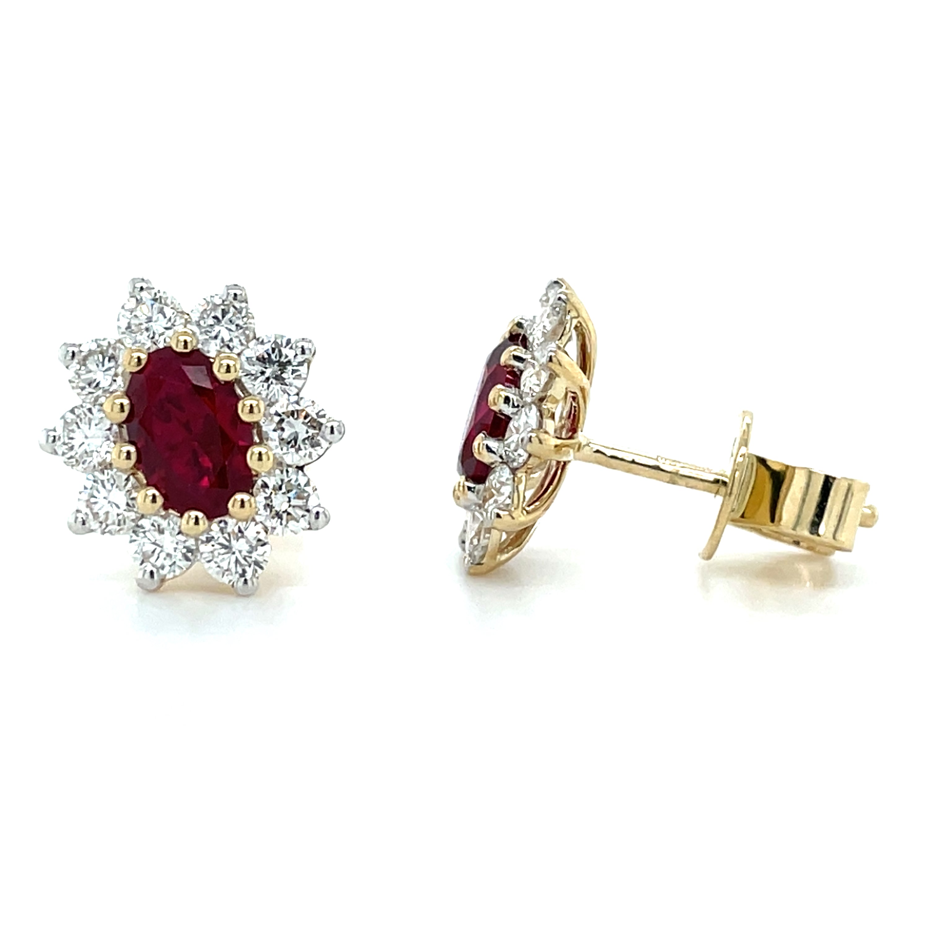Crafted in 9ct yellow gold, these elegant stud earrings feature a stunning laboratory-grown 0.475ct ruby at the centre, surrounded by a sparkling halo of 0.47ct laboratory-grown diamonds for added brilliance. Secured with reliable butterfly backs, they offer timeless sophistication.